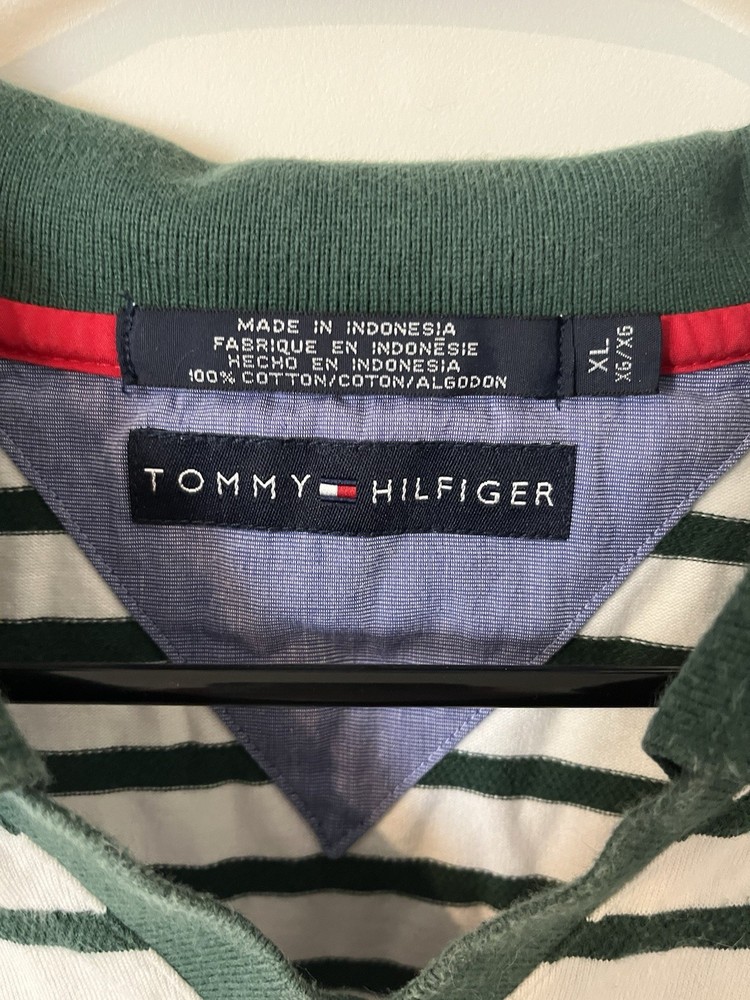 Elevate your casual wardrobe with the classic style of a vintage Tommy Hilfiger men's polo shirt. This time-honored piece features a crisp white and green striped pattern, short sleeves, and a traditional collared neckline with a three-button closure that adds a touch of sophistication. Crafted from 100% cotton, this polo shirt ensures breathable comfort and easy care, making it a versatile addition to your wardrobe for all seasons. The shirt comes in a size XL with a regular fit that's perfect for a relaxed yet polished look. Embroidered with the iconic Tommy Hilfiger logo, it’s a subtle nod to the brand’s premium quality. Whether you're hitting the golf course or enjoying a casual day out, this polo shirt is designed to meet the needs of both performance and style.