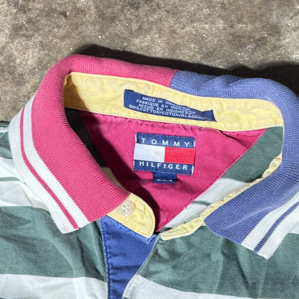 The product is a vintage Tommy Hilfiger polo shirt in size medium. It is a classic men's polo with a regular fit and medium fabric wash, featuring the iconic Tommy Hilfiger character. The shirt comes in a multicolor design, adding a stylish touch to any man's wardrobe. Perfect for casual or semi-casual occasions, this Tommy Hilfiger polo shirt is a timeless piece that embodies quality and sophistication.