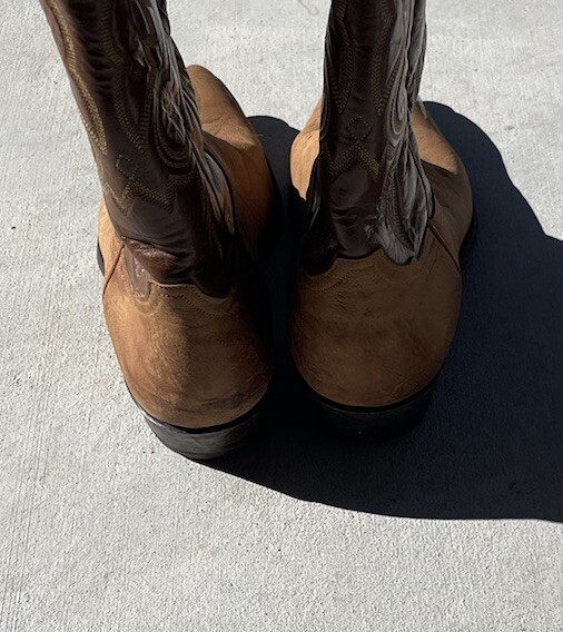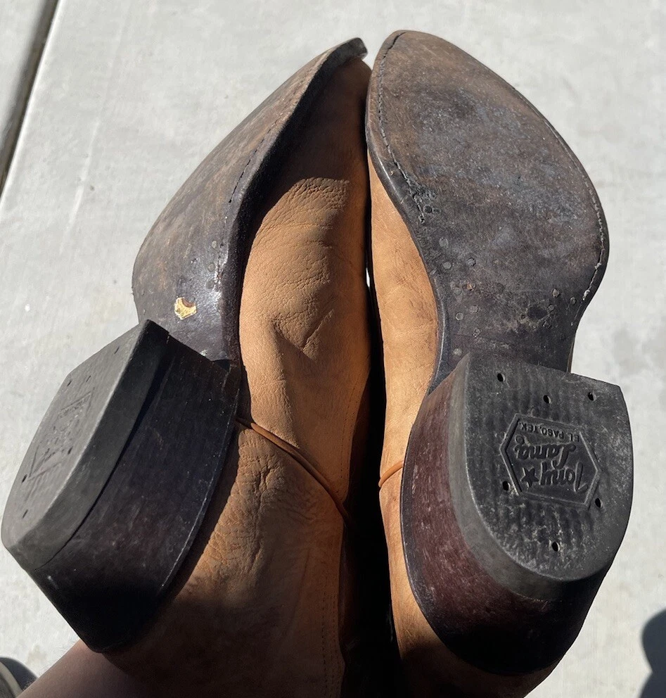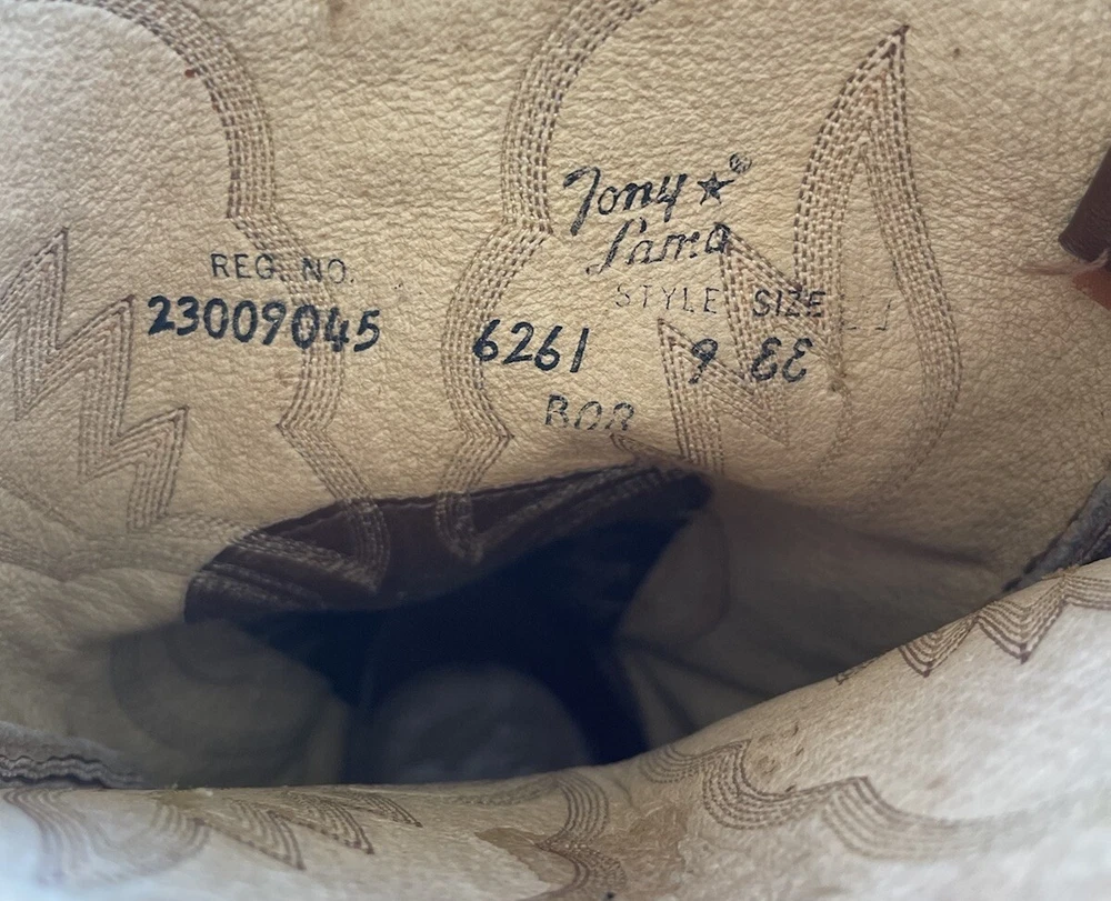 These vintage Tony Lama leather cowboy boots are a true gem for any western enthusiast. The dark brown and tan color combination, along with the men's size 9 fit, make them a perfect addition to any cowboy's wardrobe. The boots' outsole and upper material are both made of high-quality leather, ensuring both durability and style. The boots' brand, department, type, and model are all Tony Lama, men's, boots, and 1980s respectively. Their style is western, with a cowboy theme, and they were manufactured in the United States. These boots are perfect for anyone looking to add a touch of vintage style to their wardrobe.
