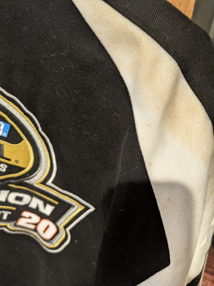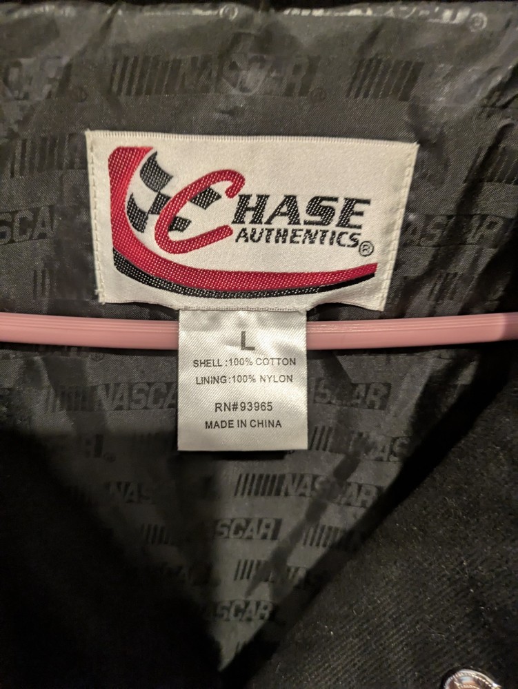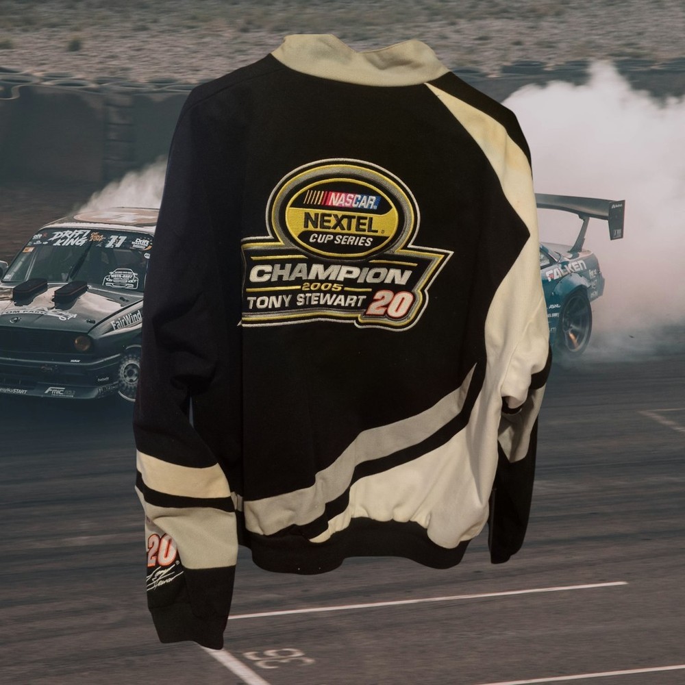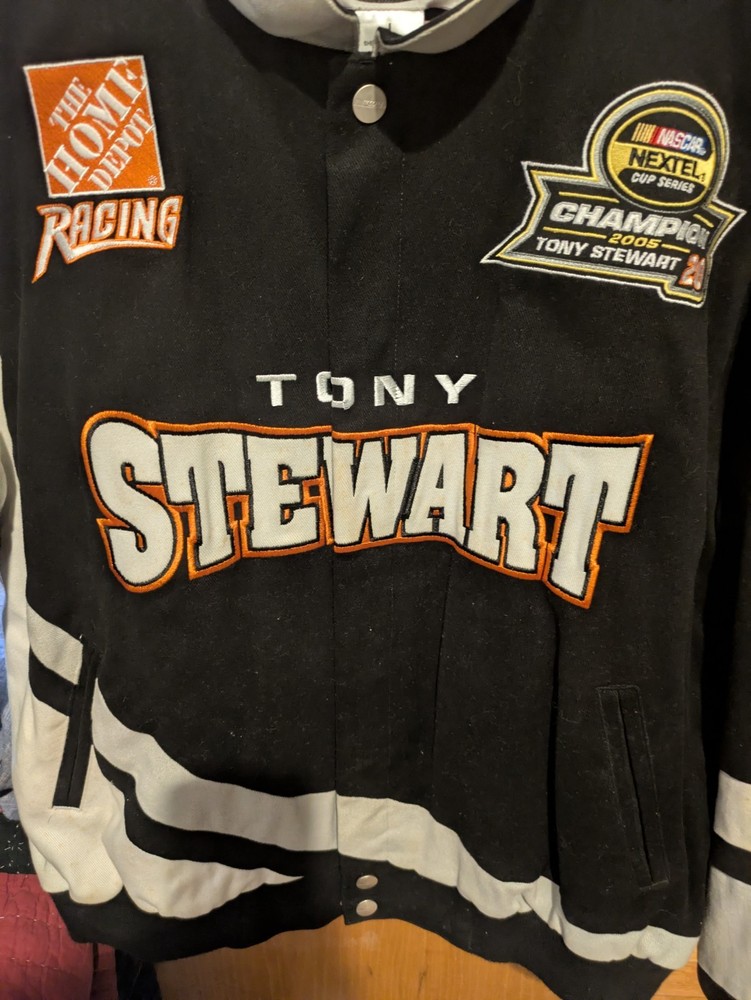 The product is a vintage Tony Stewart Chase Authentics jacket, inspired by The Home Depot Nascar Racing team. It is officially licensed and features the driver's name and team, Joe Gibbs Racing. The jacket is designed for men and comes in size large, with a multi-color design specific to auto racing. This fan apparel is a must-have for any Tony Stewart or NASCAR racing enthusiast looking to show their support for the team and driver. minor staining as shown