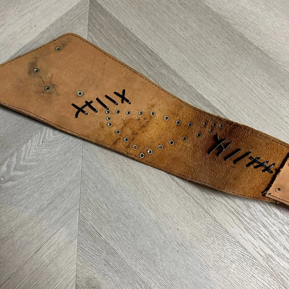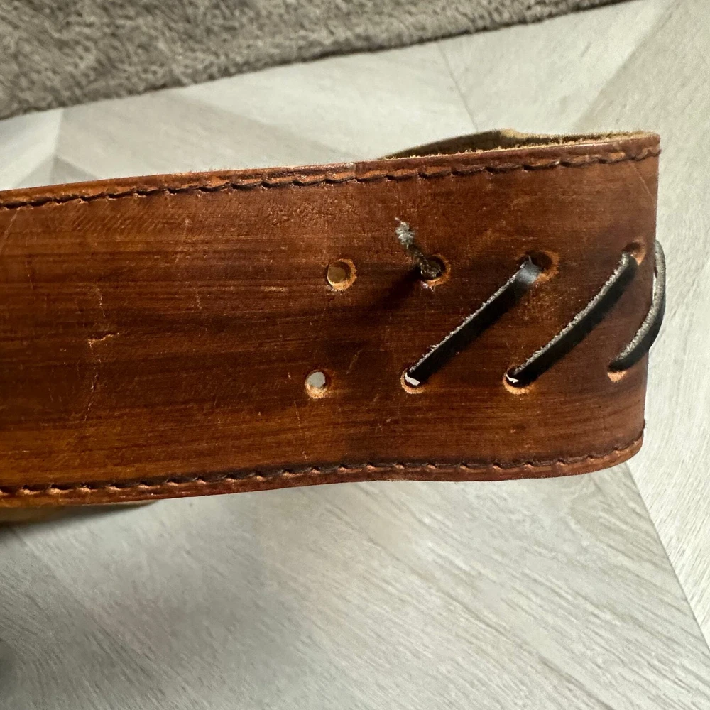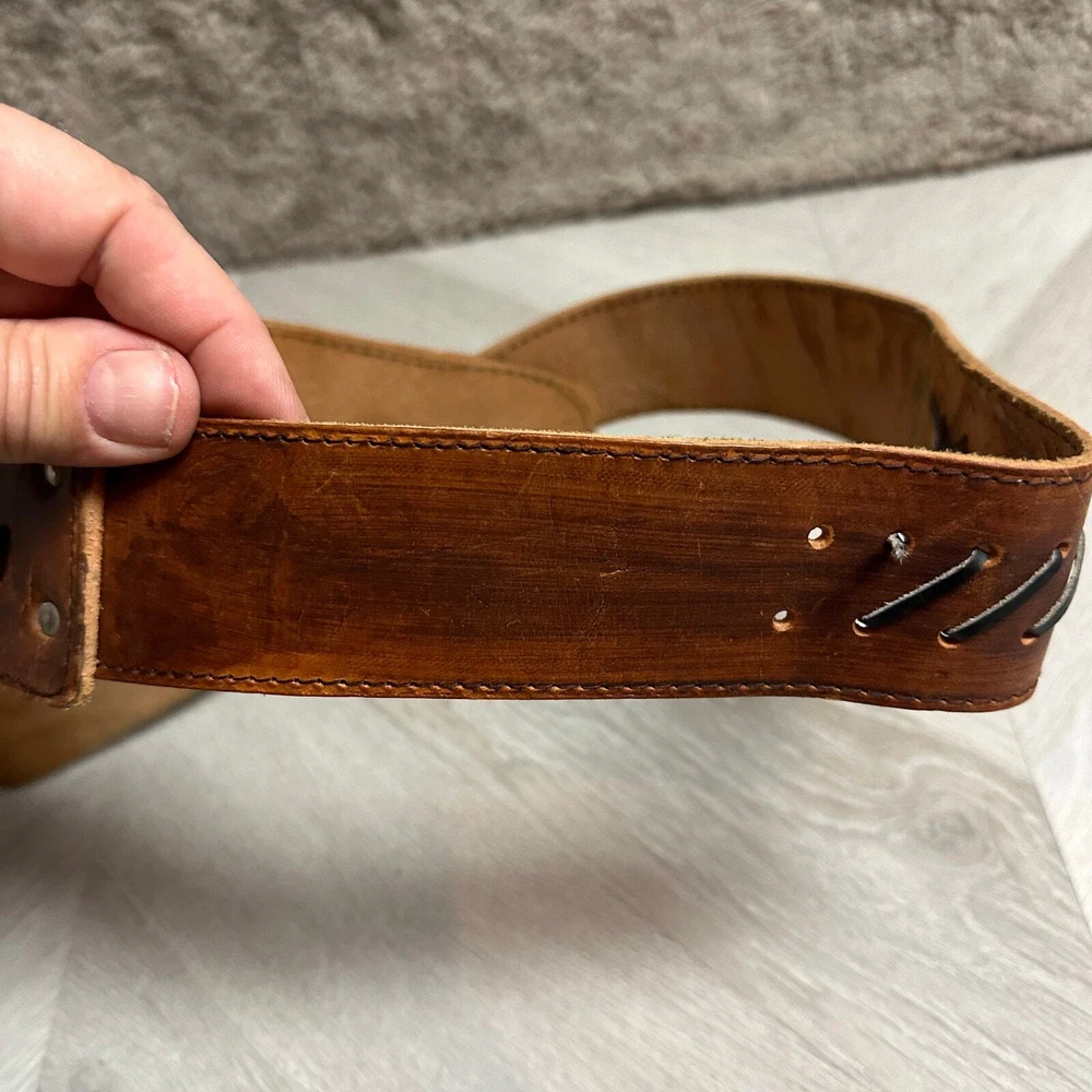 Vintage Tooled Brown Leather Crossover Belt Criss Cross Western Montana Yellowstone Moroccan Asymmetrical Gorgeous belt with unique details. It's in overall great shape but at one set of leather stitches the leather string has broken midway... could be replaced, or worn as is, does not affect function of the belt. See photos for details and other signs of wear. Total length without buckle: ~40". Other measurements in photos.