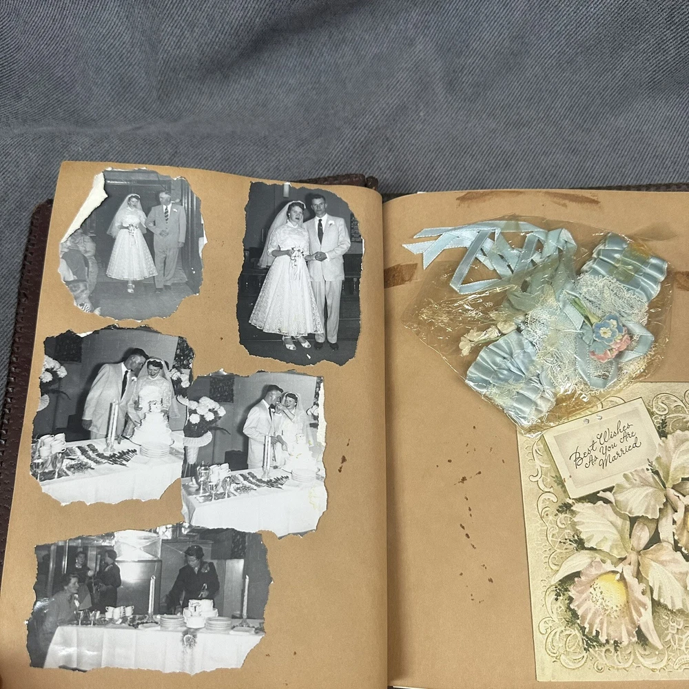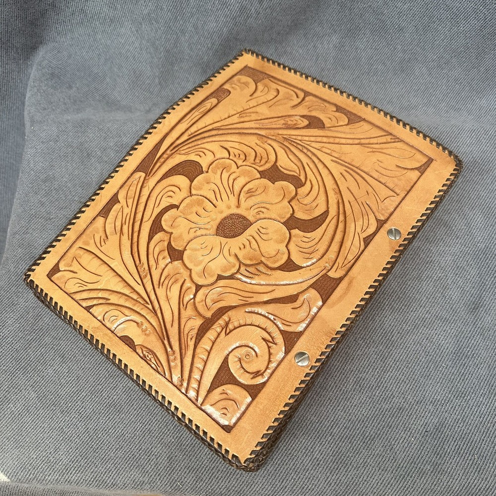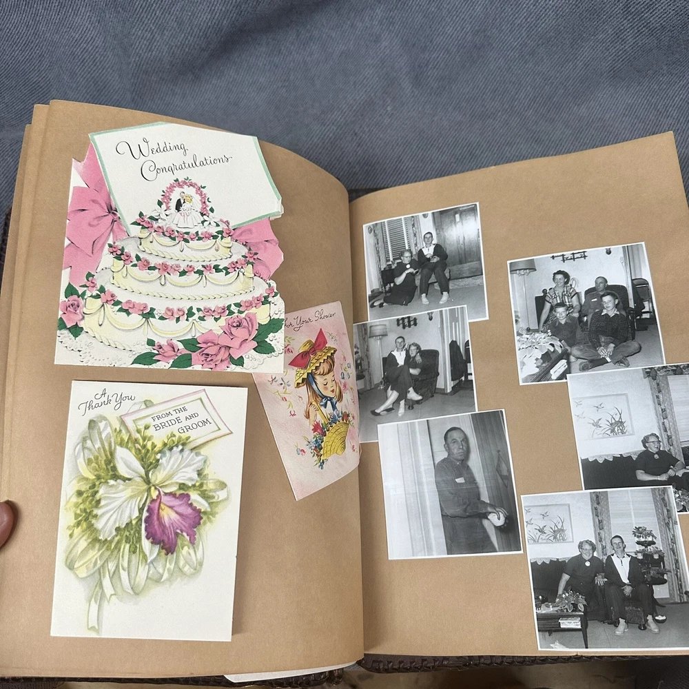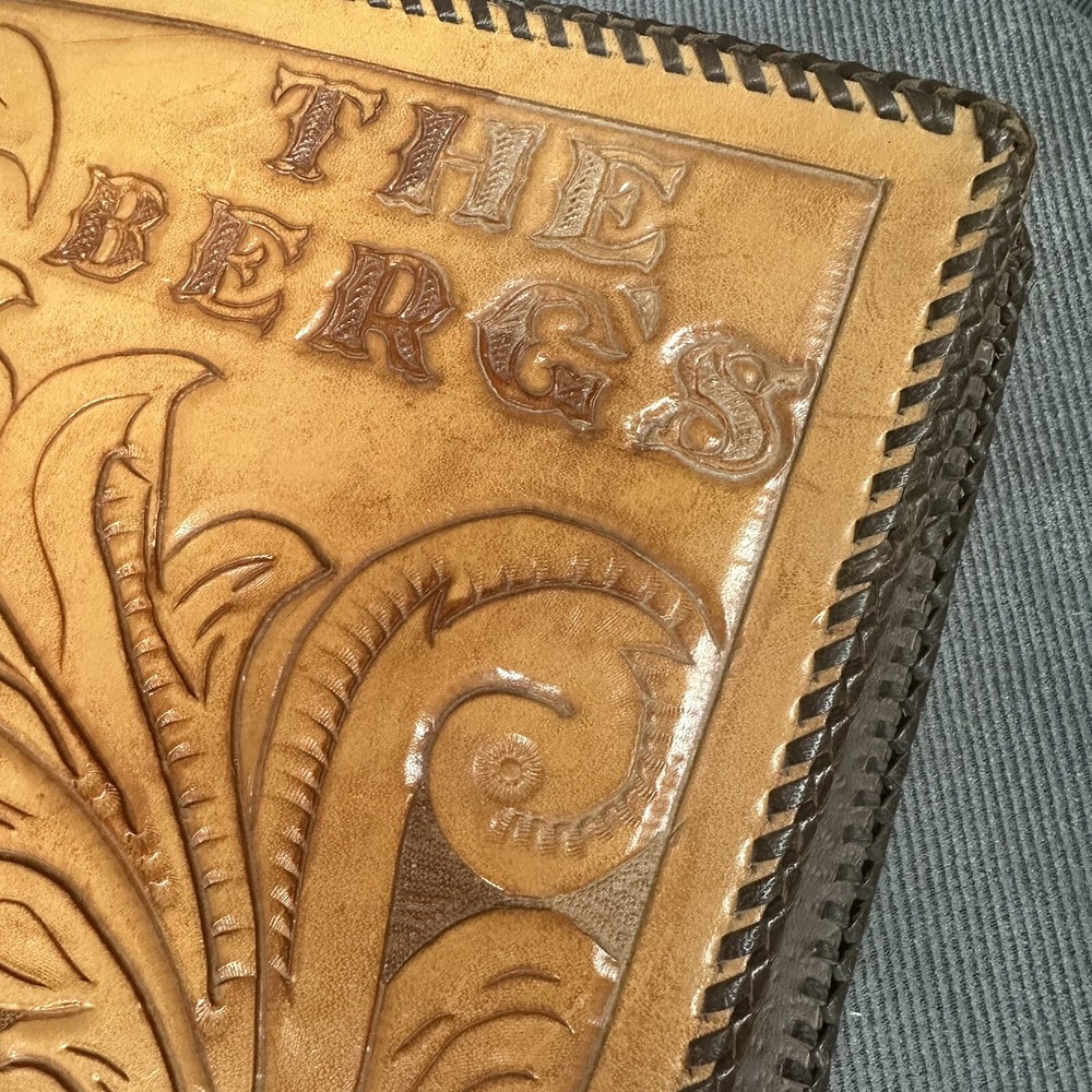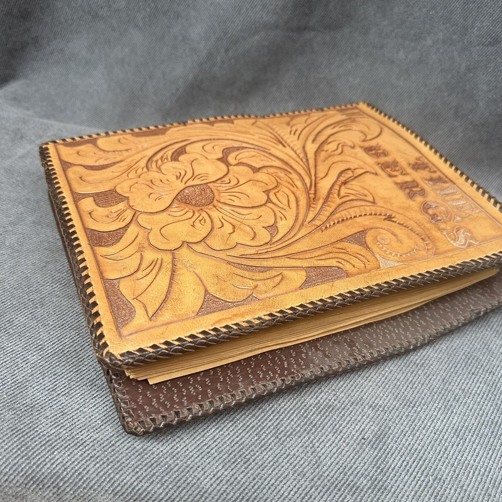 10”x13” tooled leather scrap book filled with photos, letters, notes, cards, announcements, et 31 pages