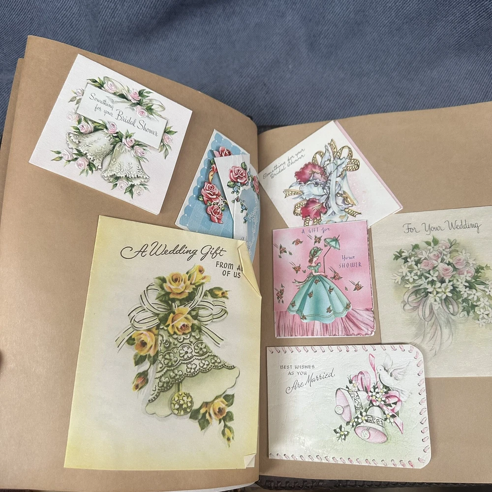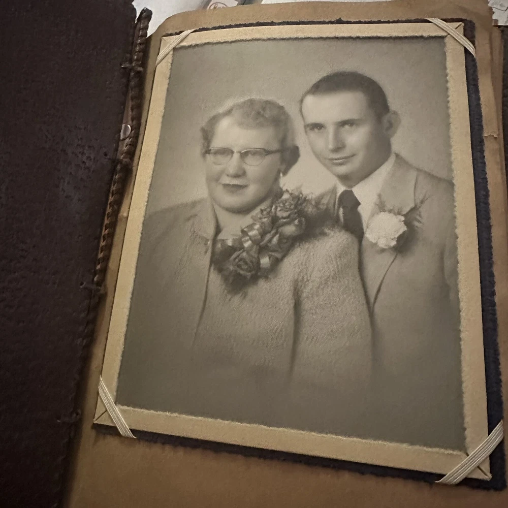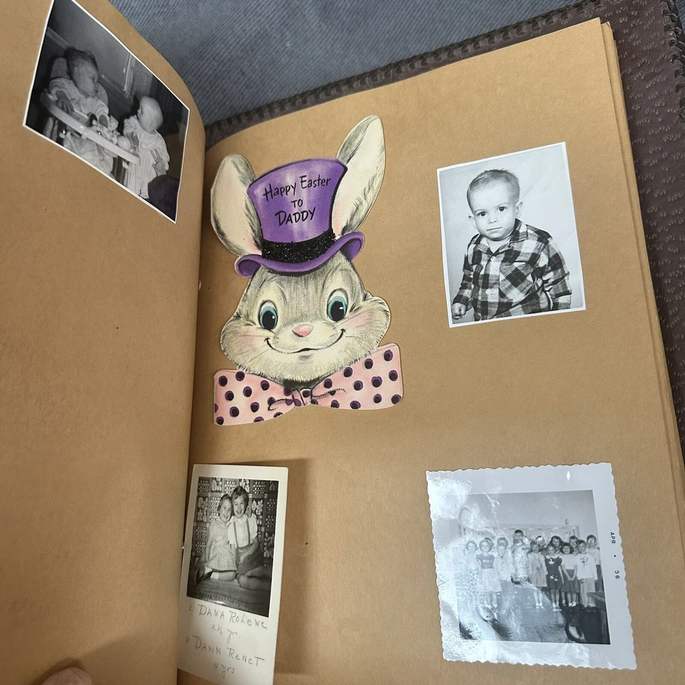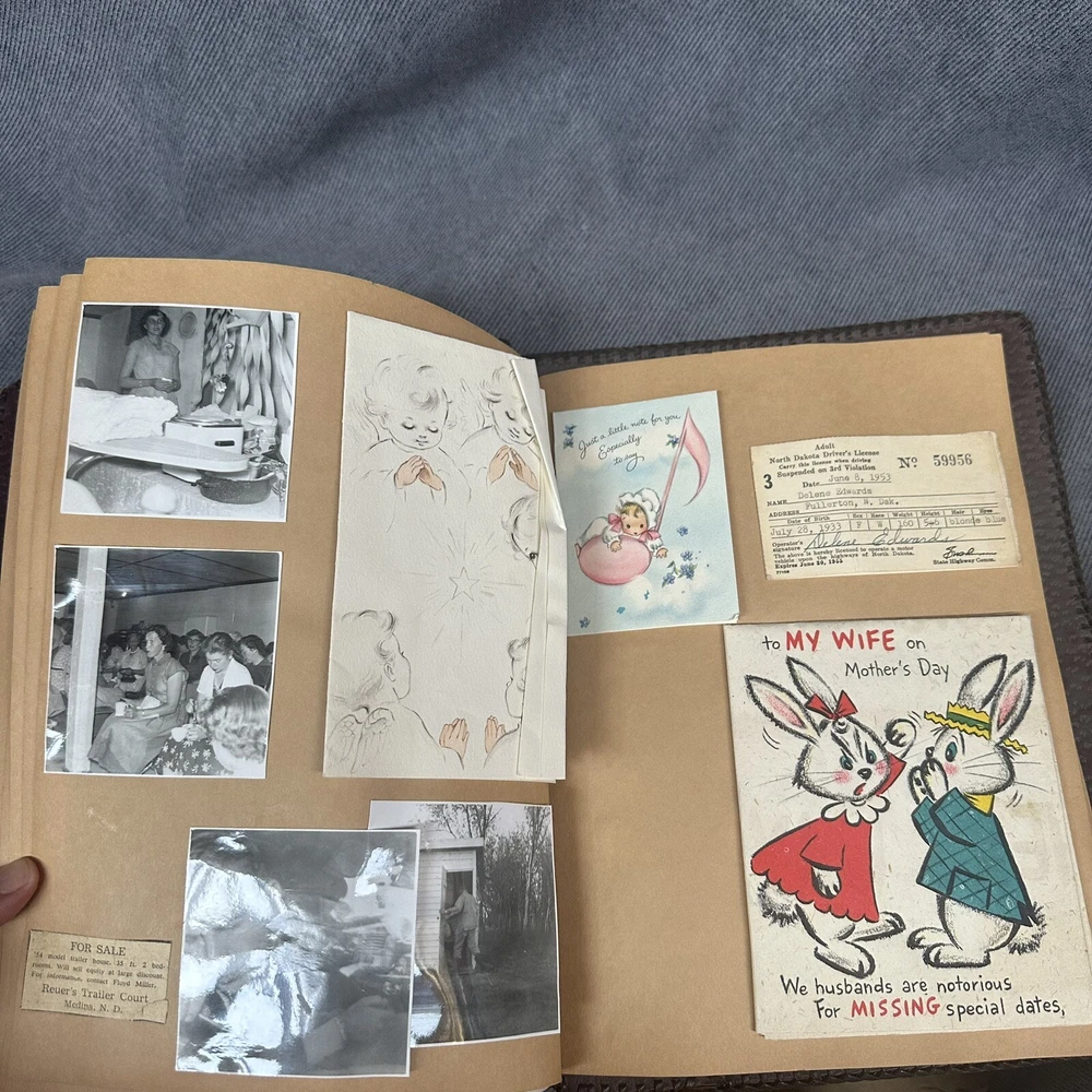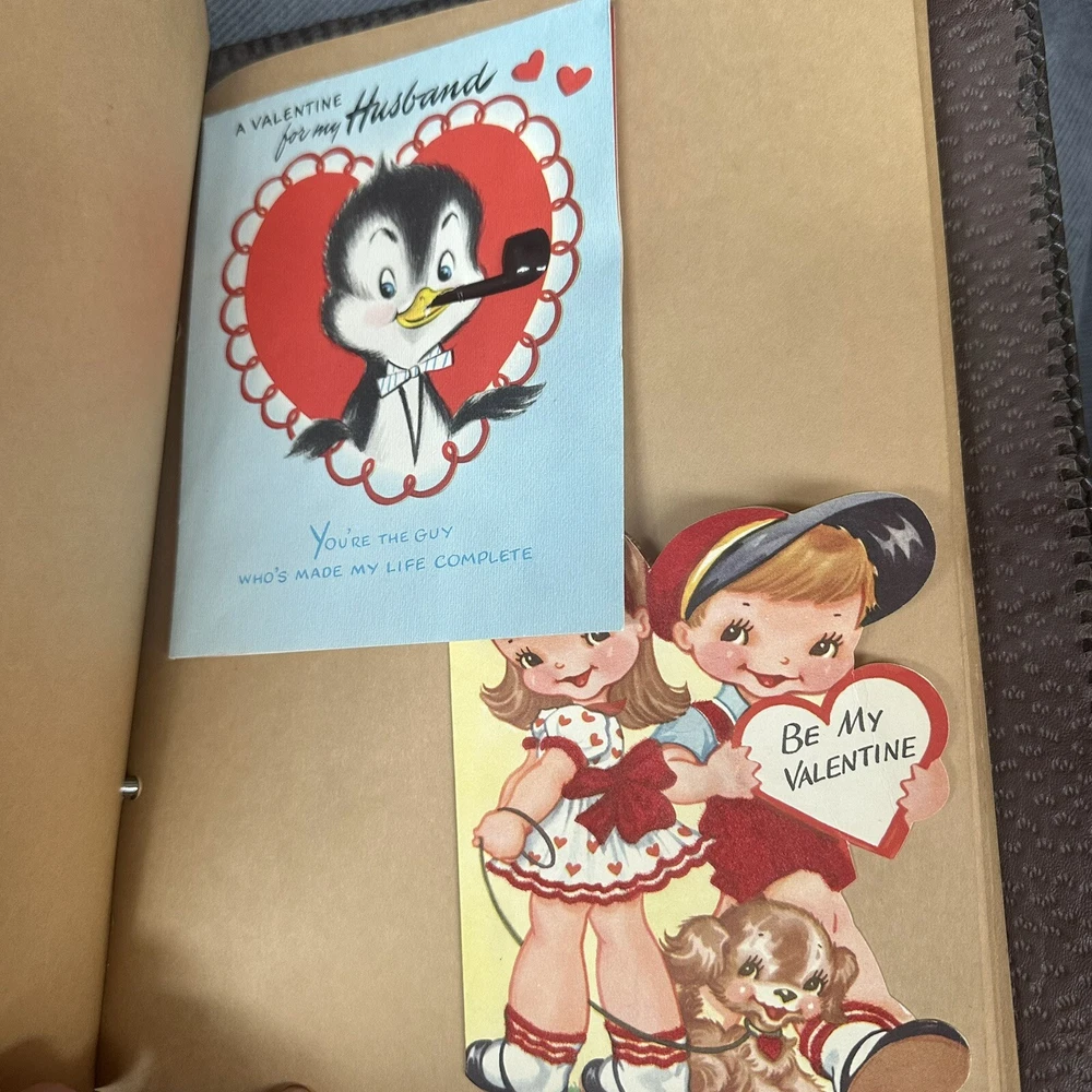 10”x13” tooled leather scrap book filled with photos, letters, notes, cards, announcements, et 31 pages