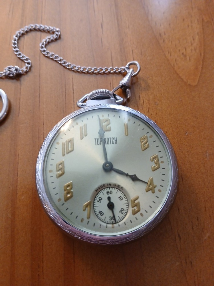 The Vintage Top Notch Brand Pocket Watch Eingraham Runs is a classic timepiece with a mechanical hand-winding movement and Roman numerals on the yellow gold dial. I don't believe that the chain with this watch does NOT go with the watch but I will leave it on. This pocket watch features an open face closure, silver case, and a snap caseback. Made in the United States, this vintage piece is perfect for collectors or those looking for a unique and stylish accessory. Preowned and in good condition.
