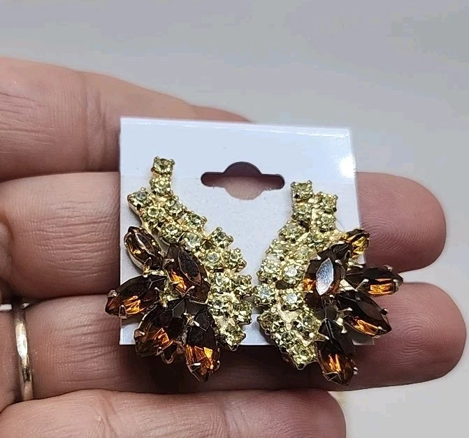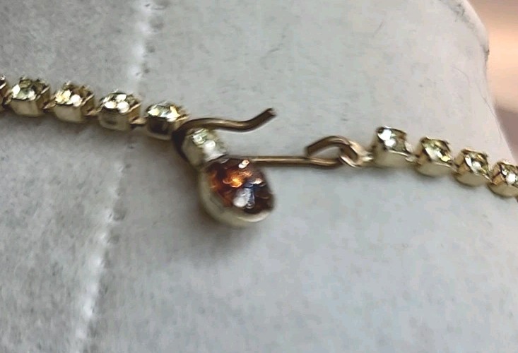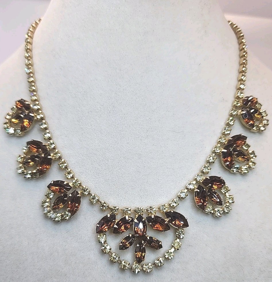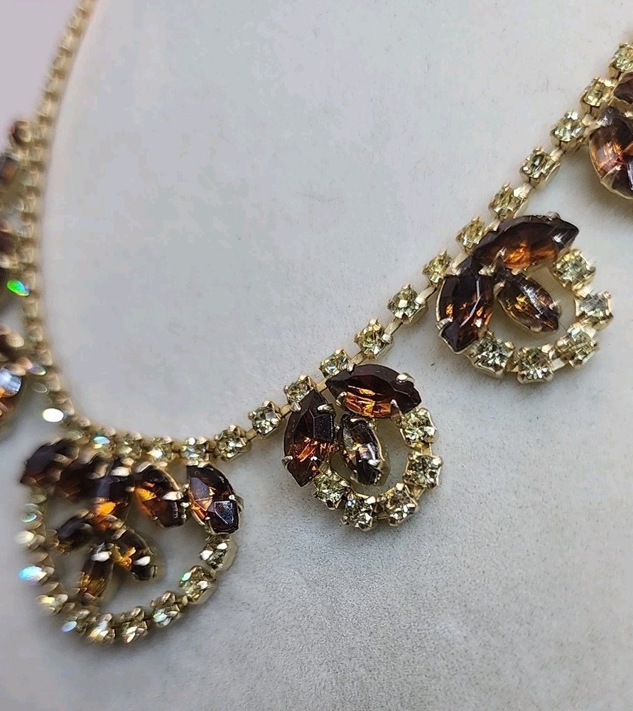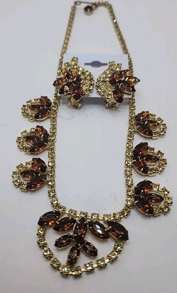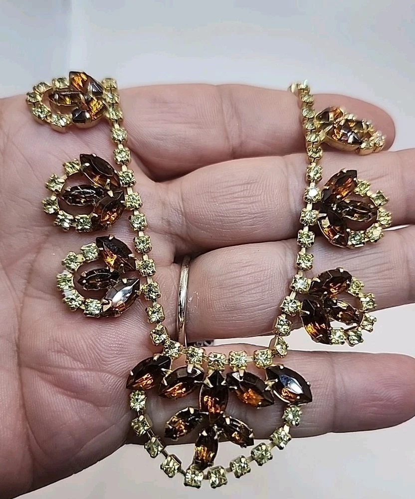 This Vintage Topaz & Green Rhinestone Collar Necklace with Matching Clipon Earrings is a stunning piece of fashion jewelry for women. The necklace features a collar style with brown rhinestones set in yellow topaz, measuring 15 inches in length and secured with a hook closure. The clipon earrings are a perfect match to the necklace, adding a touch of beauty and elegance to any outfit. This vintage piece exudes a timeless charm and sophistication, making it a perfect accessory for any special occasion or everyday wear. Pictures do not do this justice. It is absolutely stunning. Unique beautiful, will stand out!