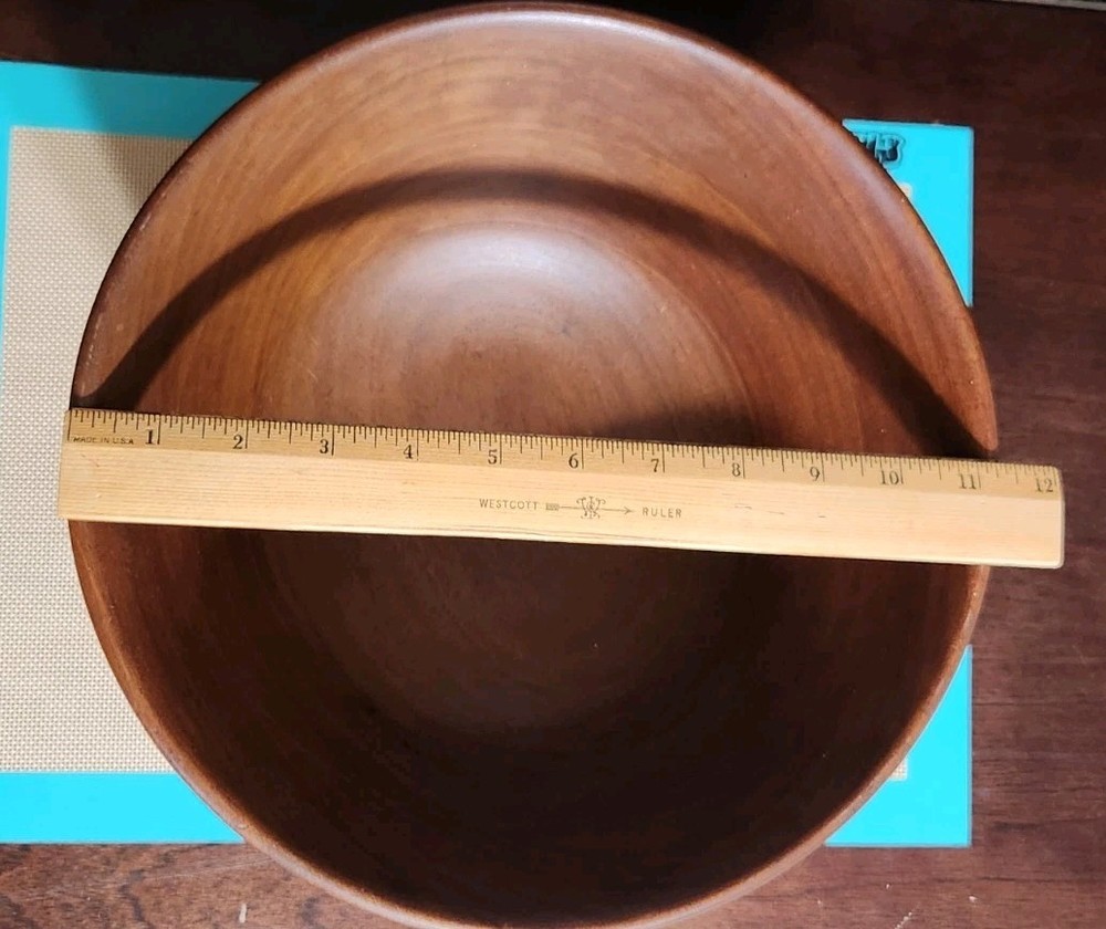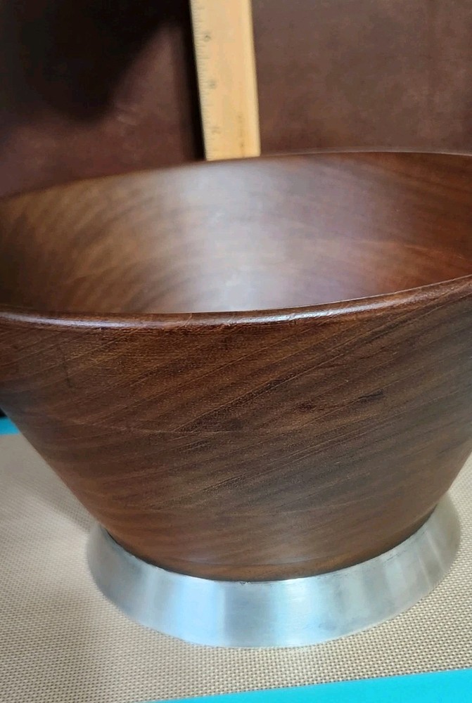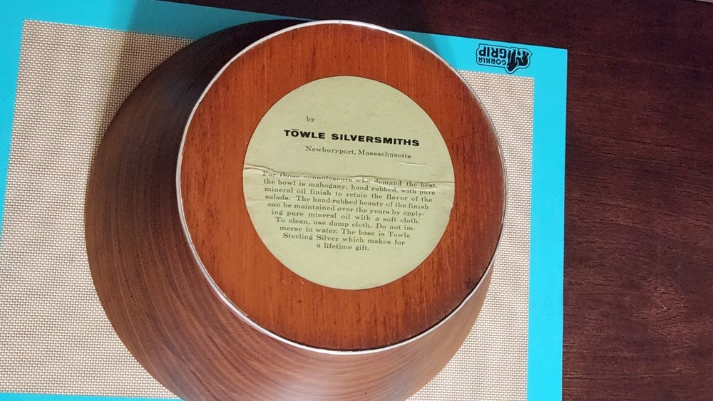 This Vintage Towle Large Wood Salad Bowl is a stunning piece of mid-century modern furniture. With a sterling silver base and a rich brown color, it exudes a timeless elegance that is sure to add a touch of vintage charm to any dining table. Made in America by the reputable brand Towle, this original piece is both functional and stylish, measuring 11 1/2" in diameter and 6 1/4" in height. Perfect for serving salads or as a striking decorative accent, this salad bowl is a versatile and unique addition to any antique collection.