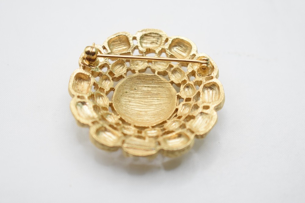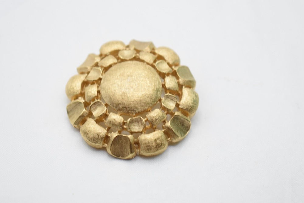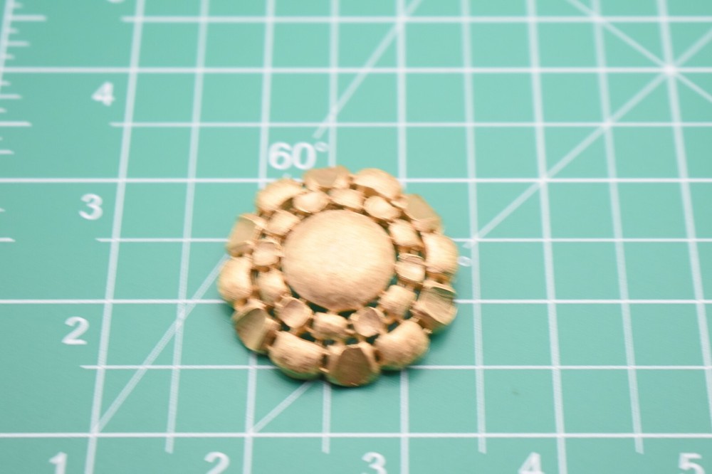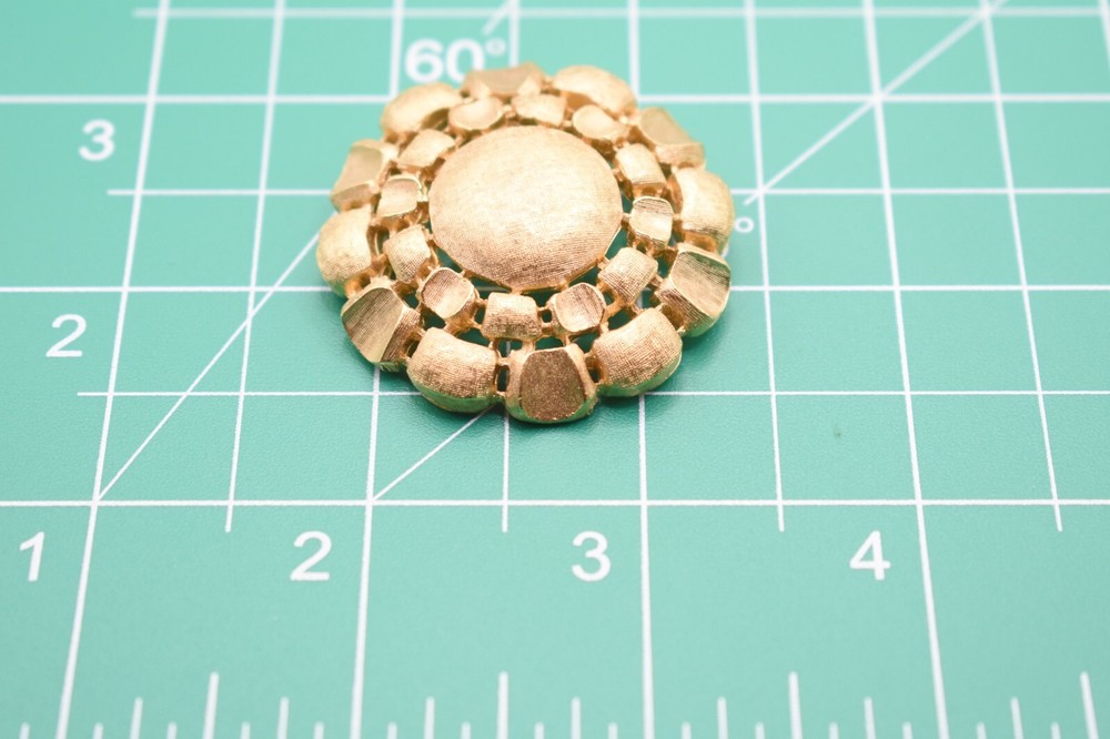 This bold vintage brooch from the Tradition jewelry line features a concentric medallion design composed of layered geometric segments in a warm brushed gold-tone finish. The center dome is surrounded by stylized beveled "petals," creating a sunburst or floral motif with mid-century modern flair. Textural contrast and substantial form give this piece strong visual presence, making it ideal for vintage costume jewelry collectors or fans of minimalist 1960s–1970s statement styles. Circa 1960s–1970s , consistent with the peak production era of "Tradition" branded costume jewelry, often sold through department stores like Sears or JCPenney.