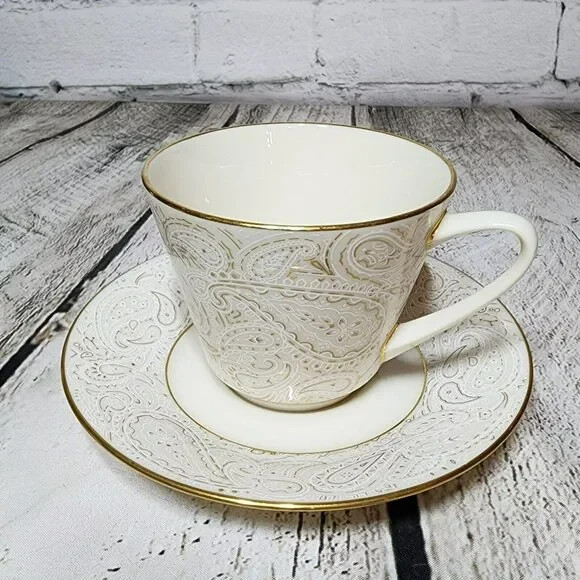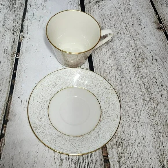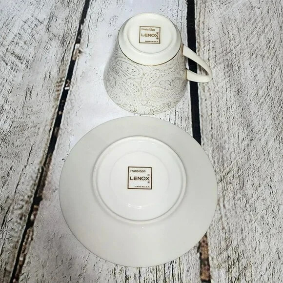 Vintage Transition by Lenox Flat Cup and Saucer Set Brand : Lenox Pattern: Transitions Transitional Description: White and Gold Paisley Design Discontinued Pattern Manufactured 1972 - 1976 Condition details : No flaws found Country of Manufacture: U.S.A. MEASUREMENTS are APPROXIMATE TAKEN IN INCHES Cup Height: 3" Cup Width: 3 1/2" Saucer Width: 6" °°° Feel free to message us with any questions