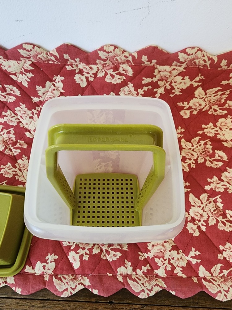 Love this vintage Tupperware pickle keeper—perfect size for pickles, olives, or even jalapeños! The avocado green lid gives it such a fun retro vibe, and it’s still in great shape with just minor wear. Super practical for keeping snacks fresh, and the airtight seal works like a charm. Clean, no odors, and exactly as pictured. A must-have for Tupperware collectors or anyone who loves reusable storage!