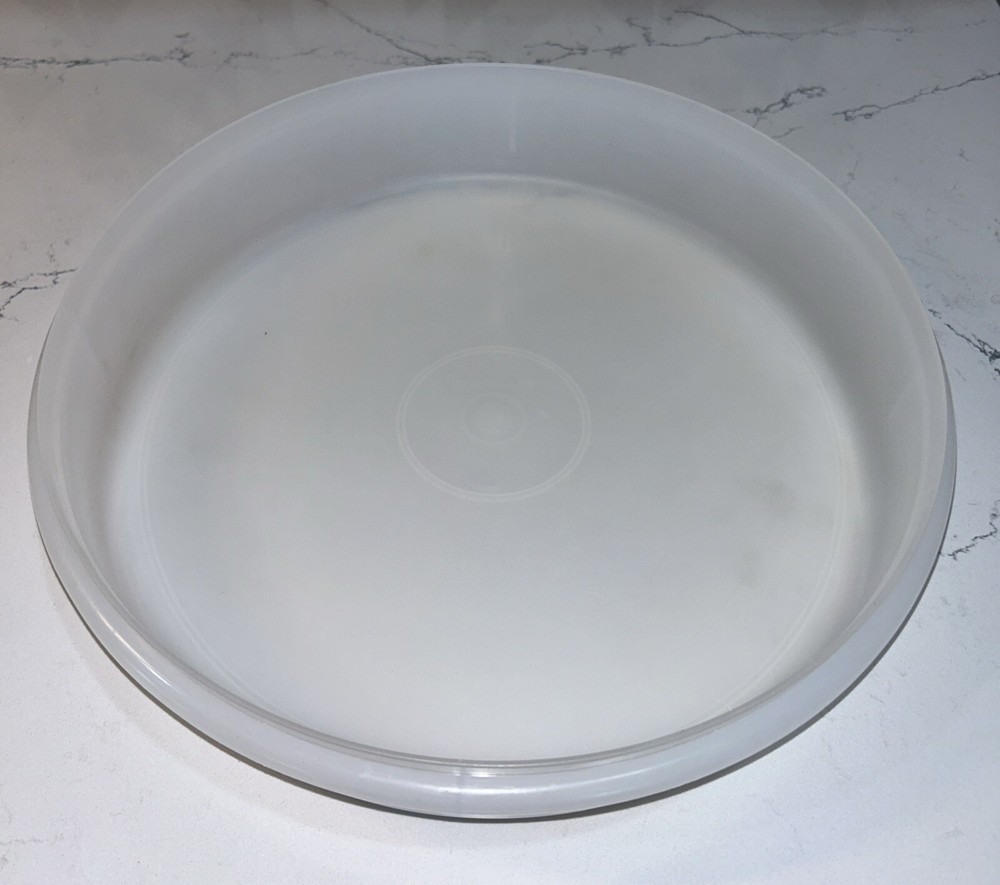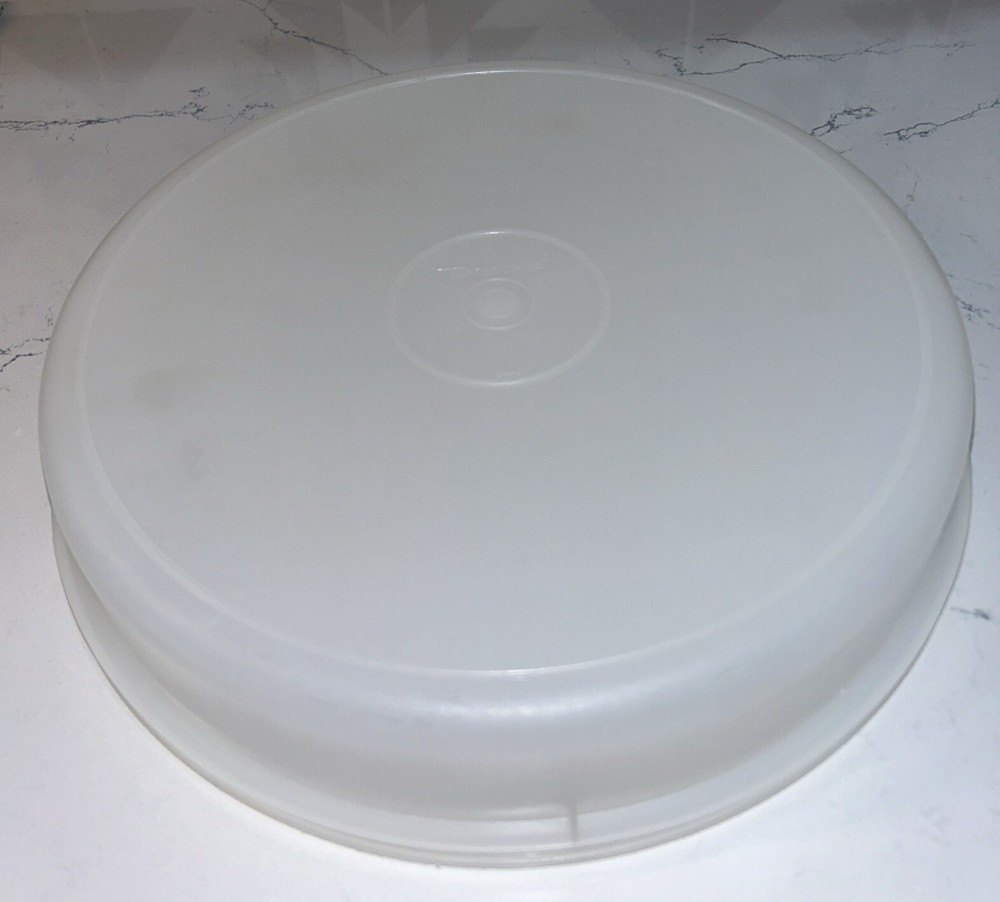 This vintage Tupperware storage container set is perfect for carrying and storing desserts and other food items. The set includes a large round carrier with a clear lid, measuring 12 inches in diameter and 2.5 inches in height. The carrier and lid are made of durable and easy-to-clean plastic, and the set is stackable for convenient storage. The design is solid and retro, with a multipurpose feature that can be used for food and kitchen themes. The carrier and lid are reusable, making it an environmentally friendly choice. This set is a great addition to any kitchen and perfect for those who love vintage or retro styles. Please note any imperfections, discoloration, scratches, etc. in the photos. Will provide more photos upon request.