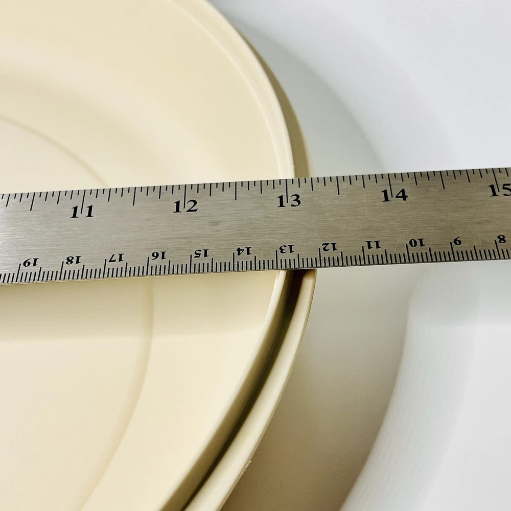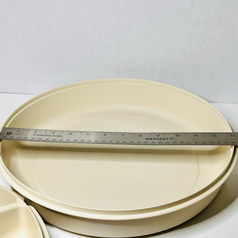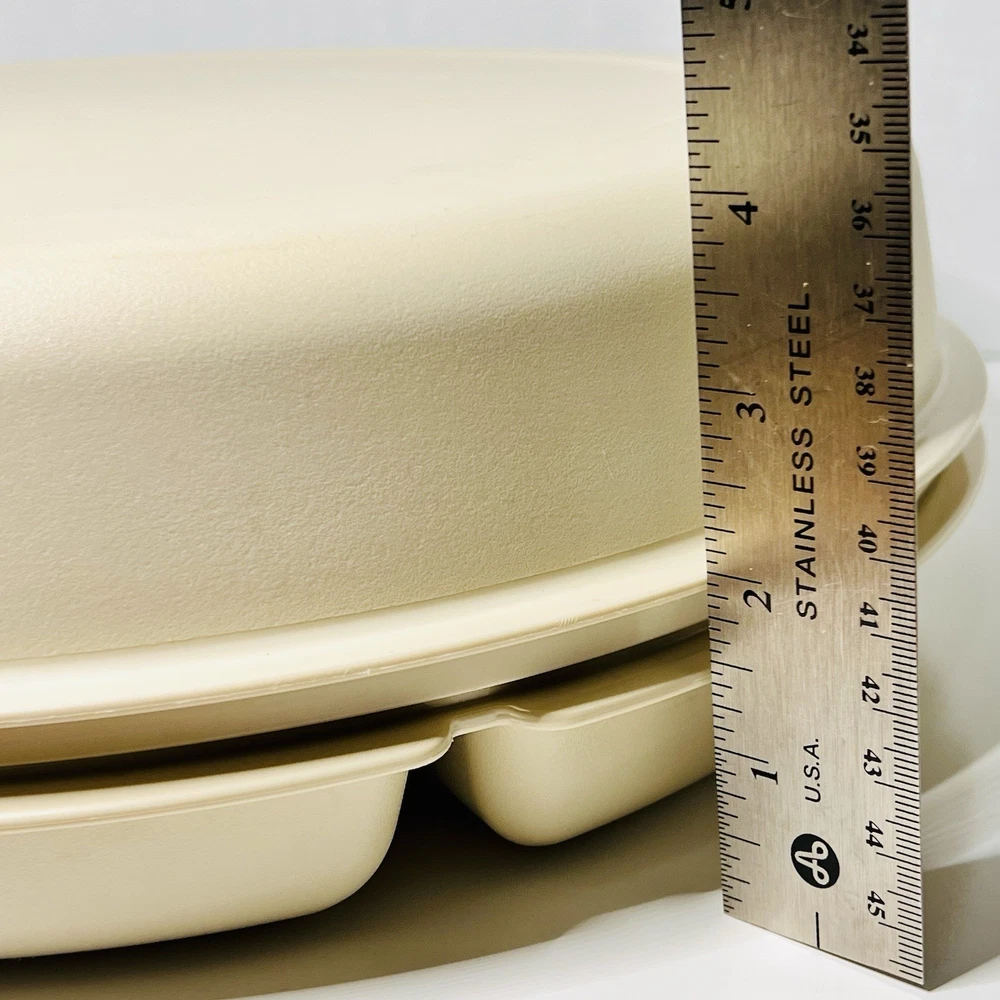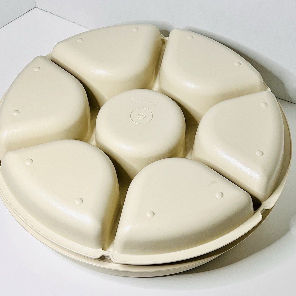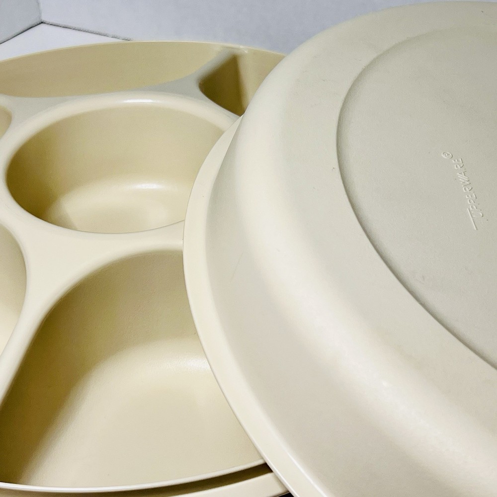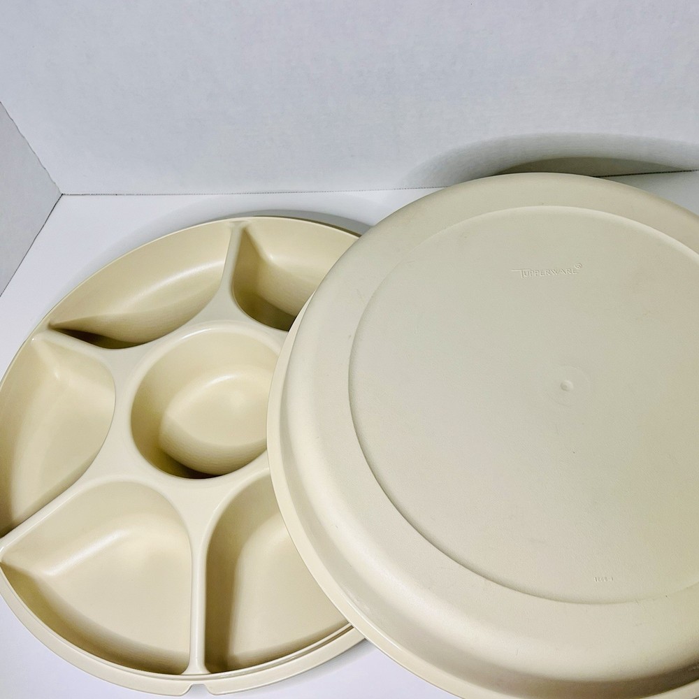 Item Height:4" with LidFeatures:With LidVintage:YesCalifornia Prop 65 Warning:NAStyle:Vintage/RetroSet Includes:LidItem Length:13.5"Number of Compartments:More Than 5Item Depth:4”Franchise:TupperwareAntique:NoPattern:SolidLid Type:Push OnItem Diameter:13.5"Number of Slots:7Country/Region of Manufacture:United StatesBrand:TupperwareShape:RoundNumber of Tiers:1Original/Licensed Reproduction:OriginalHandmade:NoMPN:1665-5Material:PlasticSize:LargeItem Width:13.5"Color:BeigeNumber of Items in Set:2Number in Pack:2Type:Tray