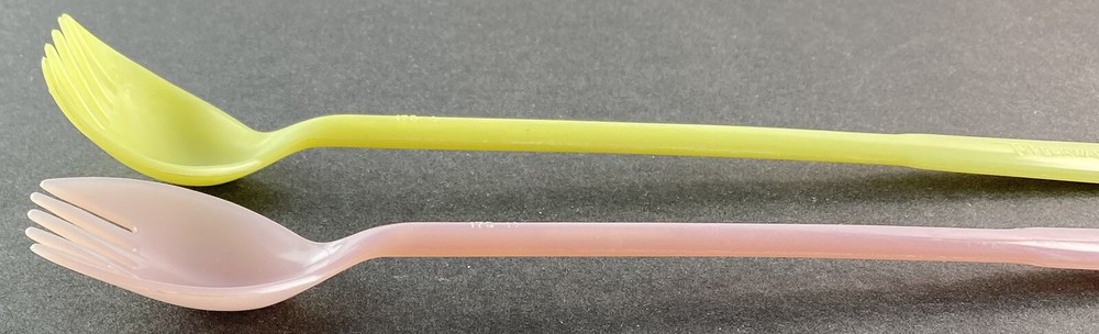 One spork is bent on the end, see photos. This vintage Tupperware silverware set includes a spork/fork and a spoon, both made of durable plastic material. The set is perfect for collectors or for everyday use, especially for those who prefer lightweight utensils. The handle of each utensil is also made of plastic for a comfortable grip. The set also comes with a long ice tea spoon, making it a complete package for any meal. Whether you're dining outdoors or indoors, this Tupperware silverware set is a great addition to your collection or kitchen.