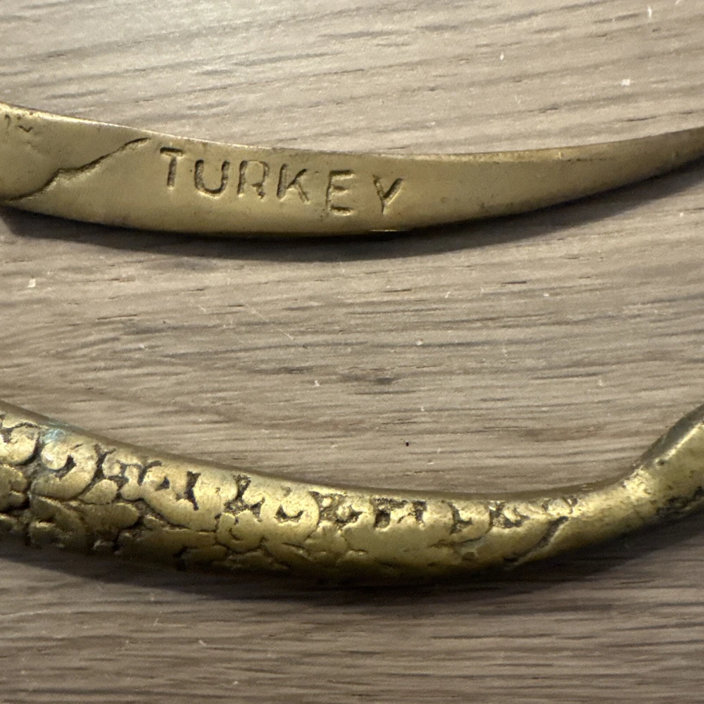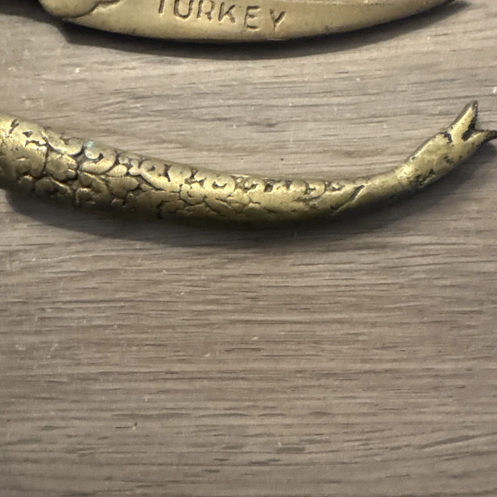 This vintage Turkish letter opener features a blade with a snake/serpent design, made of brass and marked with Turkish craftsmanship. It is a handmade item that comes with a sheath for storage.