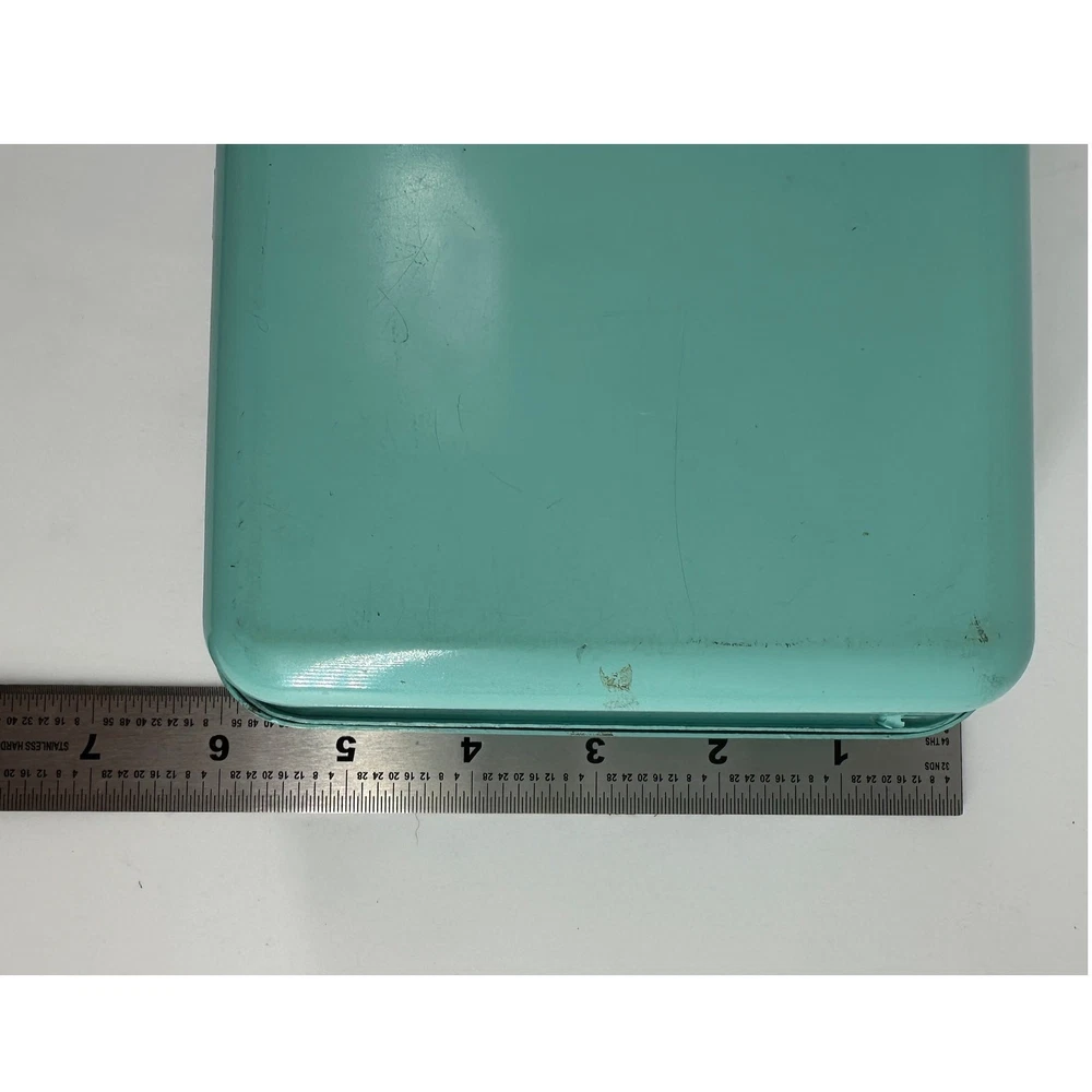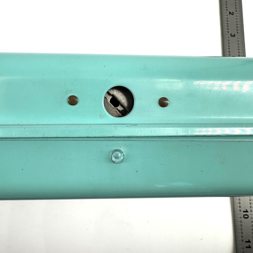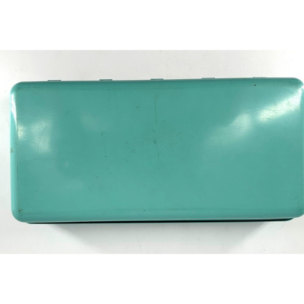 Rare retro turquoise metal box with gold lettering from Great Southern Life Insurance Company, founded 1909 in Houston, Texas. Features hinged lid with secure clasp and original T. Jones Jr. C.L.U. Insurance Agency label from Livingston, Texas. Mid-century advertising collectible with bold color that makes it perfect for display, storage, or as a statement décor piece. Aesthetic turquoise finish gives this box a vintage look that fits retro office style, cottagecore storage, or shelf décor. Collectible and functional, ideal for those who love unique vintage finds with history. Approximate Measurements: Length 11", width 5.5", height 2". Weight 1 lb 9.7 oz. All measurements are approximate. Condition: Pre-owned vintage with surface scratches, small paint wear, and age marks that add to its authentic patina. Interior clean with original clasp intact intact but not closing and holding. Additional piece taped inside. Please review pictures for details.