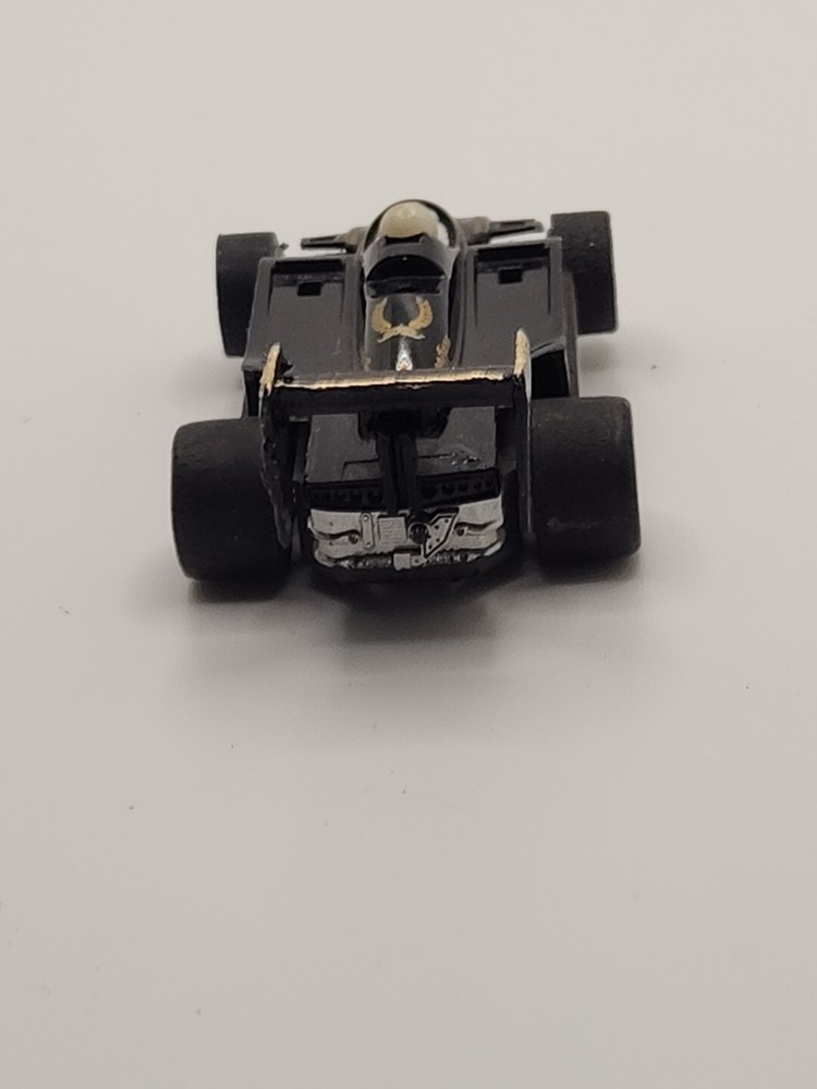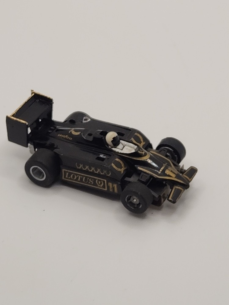 Tested with a 9 volt, motor runs great! Looks to be a different wing, but the previous collector took care of his cars, and this shows. Very cool example. Vintage Tyco #11 F1 Lotus HO slot car features a John Player black and gold livery, reflecting a classic design. Made by TYCO and designed as a car type in HO scale, this collectible piece is a nostalgic addition to any slot car collection.