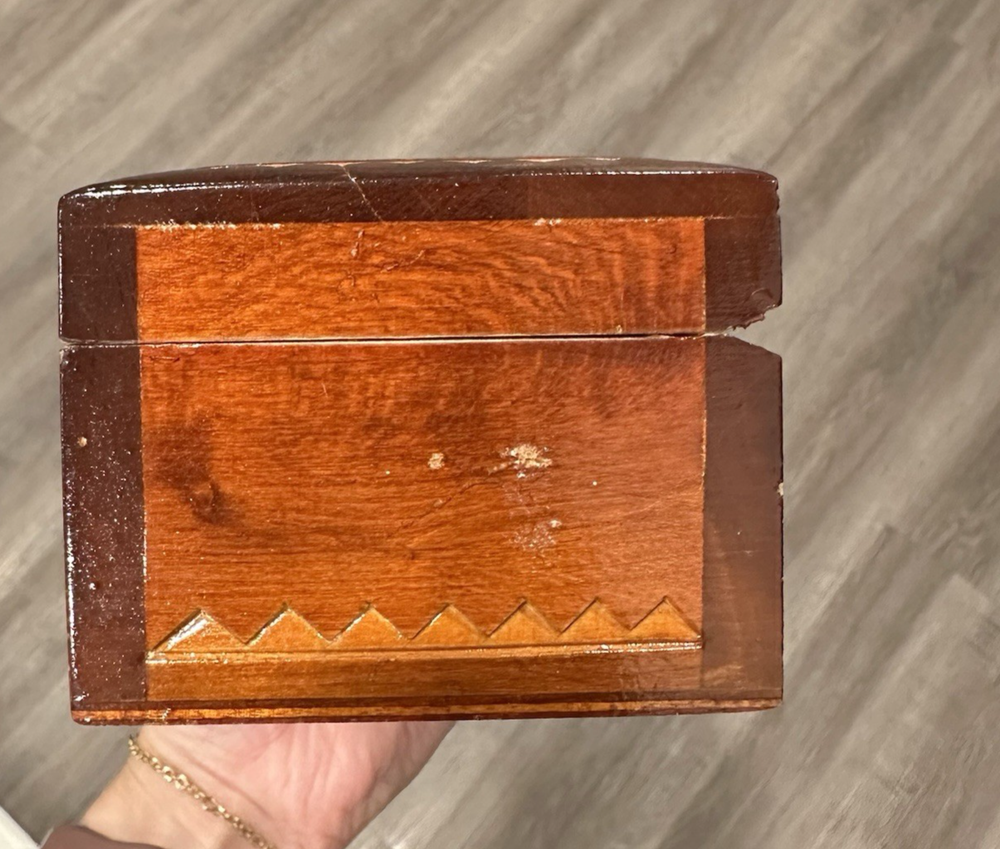 Vintage wooden hand-carved rectangular jewelry trinket keepsake box is a unique piece with a geometric pattern, making it suitable for all occasions. Measuring 7.5" in length and 3.25" in width and 2.5" in height, this small box features intricate carvings and a press fastening closure. Made in the USSR, signed. The Lacquered finish adds a smooth and polished look to the brown wood material, making it a charming addition to any collection of decorative collectibles. Beautiful piece! Measurements: 7.5"Lx3.25"Wx2.5"H This item will ship USPS Ground Advantage.