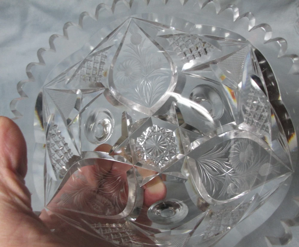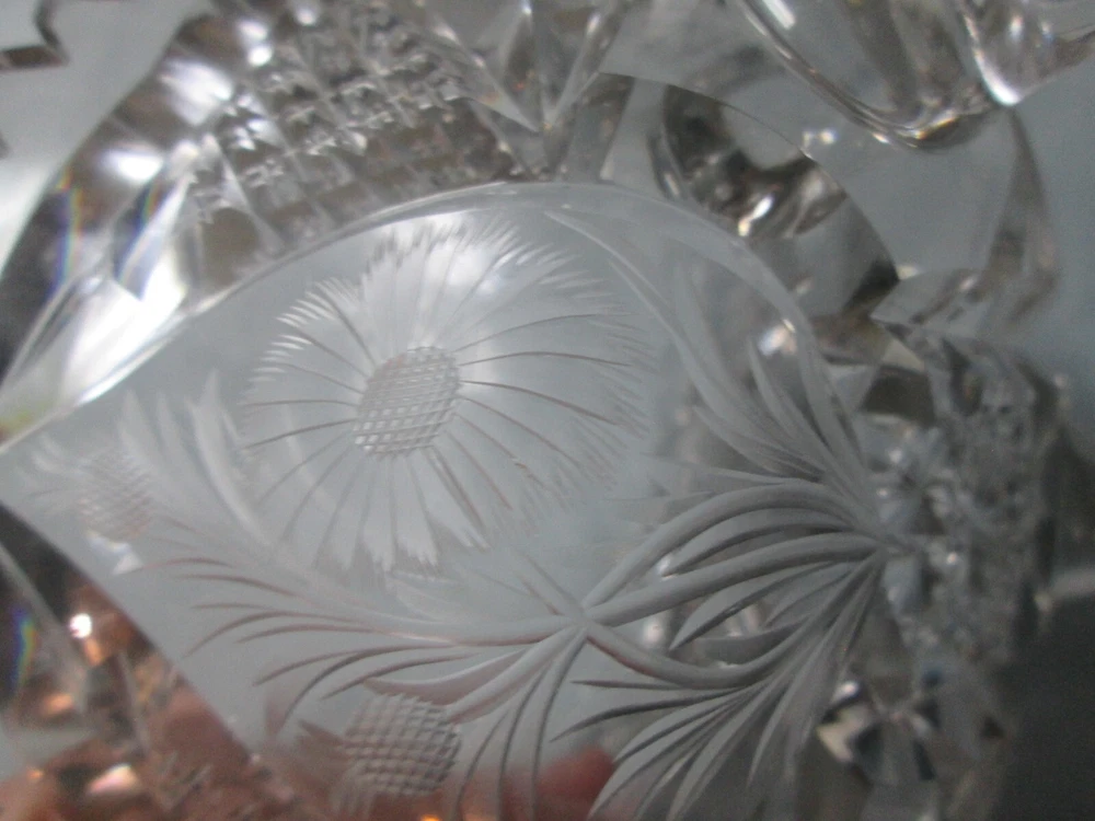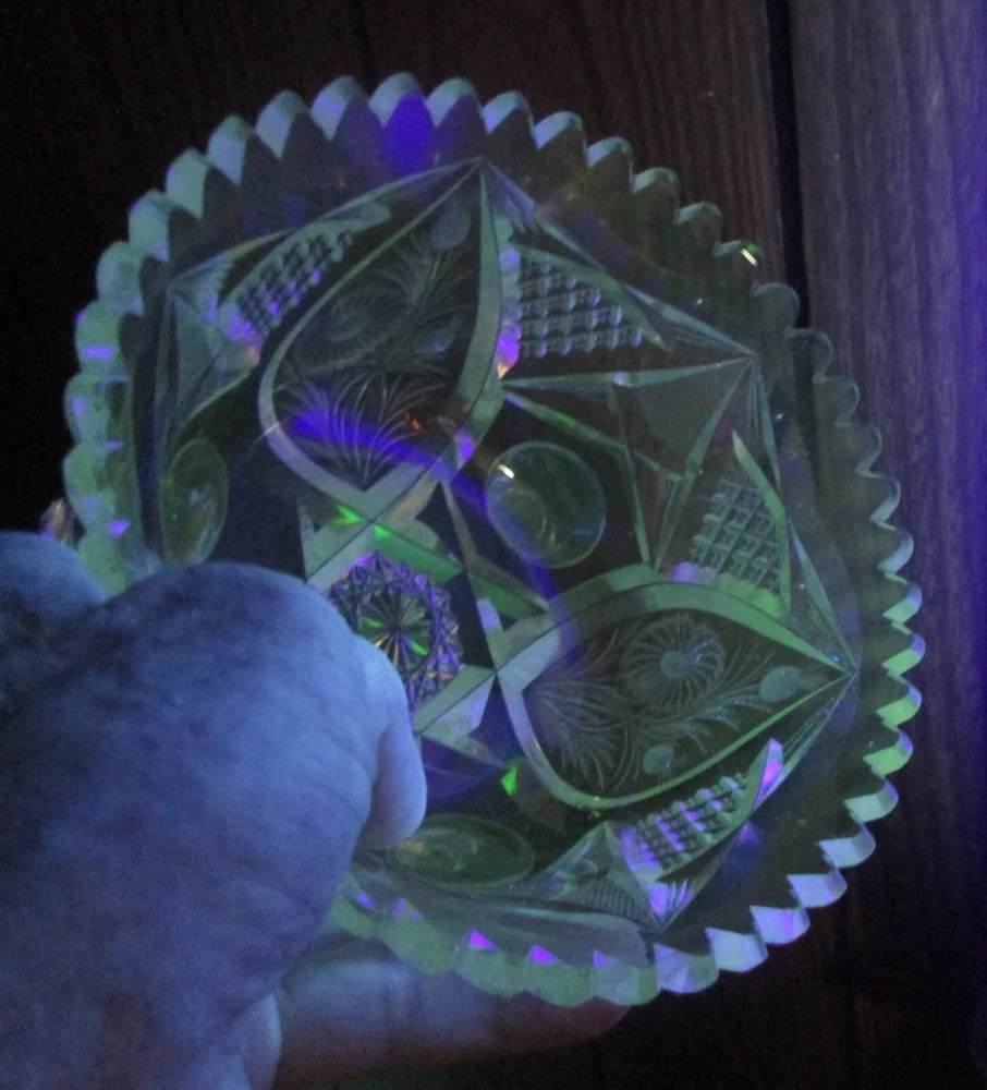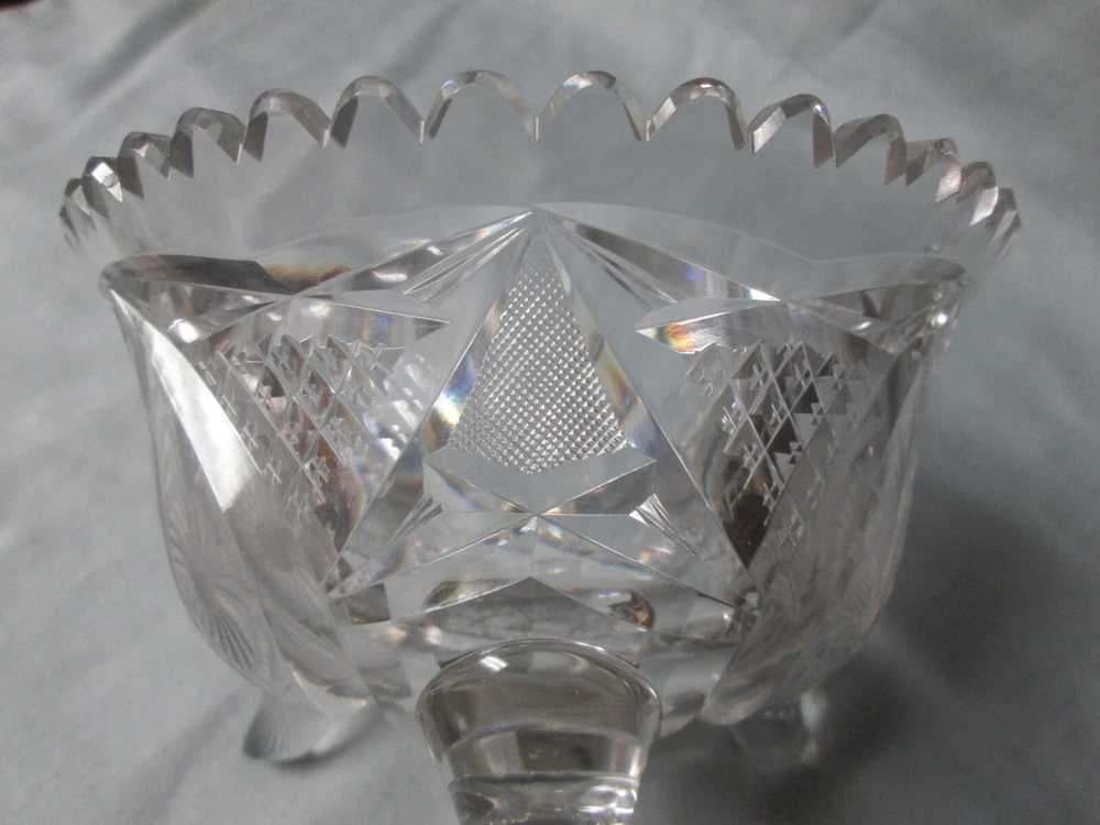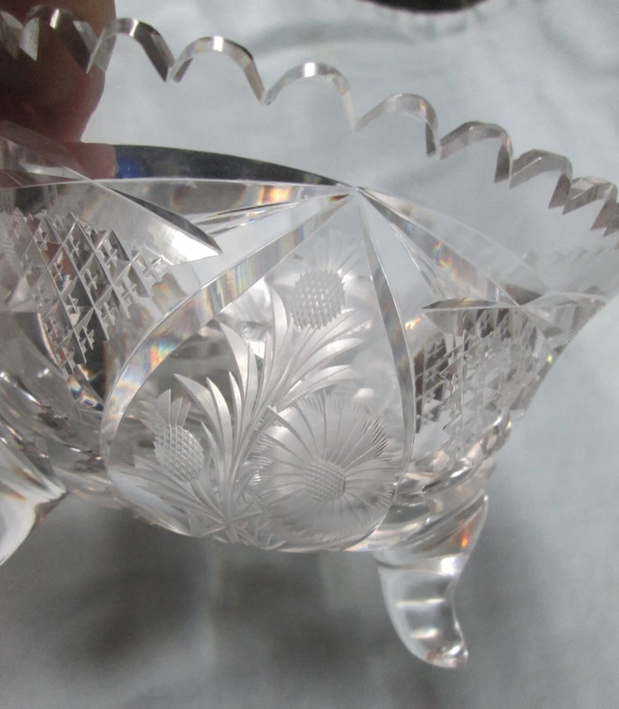 This is a beautiful cut crystal glass 3 footed bowl in nice condition. There are 2 small chips on the very bottoms of 2 of the feet which can't be seen when displayed. No other chips or cracks. It is deeply cut with a quality design of flowers on 3 panels. I don't see any maker's marks. It is approx. 6in. across and 3 5/8in. deep. It turns green under UV light. GREAT item to add to your collection, decor or existing set. Thanks for looking.