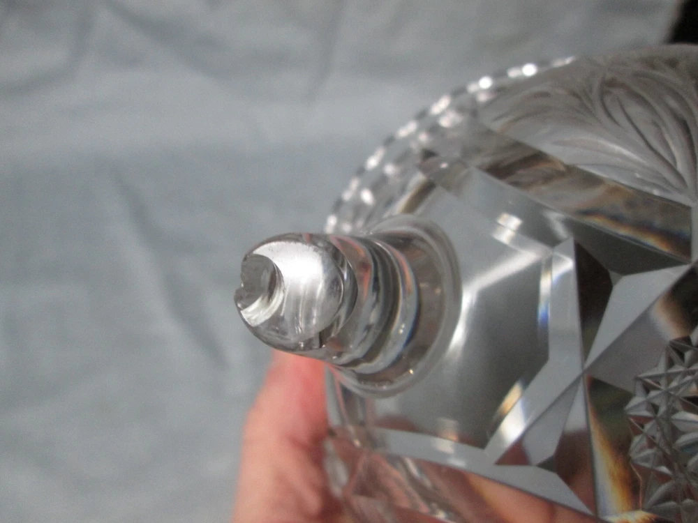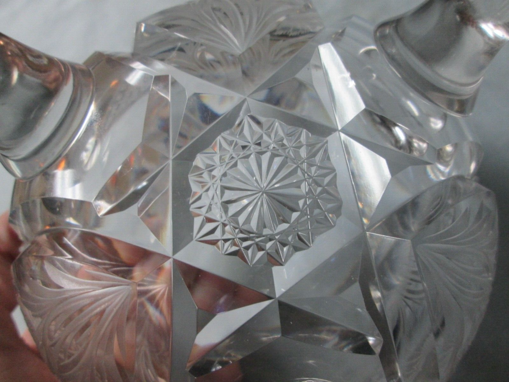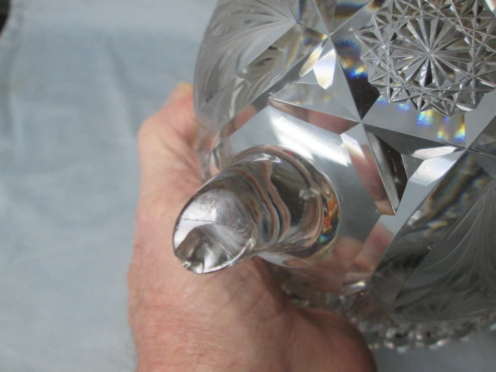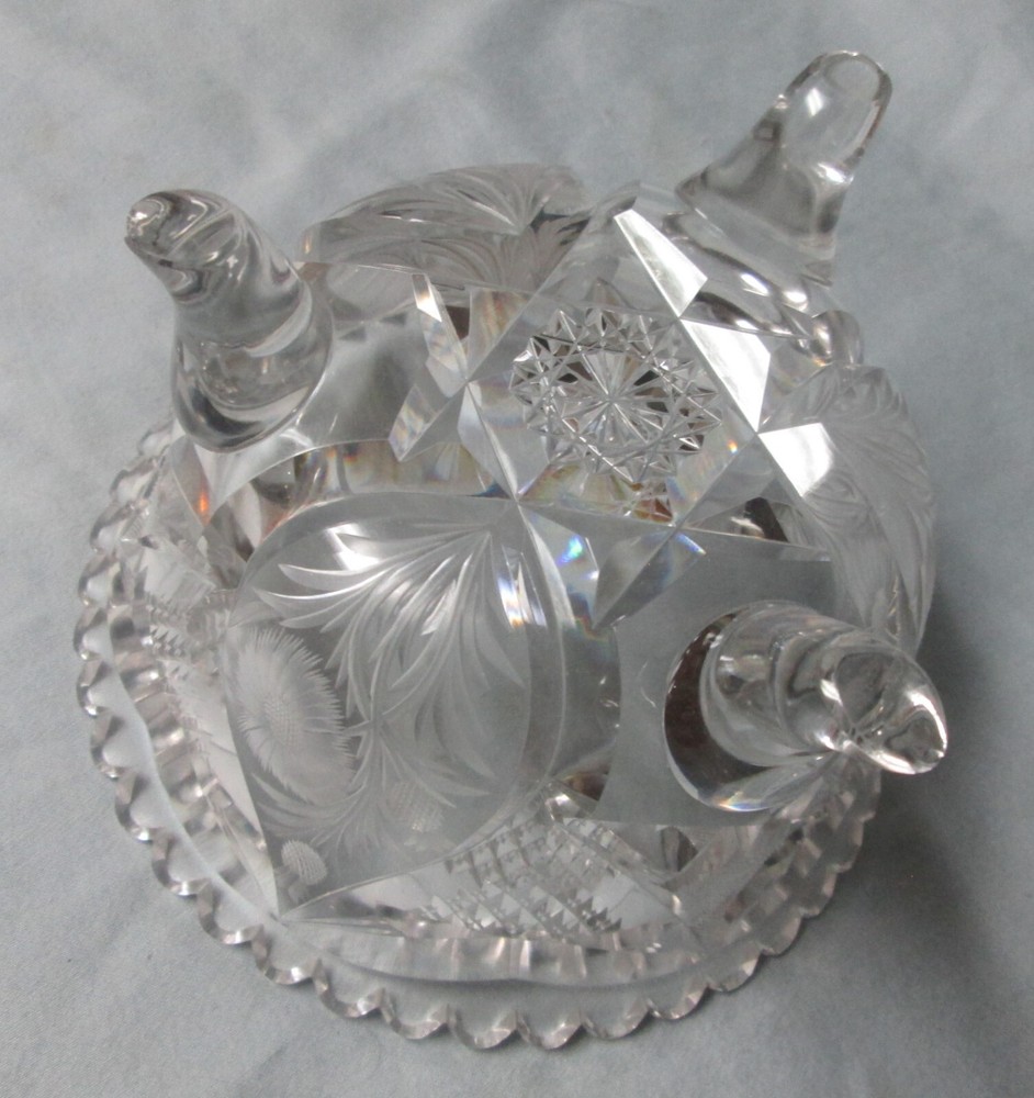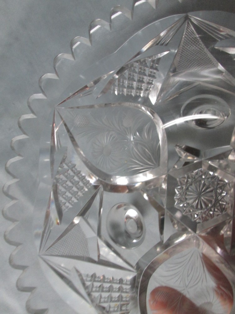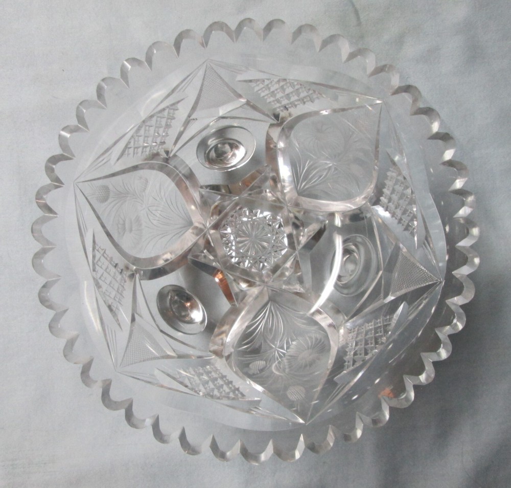 This is a beautiful cut crystal glass 3 footed bowl in nice condition. There are 2 small chips on the very bottoms of 2 of the feet which can't be seen when displayed. No other chips or cracks. It is deeply cut with a quality design of flowers on 3 panels. I don't see any maker's marks. It is approx. 6in. across and 3 5/8in. deep. It turns green under UV light. GREAT item to add to your collection, decor or existing set. Thanks for looking.