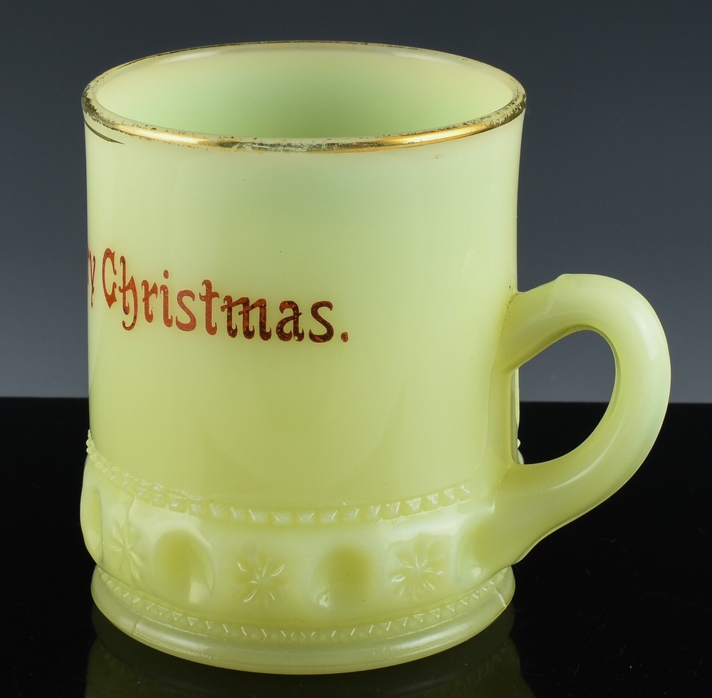 Note To all Buyers. Shipping is usually done within 1 Full Business Day Of Payment. All shipping is provided a tracking number, and regardless of location arrives usually between 2-7 Business days, please ignore the estimated time Ebay displays for you. DESCRIPTION : Here we are offering Uranium glass mug, up for sale and your consideration. Made from fine Vaseline glass containing traces of Uranium, which makes the piece admit a bright Zombie green like glow when under the effects of a UV Black Light. This piece is in the very collectible custard glass and has such a strong glow. The merry Christmas is in a fine gold and the embossed base is eye catching. Very cool, perfect for a nice Collection or would make the most outstanding gift to someone dear to you! The last photo is a small sample of the Uranium glass we have to offer, please check out our Page, and save greatly with combined shipping! CONDITION : In Vintage Estate Fresh condition, with no chips, cracks, or repairs. Only some minor scuffs and wear consistent with age. MEASUREMENTS : The Mug measures approx. 3-1/4 inches tall by 2-1/2 inches wide across the top. SHIPPING : We offer combined shipping on orders, therefor the more you order the cheaper the shipping!! We also offer Worldwide Shipping on the vast majority of our stock, please contact us to arrange your worldwide and specific shipping needs!