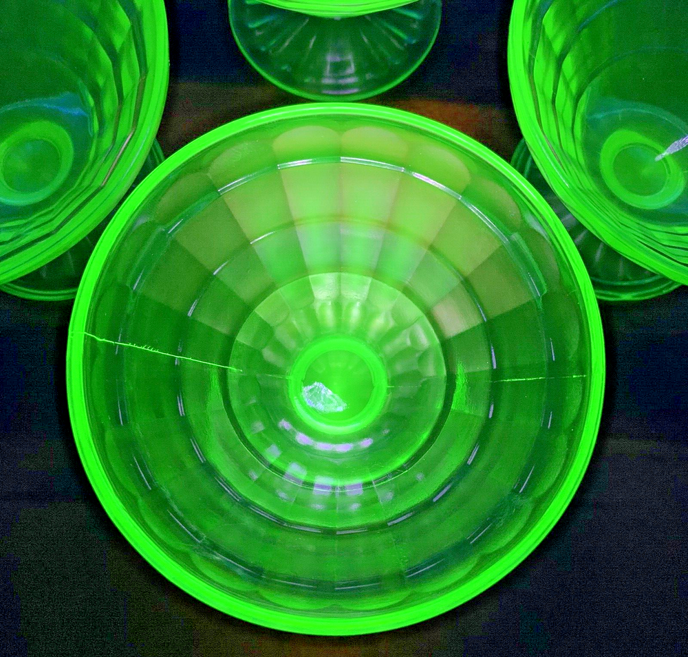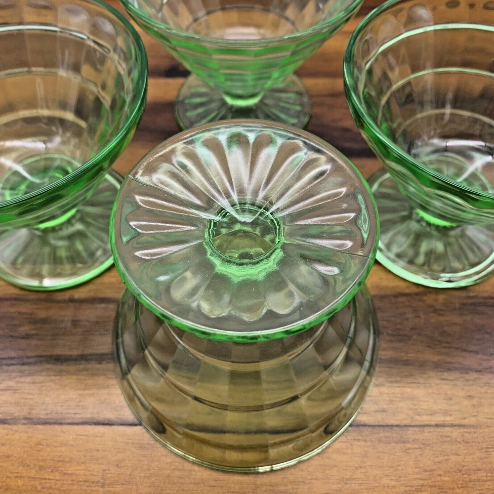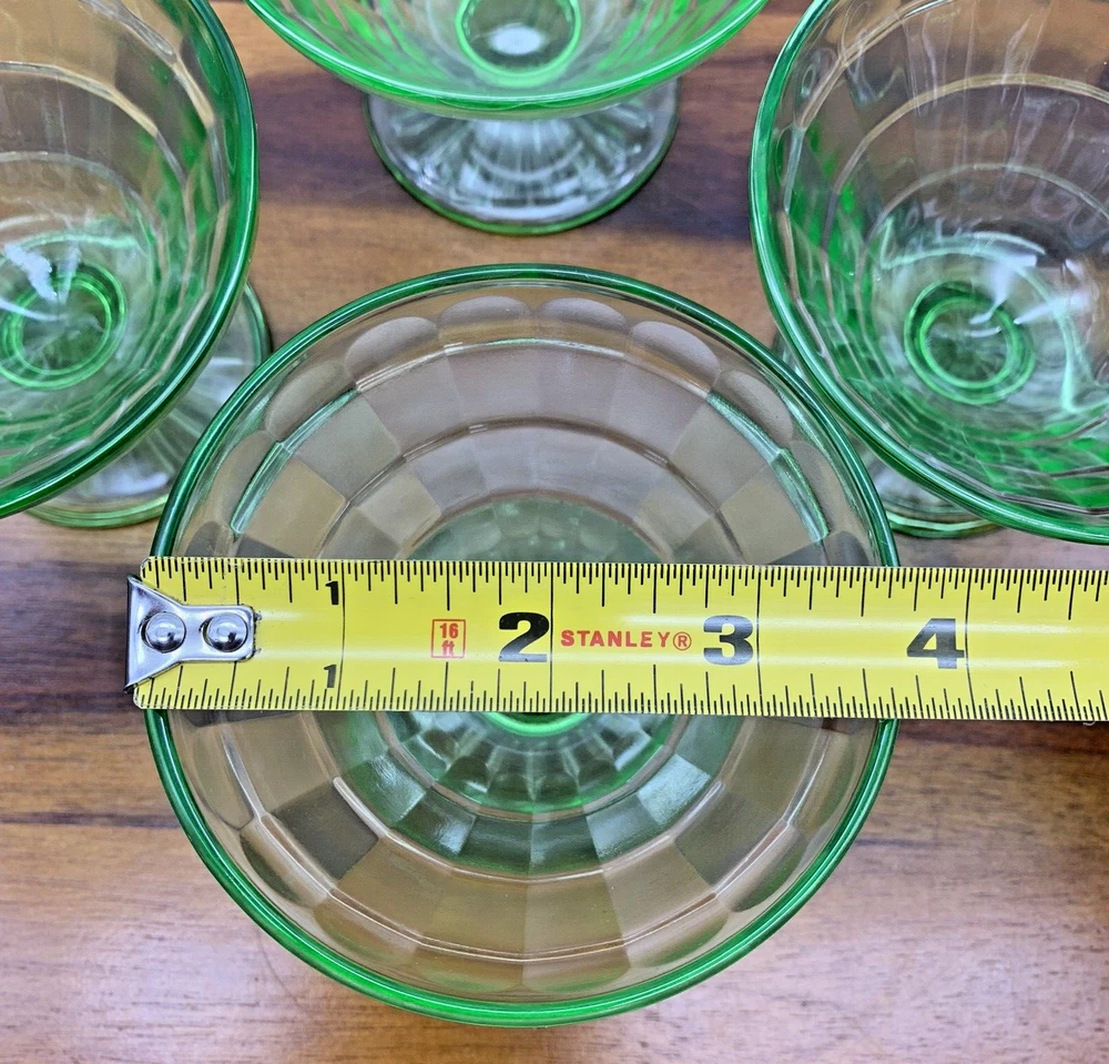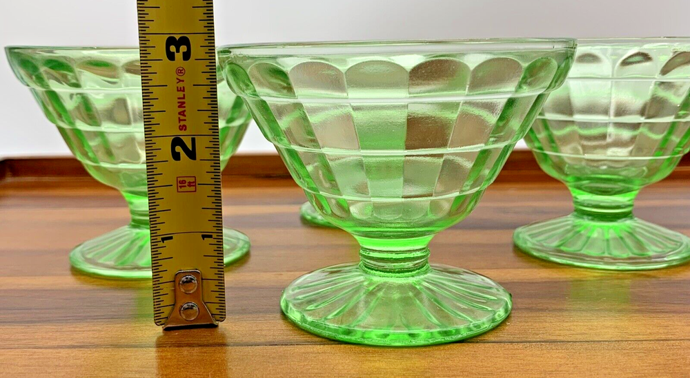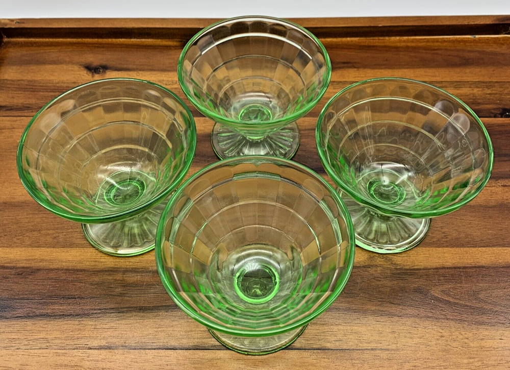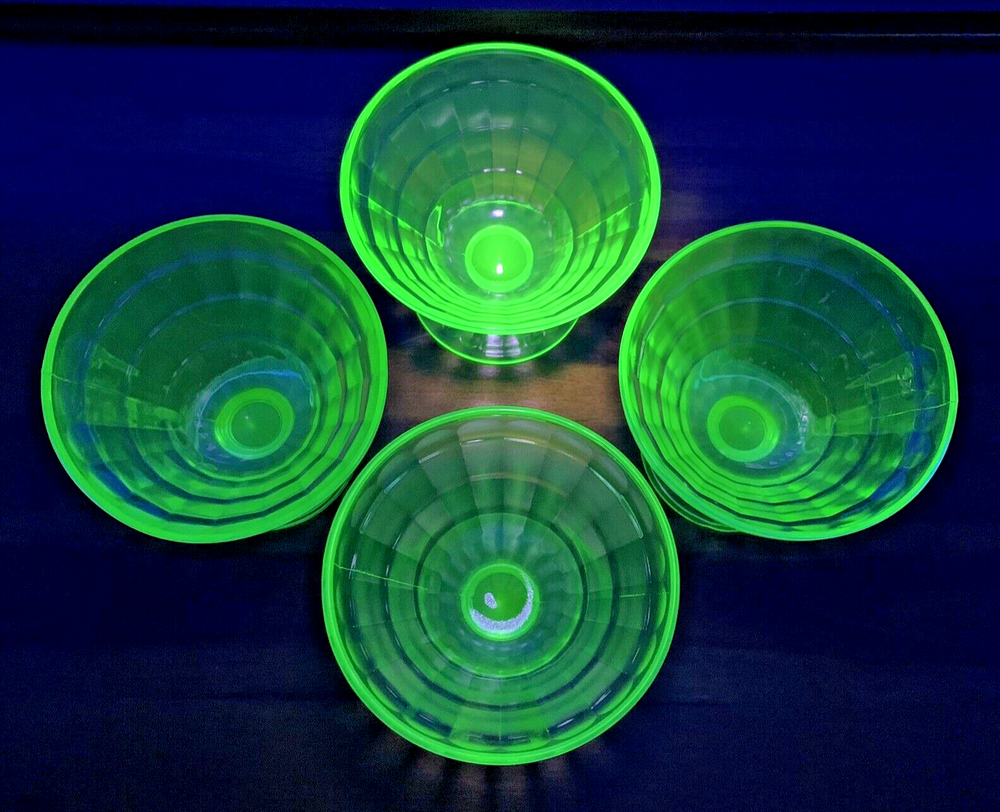Set of 4 Vintage Anchor Hocking Block Optic Uranium Green Glass Sherbet Berry Dessert Bowls Cups Vaseline Fluorescent Glows Footed All 4 glasses are in fantastic condition, belonged to a collector! Each measure roughly 3 inches tall, 3.75 inches wide at the top and 2.5 inches wide at the base. Please zoom in on photos for a better view of the item's condition. We do our absolute best to research all items we sell. If you ever have questions, please reach out to me! We will always package items securely and with care. Thank you for viewing and please visit our store for more awesome vintage goodies!