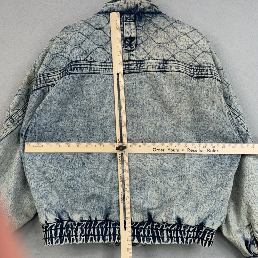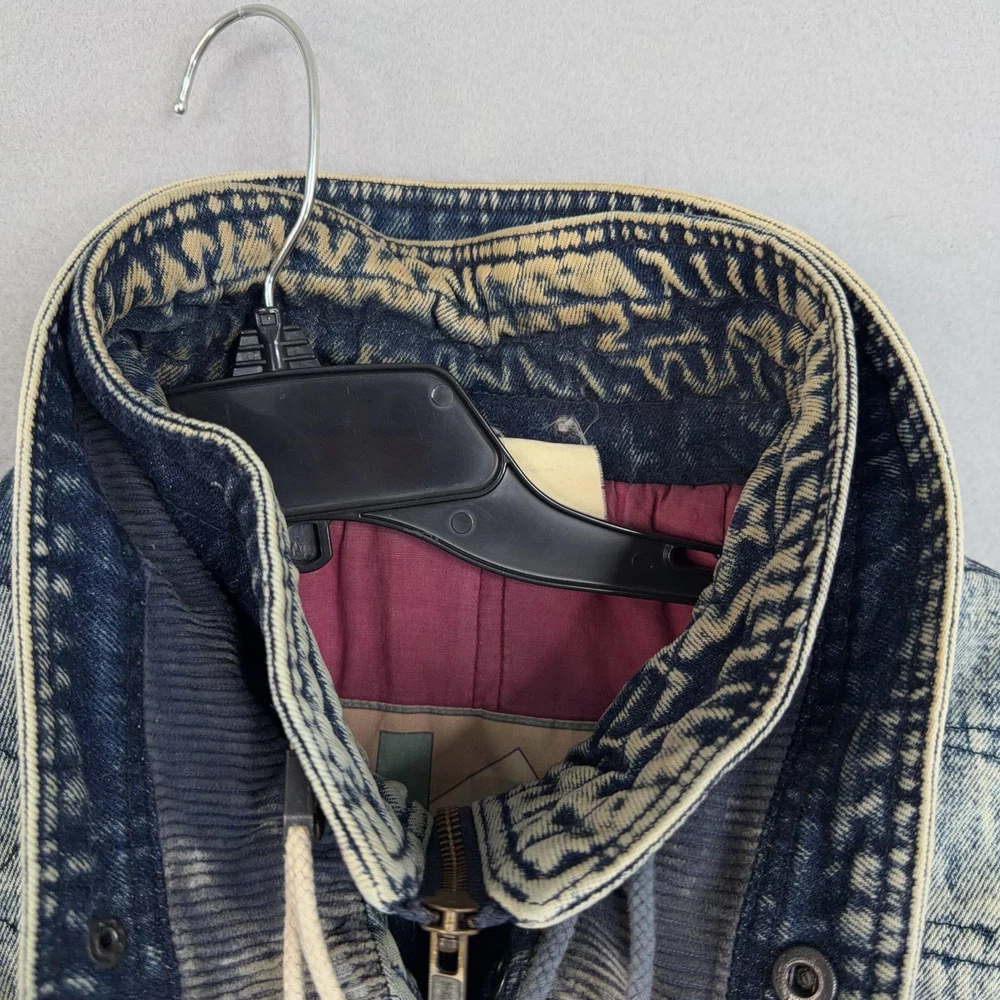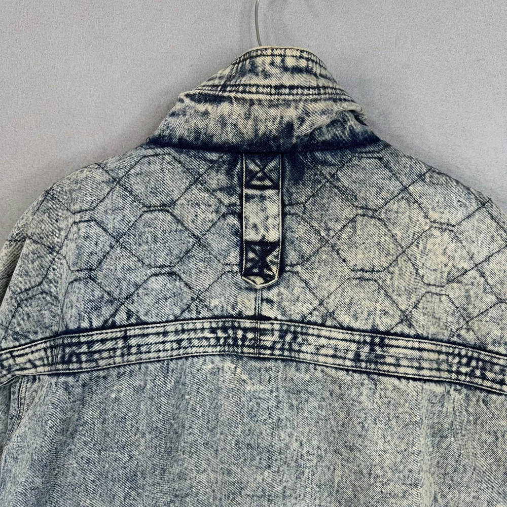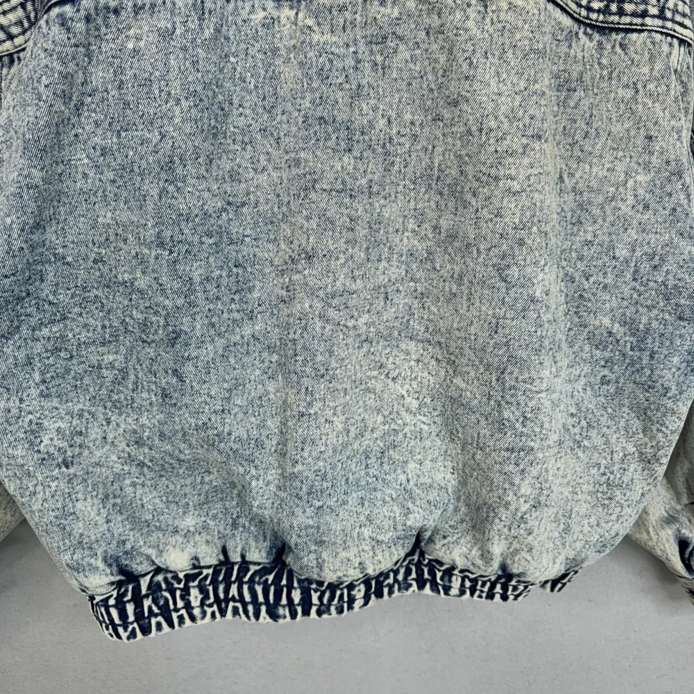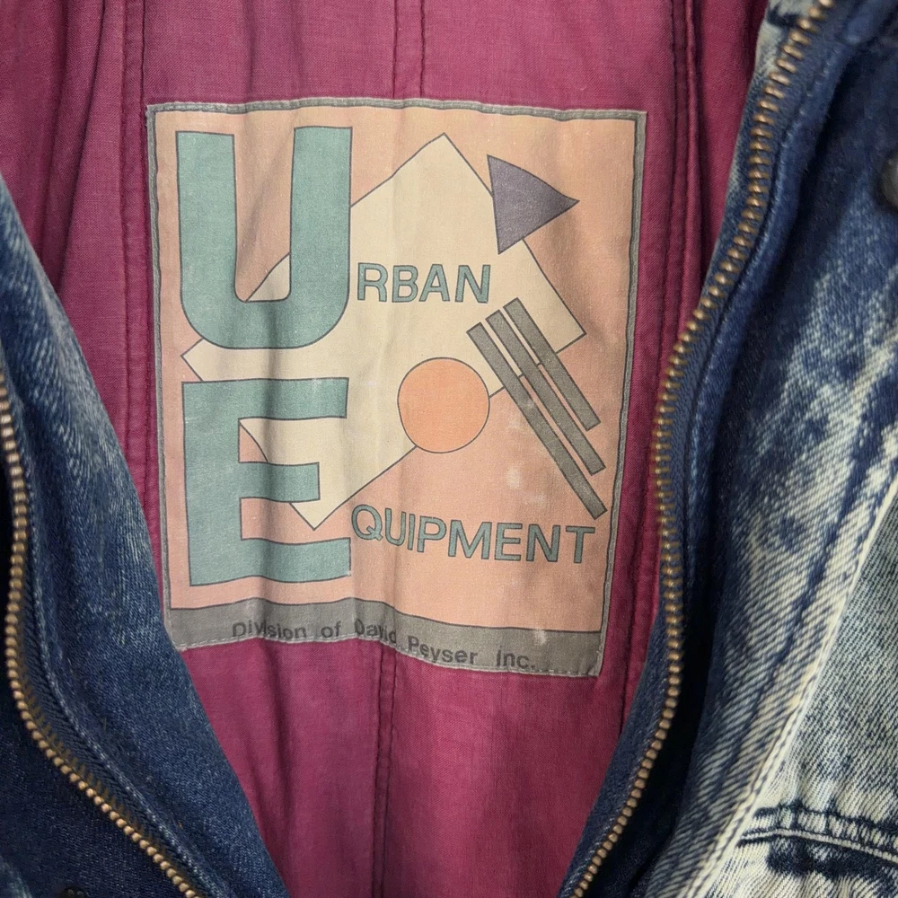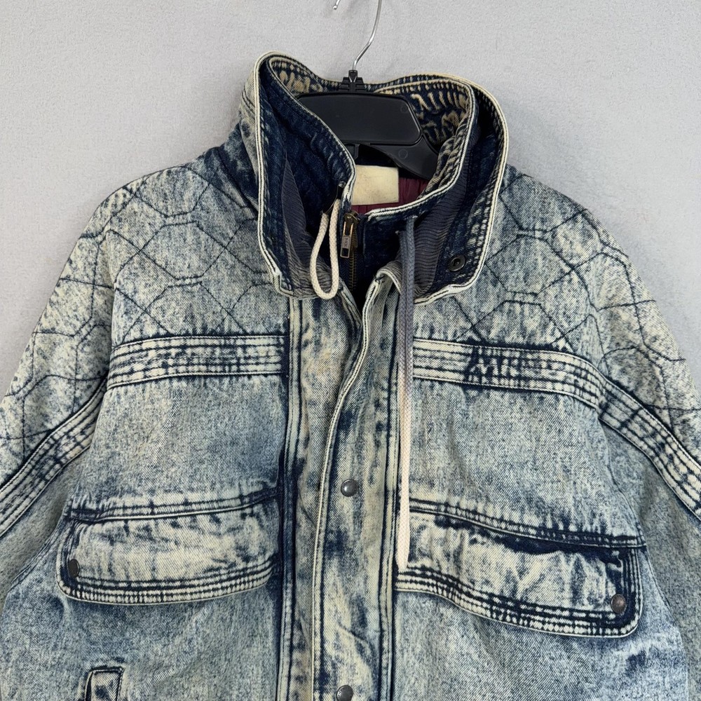 Vintage Urban Equipment Jacket Mens Large Blue Denim Bomber Quilted Elastic 80s Discoloration around collar. Pre-owned vintage Urban Equipment denim bomber jacket with light to moderate overall wear from prior use. Fabric and lining are structurally sound with intact stitching, zipper, snaps, drawcords, and elastic waistband. Multiple small tan discoloration spots are present on the front placket, lower front, pockets, shoulders, sleeve near the cuff, and upper back as shown in photos. Interior size label is missing; size is set to Mens Large. Brand: Urban Equipment. Style: Vintage mens acid wash denim bomber jacket. Color: Light blue stonewash denim with darker navy blue marbling and trim. Size: Mens large. Material: Cotton denim outer shell. Fabric type: Midweight denim with quilted upper body and textured acid wash finish. Details: Tall stand-up collar with inner rib-knit insert and drawcord, full front zipper with snap storm flap, and elasticized waistband. Features: Two front chest flap pockets with snaps, two lower slant hand pockets, adjustable snap cuffs, quilted shoulders and back yoke, and fully lined interior. Branding and logos: Large UE Urban Equipment label on interior lining with geometric graphic design and Urban Equipment wording, noting Division of David Peyser Inc. Lining: Smooth quilted interior in a deep burgundy tone for added warmth and comfort. Intended use: Designed for casual wear, streetwear looks, and layering in cool weather. Special notes: Oversized relaxed fit and bold acid wash treatment capture classic late 1980s denim outerwear style. 25514 Measurements: Previous washings may change sizing on the tag. Refer to photos above for all measurements. Compare our measurements to one of your favorite garments. Measurements are approximate. All items are bagged and sealed after being photographed, then stored in a smoke free environment. Washed per eBay standards. I carefully package and ship daily. Contact me with any questions. Thanks