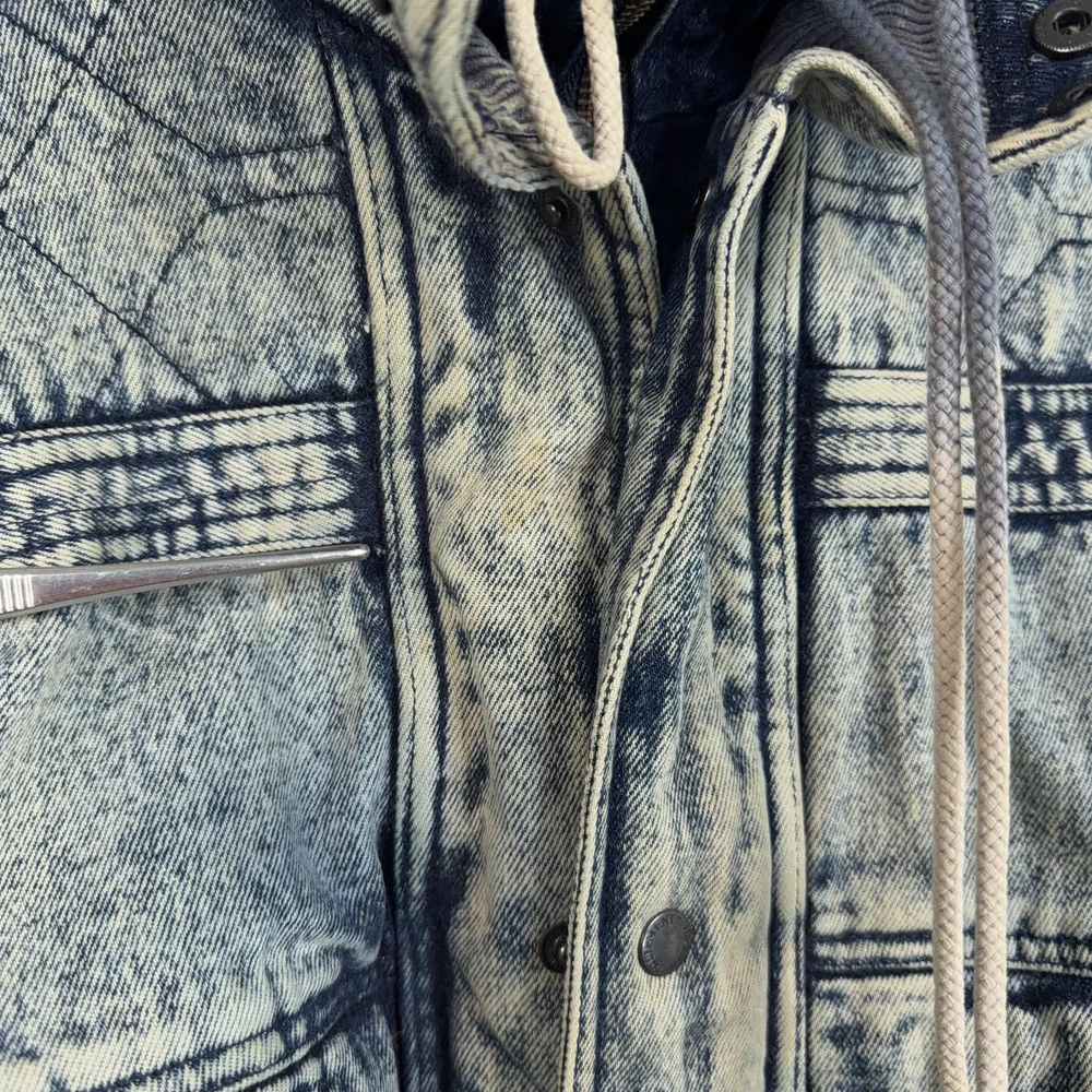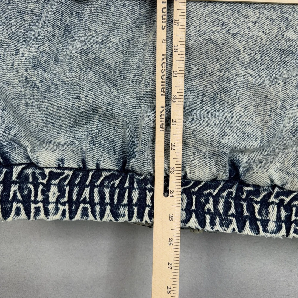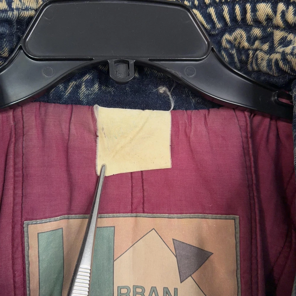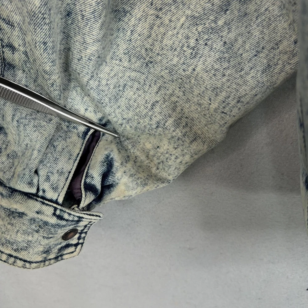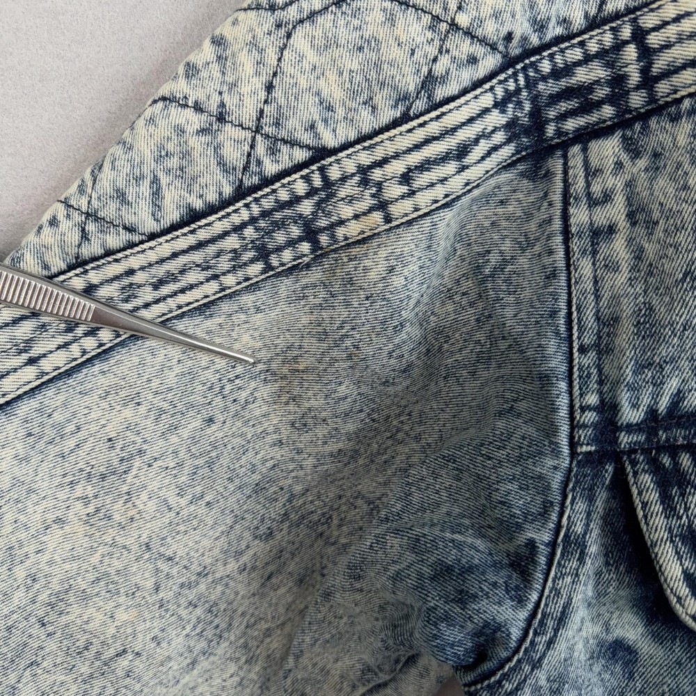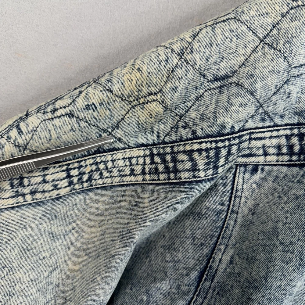 Vintage Urban Equipment Jacket Mens Large Blue Denim Bomber Quilted Elastic 80s Discoloration around collar. Pre-owned vintage Urban Equipment denim bomber jacket with light to moderate overall wear from prior use. Fabric and lining are structurally sound with intact stitching, zipper, snaps, drawcords, and elastic waistband. Multiple small tan discoloration spots are present on the front placket, lower front, pockets, shoulders, sleeve near the cuff, and upper back as shown in photos. Interior size label is missing; size is set to Mens Large. Brand: Urban Equipment. Style: Vintage mens acid wash denim bomber jacket. Color: Light blue stonewash denim with darker navy blue marbling and trim. Size: Mens large. Material: Cotton denim outer shell. Fabric type: Midweight denim with quilted upper body and textured acid wash finish. Details: Tall stand-up collar with inner rib-knit insert and drawcord, full front zipper with snap storm flap, and elasticized waistband. Features: Two front chest flap pockets with snaps, two lower slant hand pockets, adjustable snap cuffs, quilted shoulders and back yoke, and fully lined interior. Branding and logos: Large UE Urban Equipment label on interior lining with geometric graphic design and Urban Equipment wording, noting Division of David Peyser Inc. Lining: Smooth quilted interior in a deep burgundy tone for added warmth and comfort. Intended use: Designed for casual wear, streetwear looks, and layering in cool weather. Special notes: Oversized relaxed fit and bold acid wash treatment capture classic late 1980s denim outerwear style. 25514 Measurements: Previous washings may change sizing on the tag. Refer to photos above for all measurements. Compare our measurements to one of your favorite garments. Measurements are approximate. All items are bagged and sealed after being photographed, then stored in a smoke free environment. Washed per eBay standards. I carefully package and ship daily. Contact me with any questions. Thanks