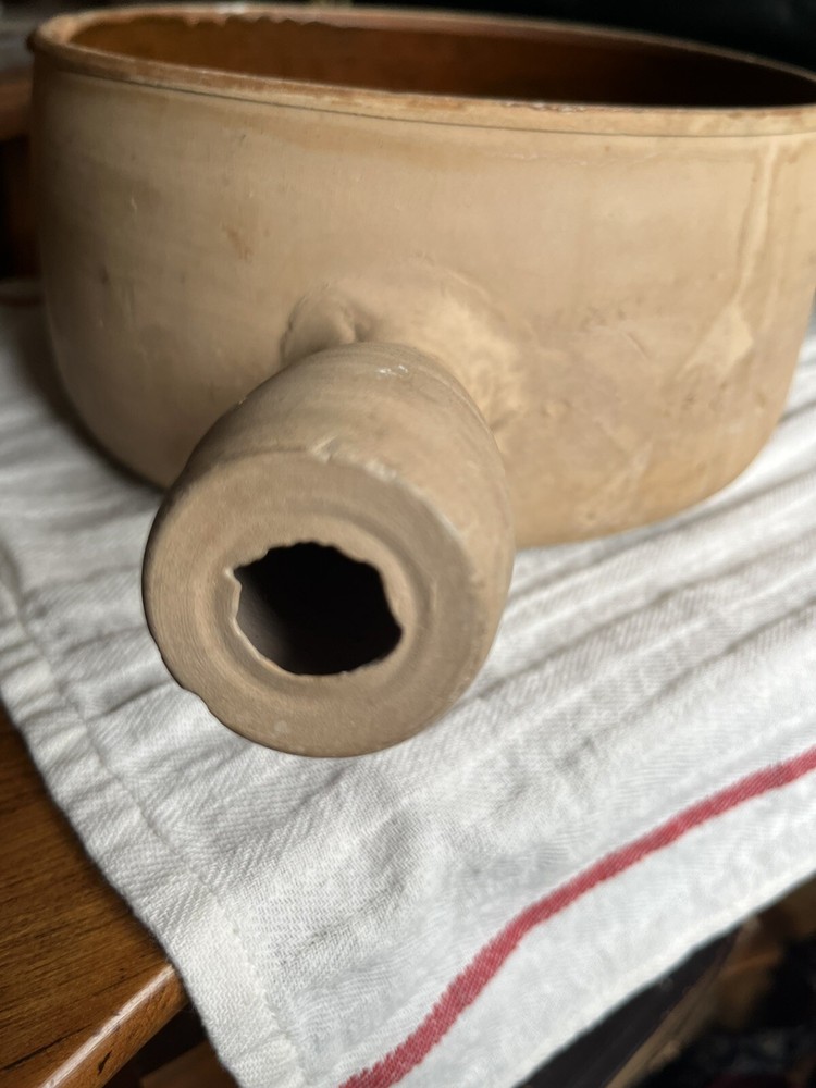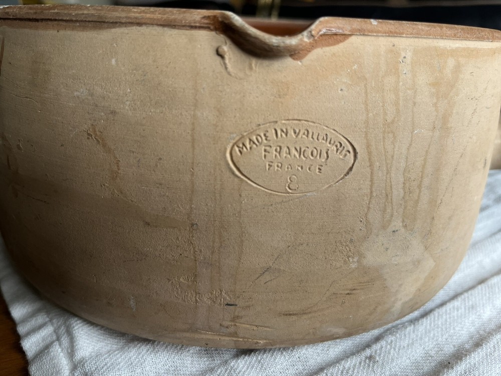 Add a touch of vintage charm to your kitchen with this beautiful Vallauris casserole pan. Made in France from high-quality terracotta, this round pot features a vibrant orange color and a ceramic surface coating that makes it suitable for gas and induction stoves. The pot comes with a handle for easy handling. Perfect for slow cooking and serving, this original Vallauris pot is a collectible item that will add character to any kitchen. Please see photos as part of description. Signs of age and use.