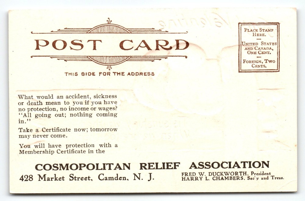 UNUSUAL CARD with custom advertising on back from Cosmopolitan Relief Association in Camden, New Jersey. Unposted. Antique original vintage post card. Has corner creases, dings, and age wear. Stock #VAL189. Additional postcards are in our store. Use cart to bundle and save. All post cards are old originals and may or may not have writing on back.