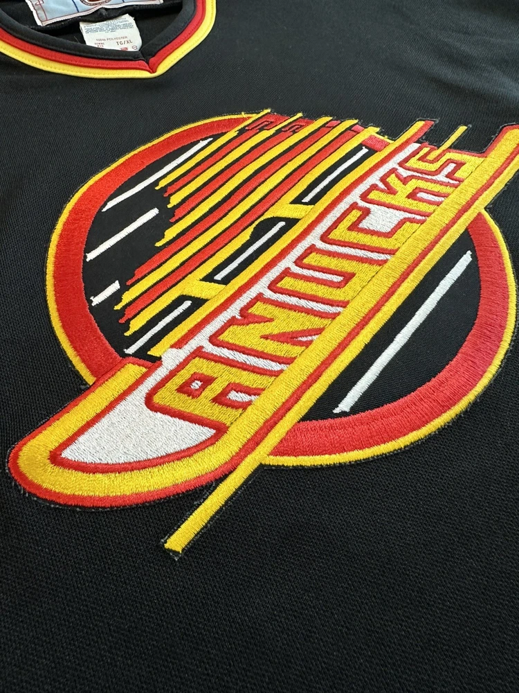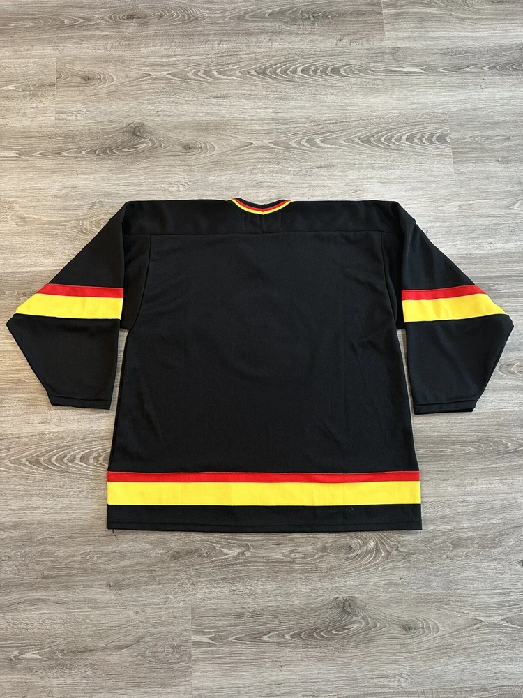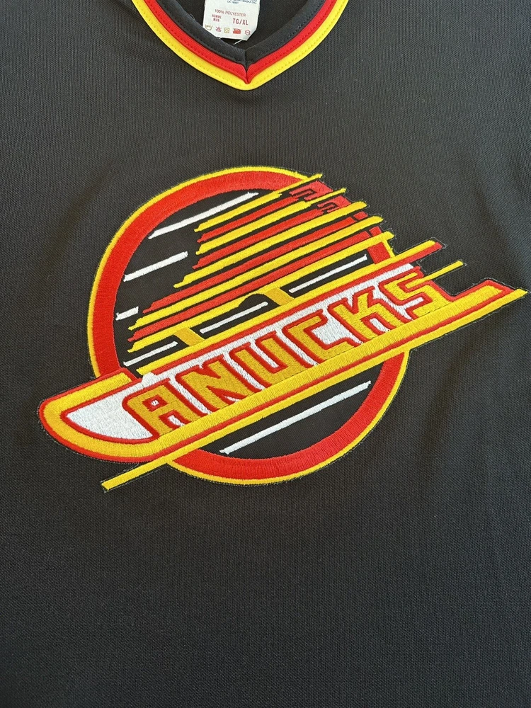 Celebrate the Vancouver Canucks in style with this vintage CCM Black Skate NHL Hockey Jersey. Made for men in size XL, this officially licensed jersey is perfect for any hockey fan. The classic black color and authentic design make it a must-have for any Canucks fan. Show your team spirit during the regular season with this jersey. Measurements shown in photos.