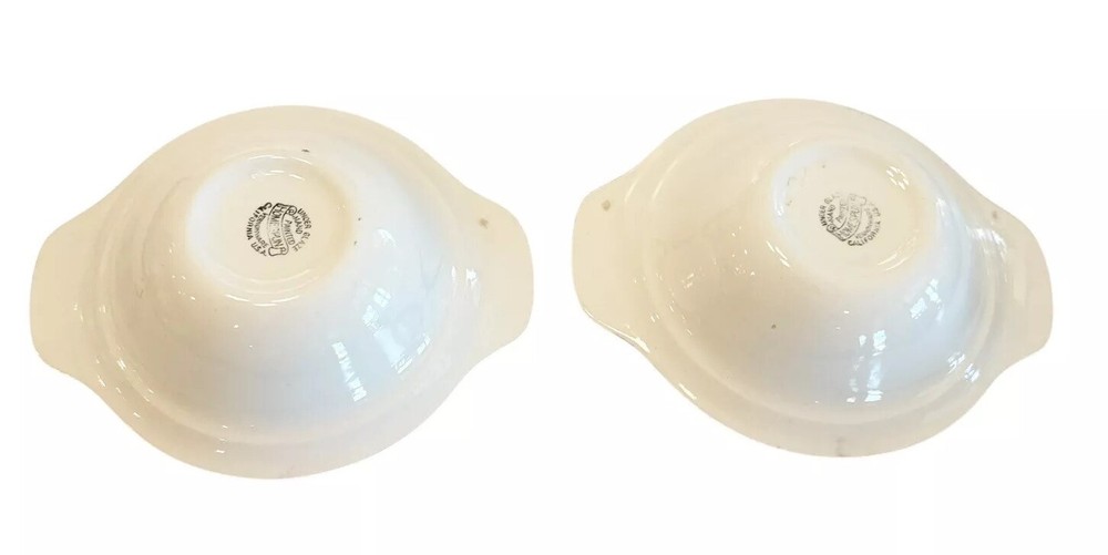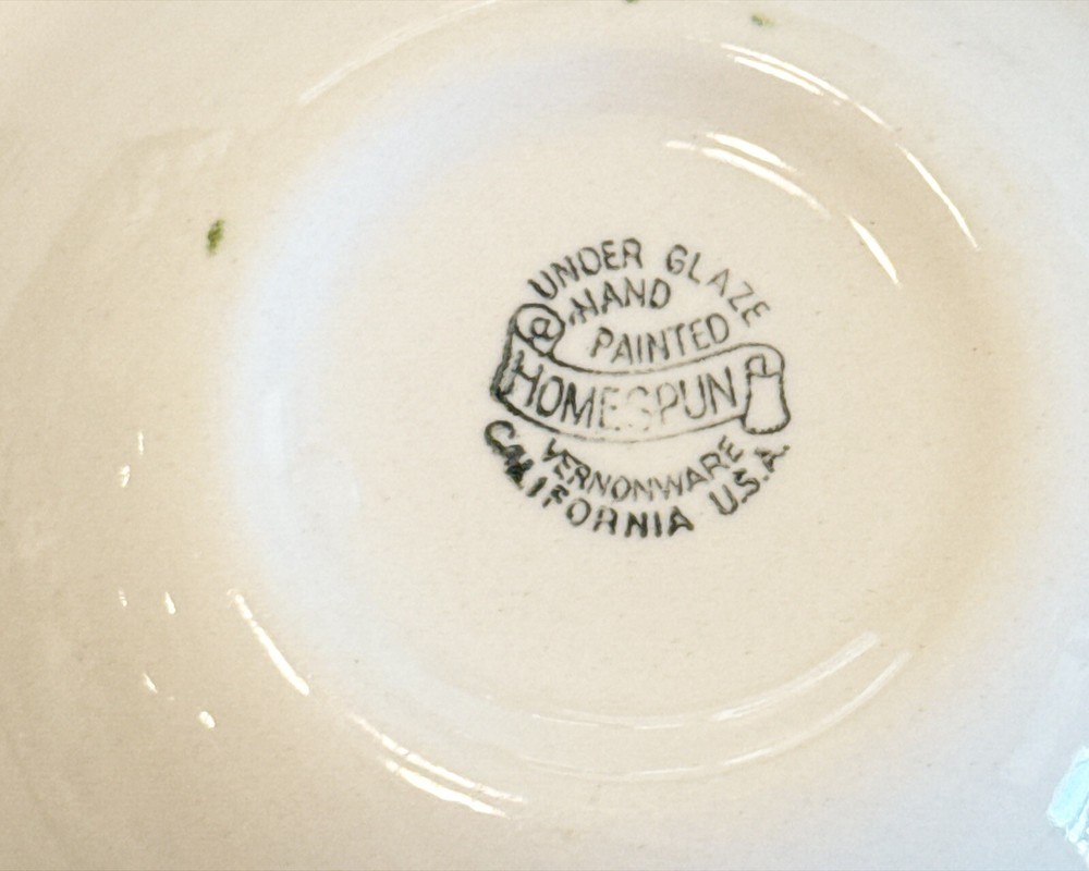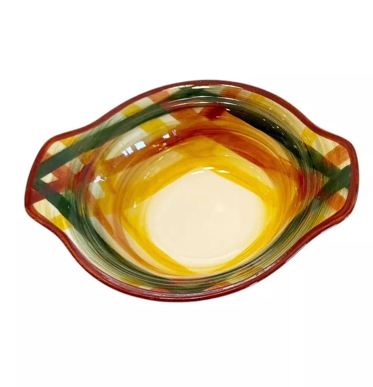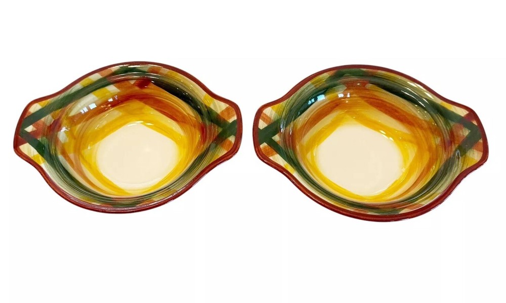 This is a set of two vintage Vernon Kilns USA Vernonware Gingham Tab Handle Bowls from the 1950s. The bowls are round in shape with a brown rim and a green, yellow, and white hand-painted vintage pattern. They are part of the Homespun product line and feature a glossy finish. These decorative bowls are suitable for all occasions and are meant for adult use, with a production style of art pottery in the Mid-Century Modern style. Measurements approx 7.25" L x 6" W x 2" H S moke free home Please visit my store at https://www.ebay.com/str/theuniqueredhead and subscribe. Thank you for your consideration. Please message me if you have any questions. I do combined shipping on my items in the store