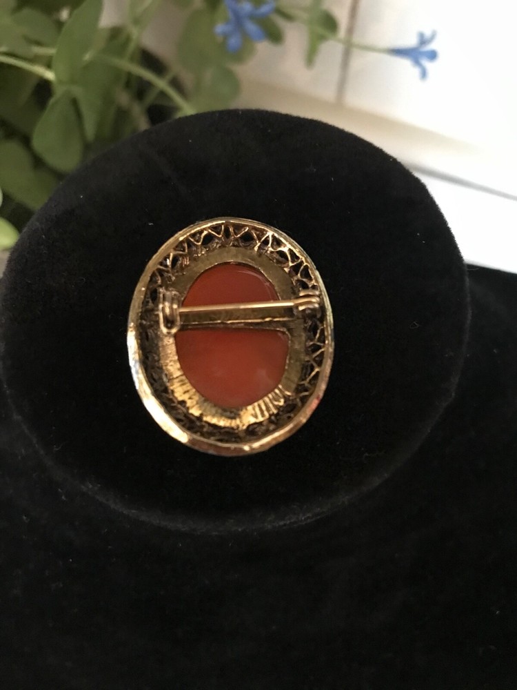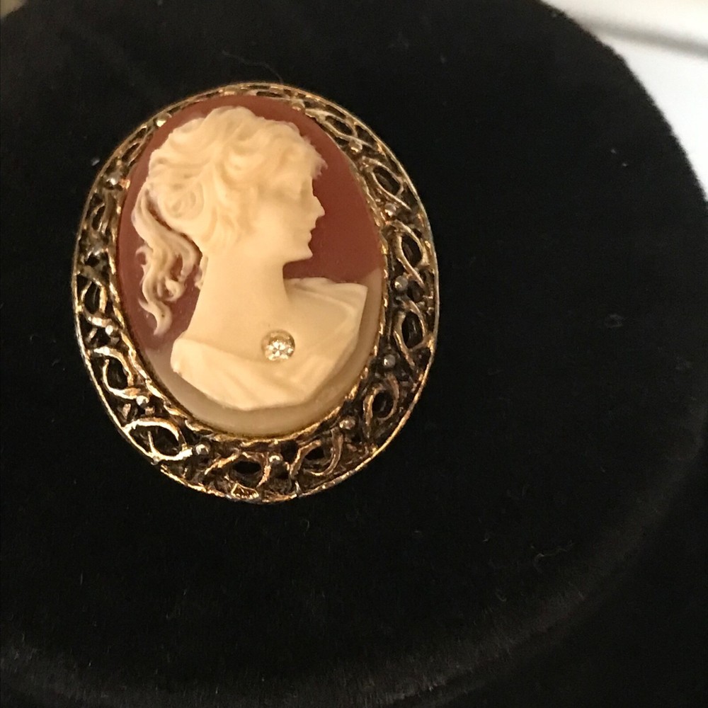 This vintage brooch is unsigned Gerry's or a replica and features a Victorian Lady carved cameo design adorned with a rhinestone. The brooch is in a gold color with a cream-colored main stone. It is a vintage piece, adding a touch of antique charm to any outfit. This elegant accessory would be a lovely addition to any jewelry collection, perfect for those who appreciate vintage and antique jewelry pieces. The brooch measures 1 ⅛" x ⅞".
