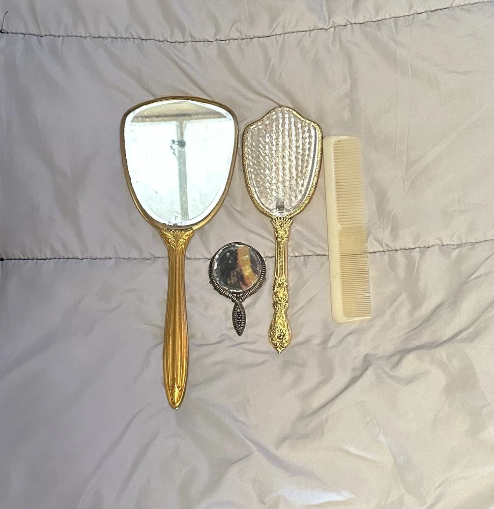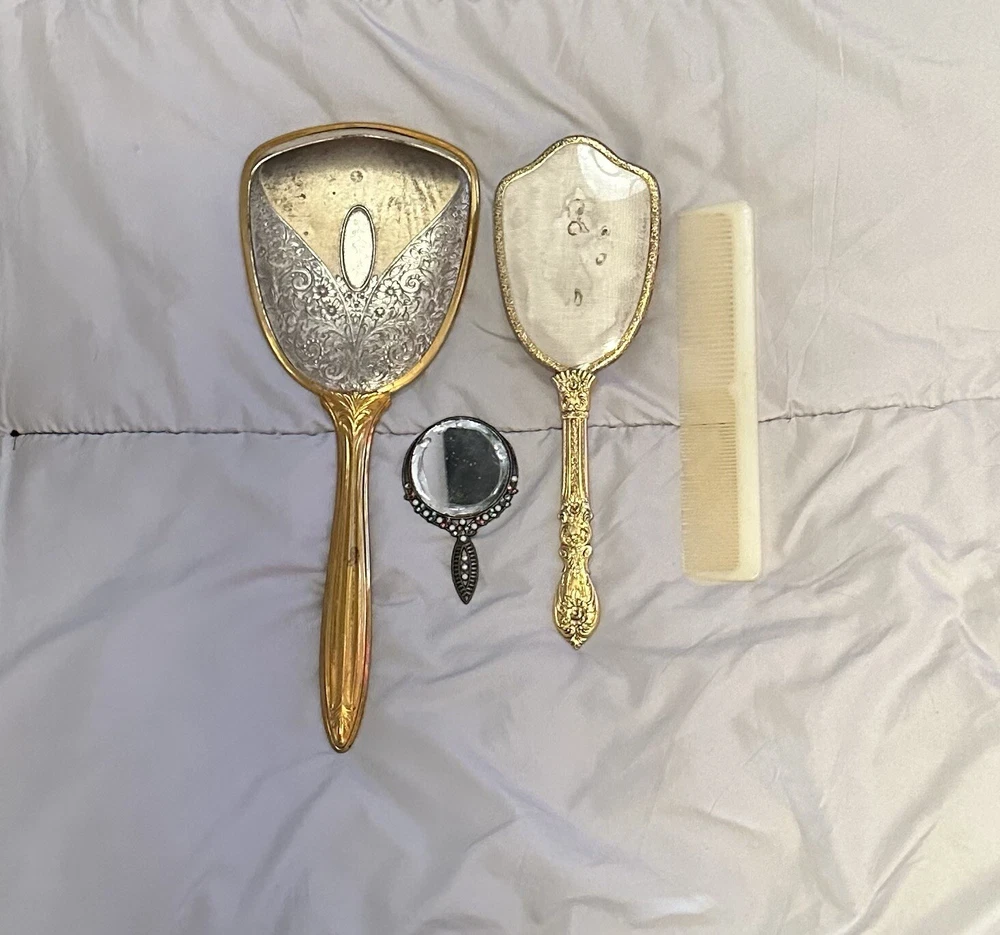 Vintage Victorian Hand Held Metal Vanity Mirrors, Hair Brush & Comb