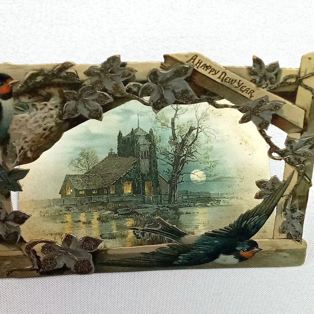 Vintage Victorian Happy New Years Card Bird Frame Overlay Detailed