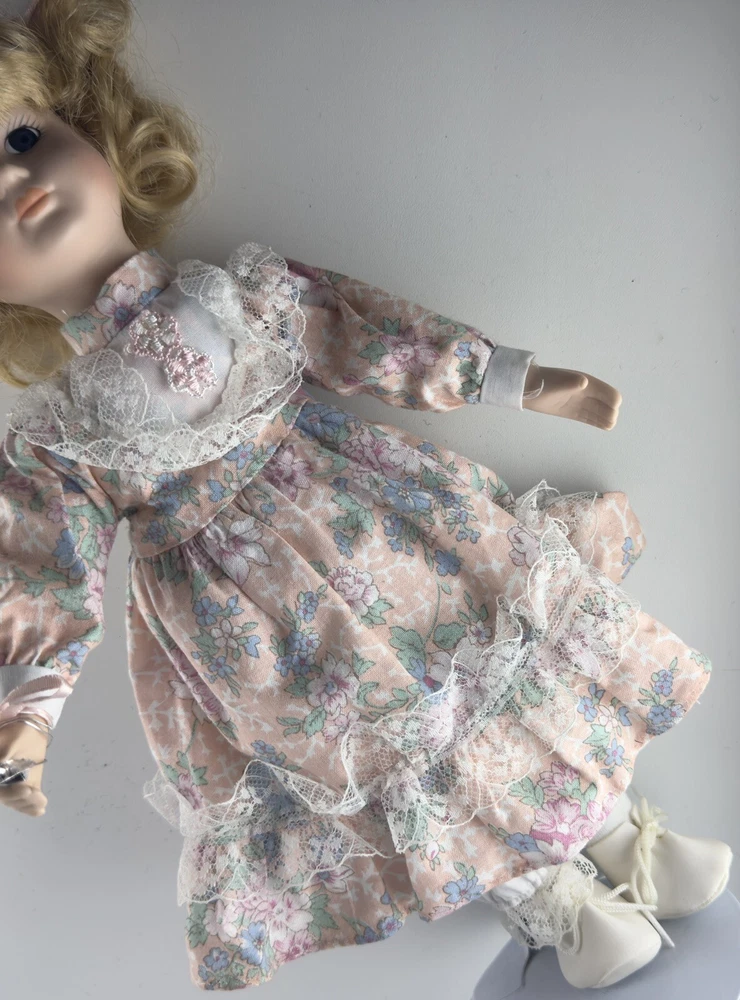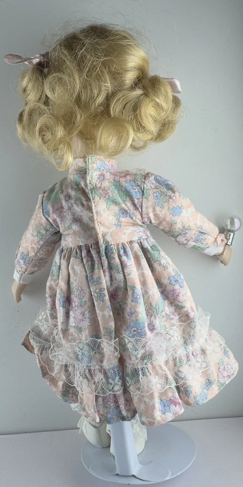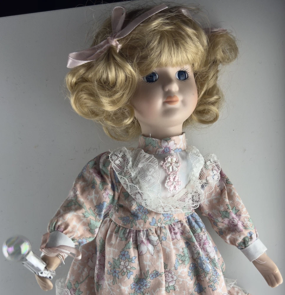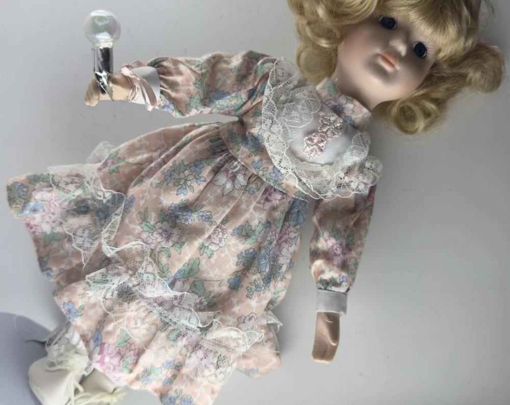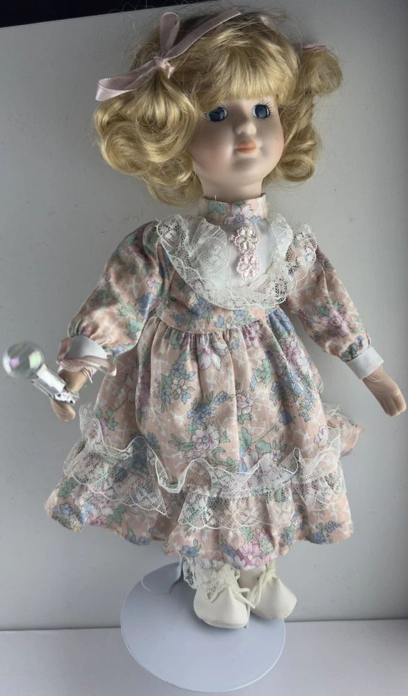 Included is the doll with outfit and stand. Has some wear, see all photos. Approximately 12” tall. Soft body, porcelain head.