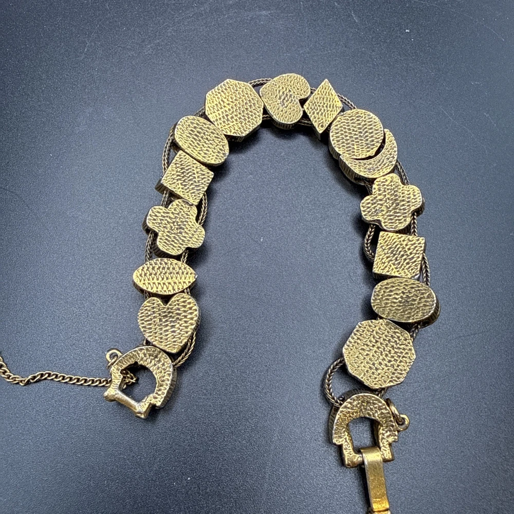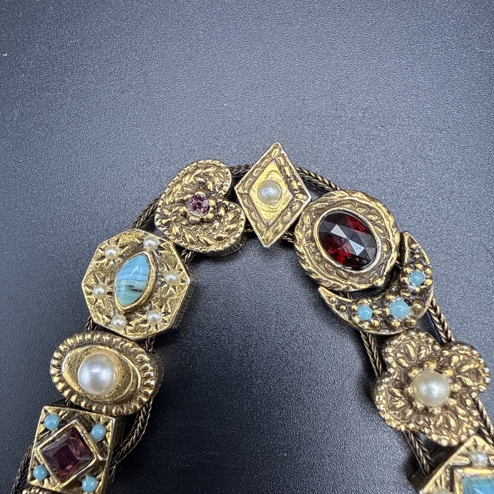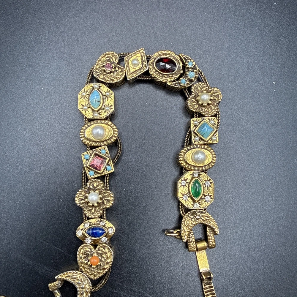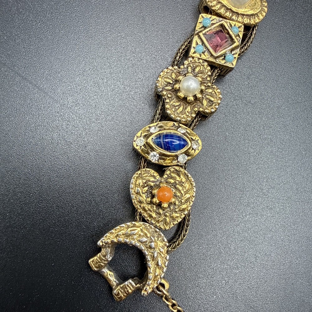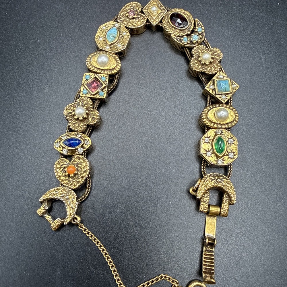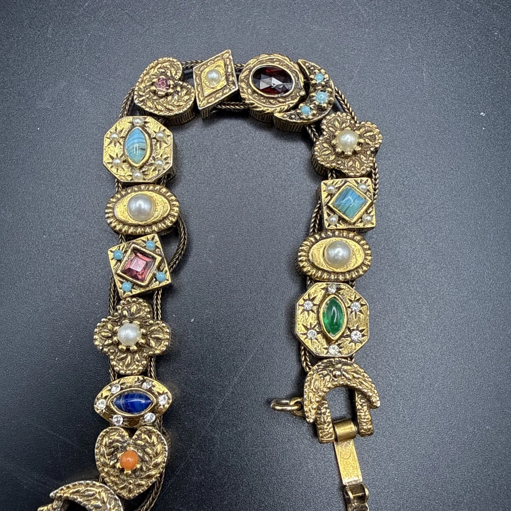 This Vintage Victorian Revival Charm Slide Bracelet by Goldette features a beautiful multicolor rhinestone charm set in a gold bezel. The slide bracelet is 7 inches in length and is a unique piece of fashion jewelry inspired by the Victorian era. Made in the United States, this charming bracelet adds a touch of elegance to any outfit with its vintage style and classic design. Perfect for women who appreciate unique and timeless accessories, this bracelet is sure to become a cherished addition to any jewelry collection. Unsigned Goldette