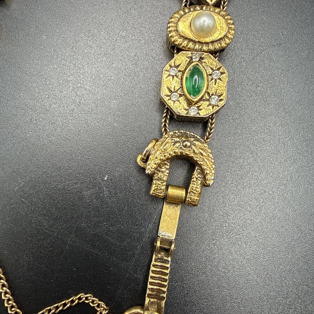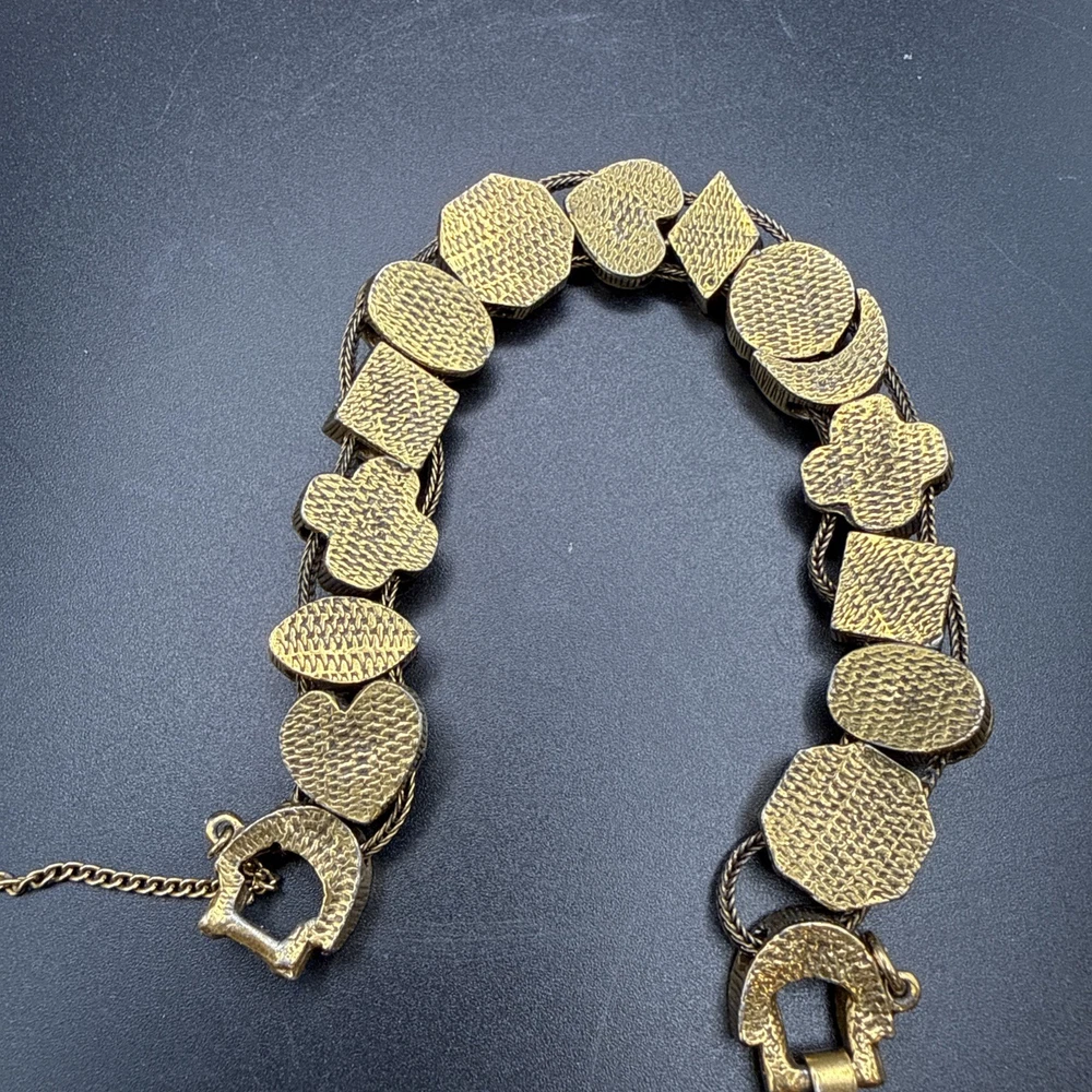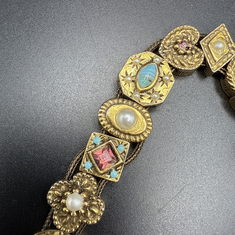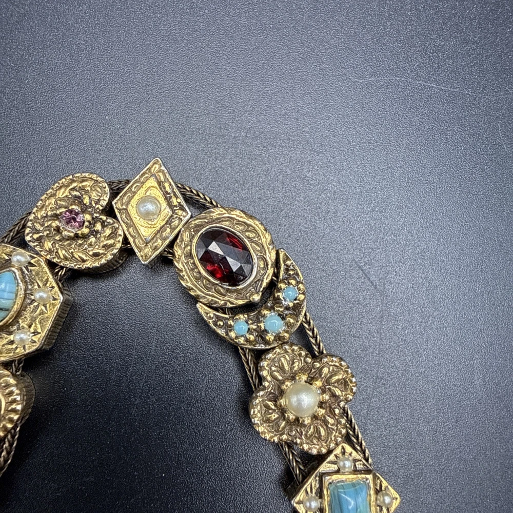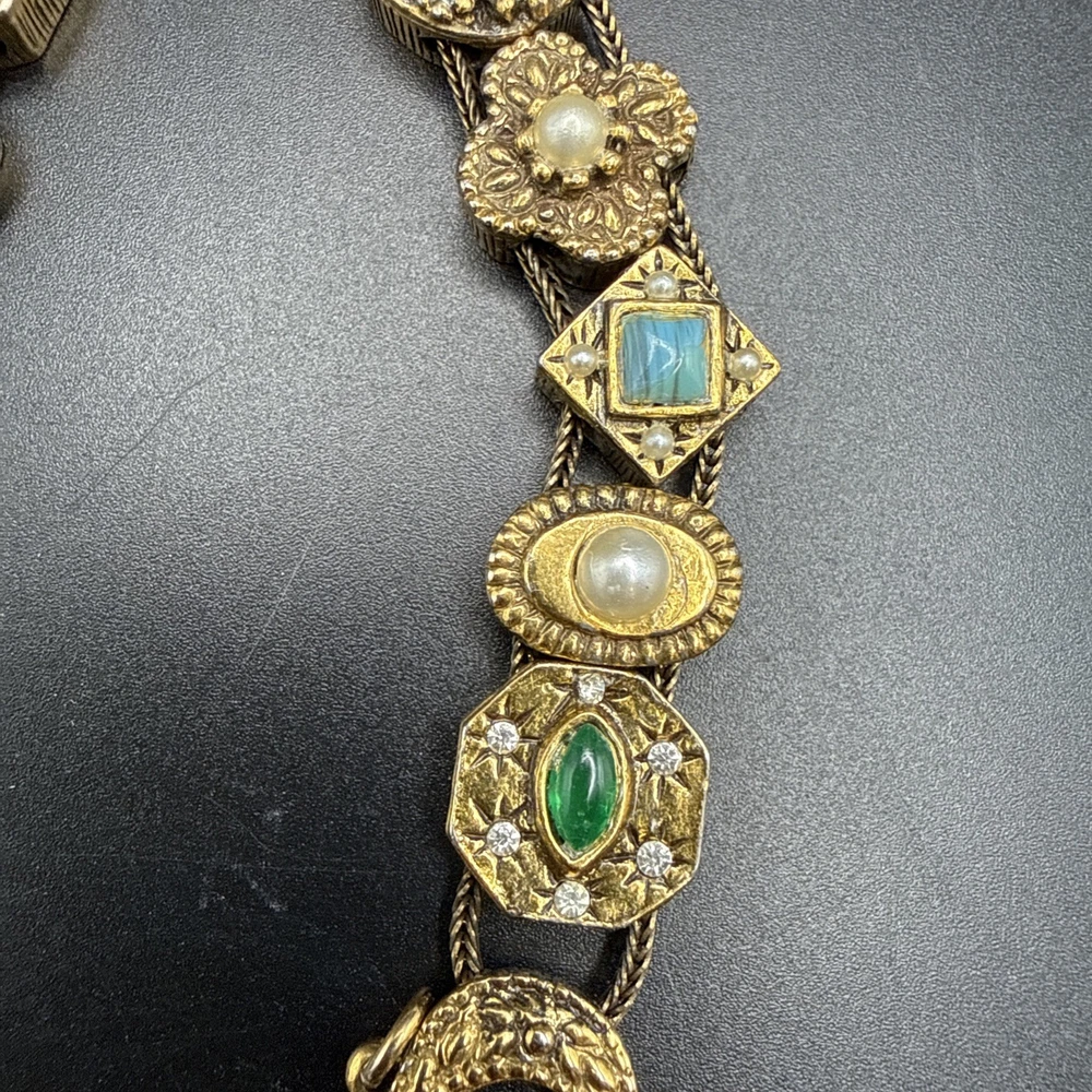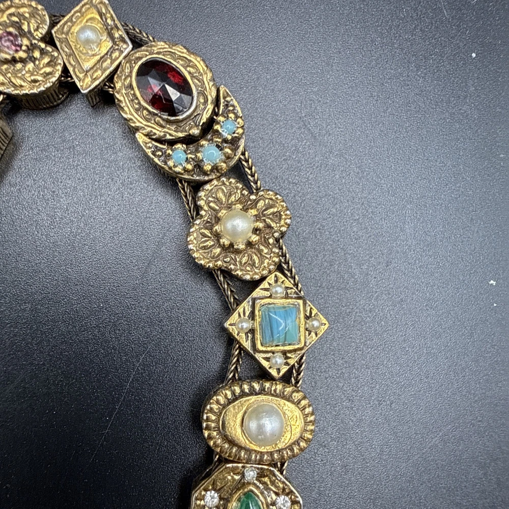 This Vintage Victorian Revival Charm Slide Bracelet by Goldette features a beautiful multicolor rhinestone charm set in a gold bezel. The slide bracelet is 7 inches in length and is a unique piece of fashion jewelry inspired by the Victorian era. Made in the United States, this charming bracelet adds a touch of elegance to any outfit with its vintage style and classic design. Perfect for women who appreciate unique and timeless accessories, this bracelet is sure to become a cherished addition to any jewelry collection. Unsigned Goldette
