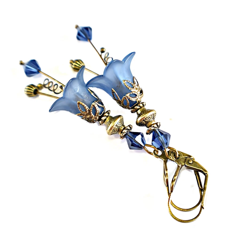 These vintage look flower earrings are so pretty and delicate; really striking. The bold 6mm bicone crystal accents on top and bottom really make them sparkle! This classic look makes these a great bridal party gift or accessory, or a wonderful gift for any occasion. Or just for you ... Available in 20 colors. 2 inches long Lever back antique bronze ear wires Lead free/nickel free Available Colors: Emerald Green Siam Red Pale Pink Navy Blue Light Blue Royal Blue Denim Blue Aqua Blue Dark Prussian Blue Teal Chocolate Brown Peach Peridot Green Purple Lilac Fuchsia Violet Yellow Black White