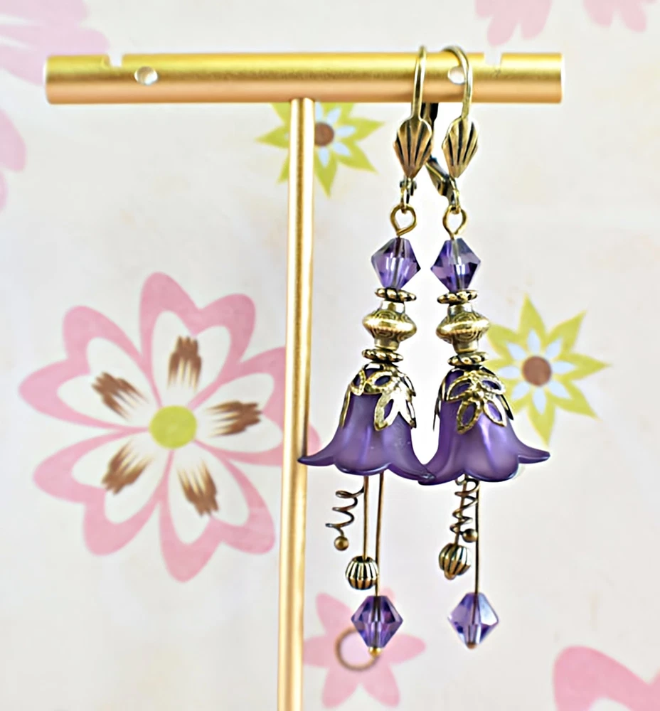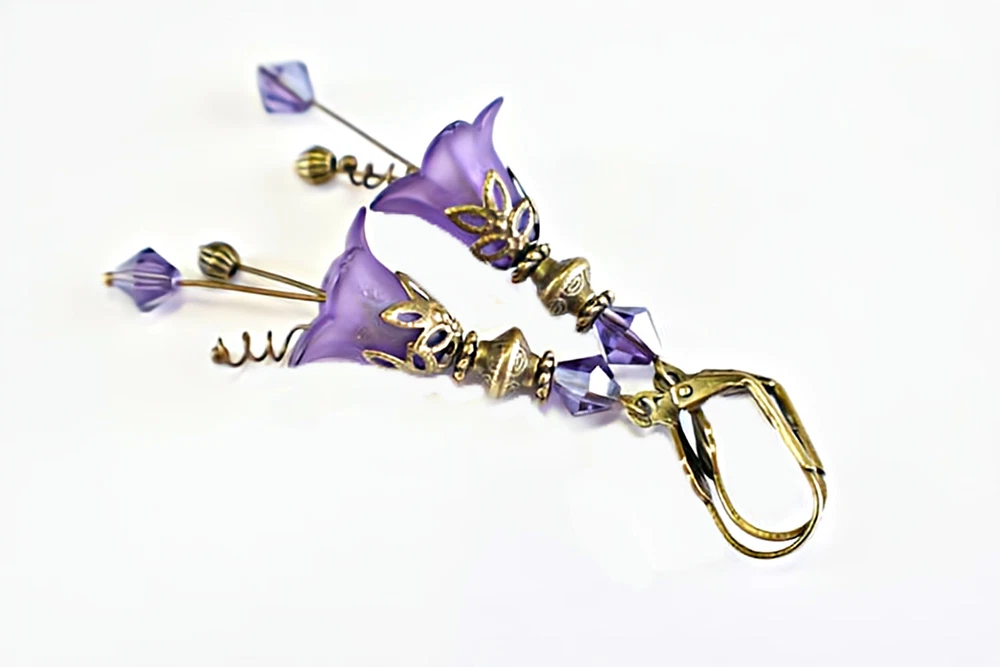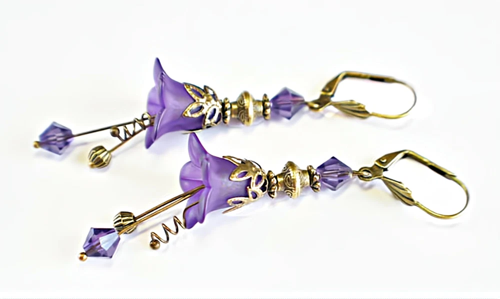 Vintage Victorian Style Purple Velvet and Antique Bronze Bell Flower Lucite Earrings These vintage look flower earrings are so pretty and delicate; really striking. The bold 6mm bicone crystal accents on top and bottom really make them sparkle! This classic look makes these a great bridal party gift or accessory, or a wonderful gift for any occasion. Or just for you ... Available in 20 colors. 2 inches long Lever back antique bronze ear wires Lead free/nickel free Available Colors: Emerald Green Siam Red Pale Pink Navy Blue Light Blue Royal Blue Denim Blue Aqua Blue Dark Prussian Blue Teal Chocolate Brown Peach Peridot Green Purple Lilac Fuchsia Violet Yellow Black White