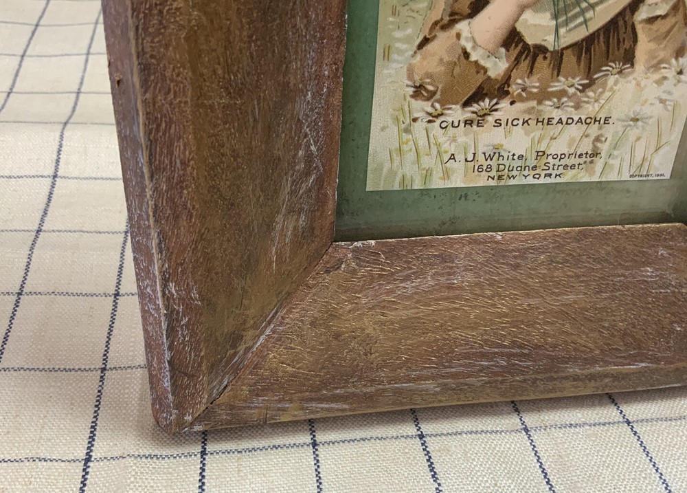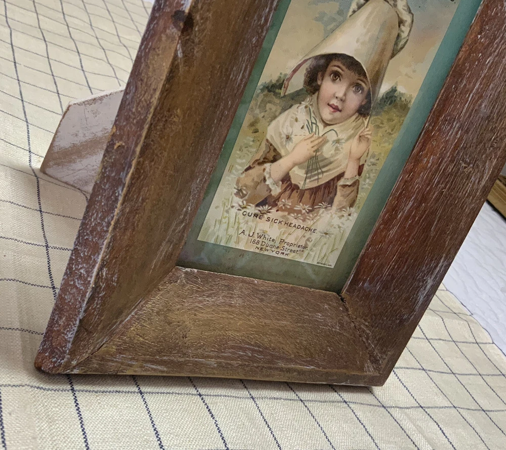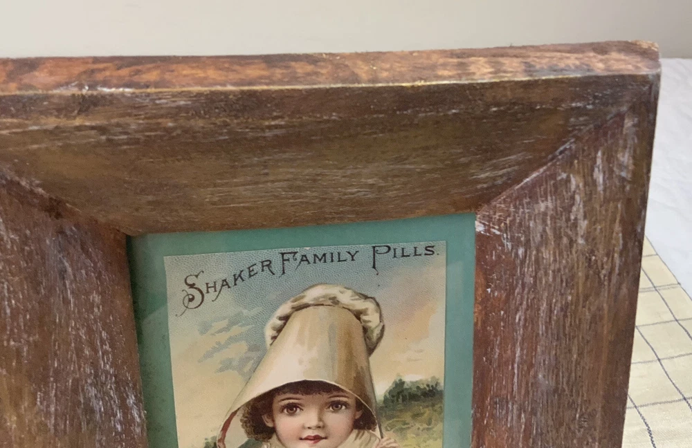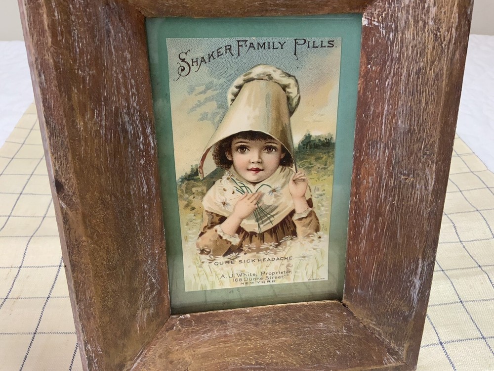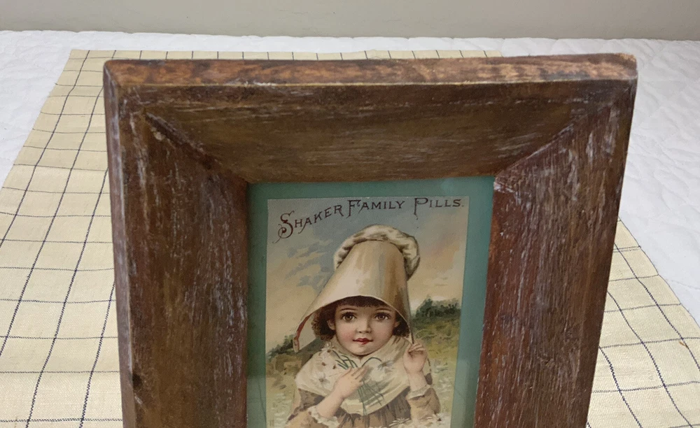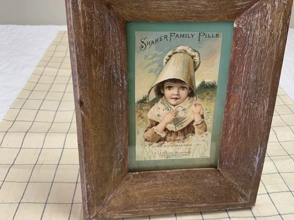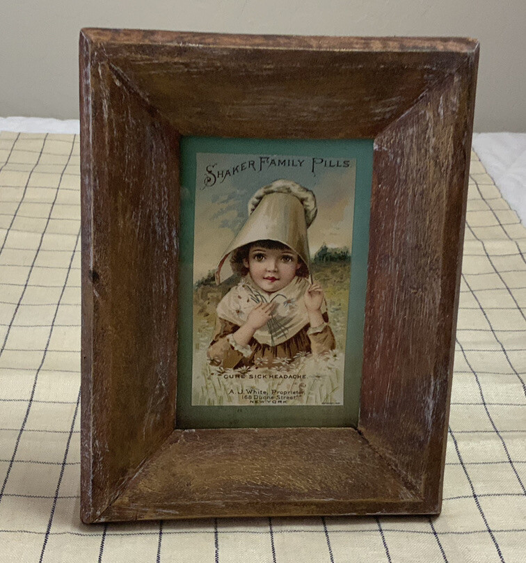 Up for sale is a vintage/antique framed Victorian trade card. This trade card design is Young lady with hat. Advertising Shaker Family Pills - cure Sick Headache. NY. From the early 1900’s. The frame is wood - dark brown distressed finish. With glass. The colors are aqua, brown, flesh, beige, red, blue, multi. Measures 6 3/4” by 8 3/4”. Very, very nice Victorian art. Thanks and happy shopping. I will combine shipping. Please visit my ebay store: webbsamericancounry1 for over 2000 vintage and collectible items.
