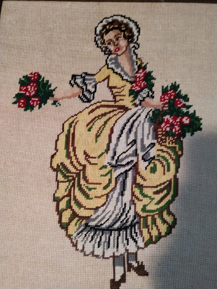 Vintage Gorgeous Victorian woman with bouquet of flowers needlepoint framed. Perfect condition Excellent condition and ready to hang.