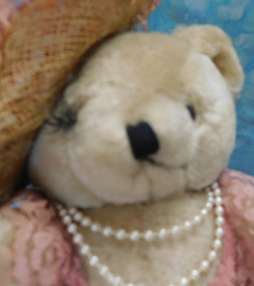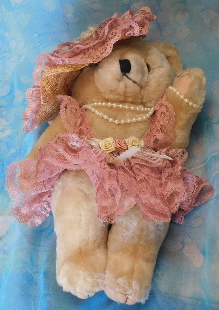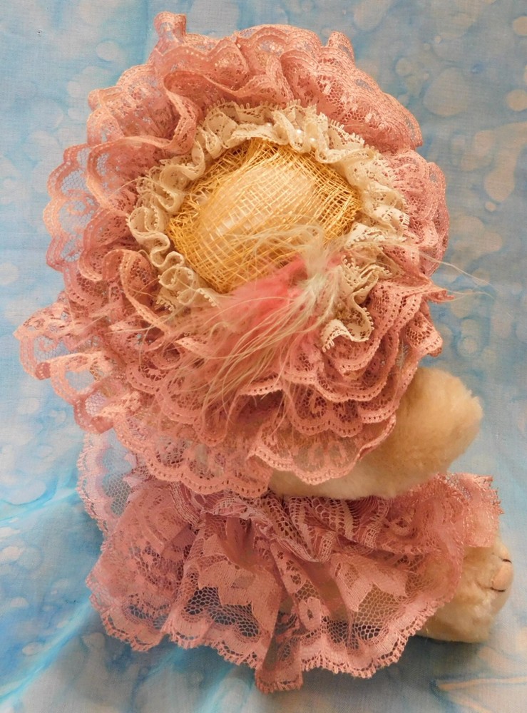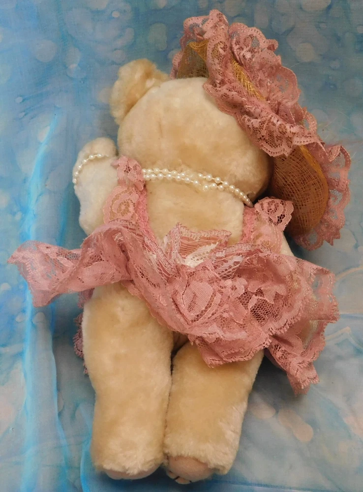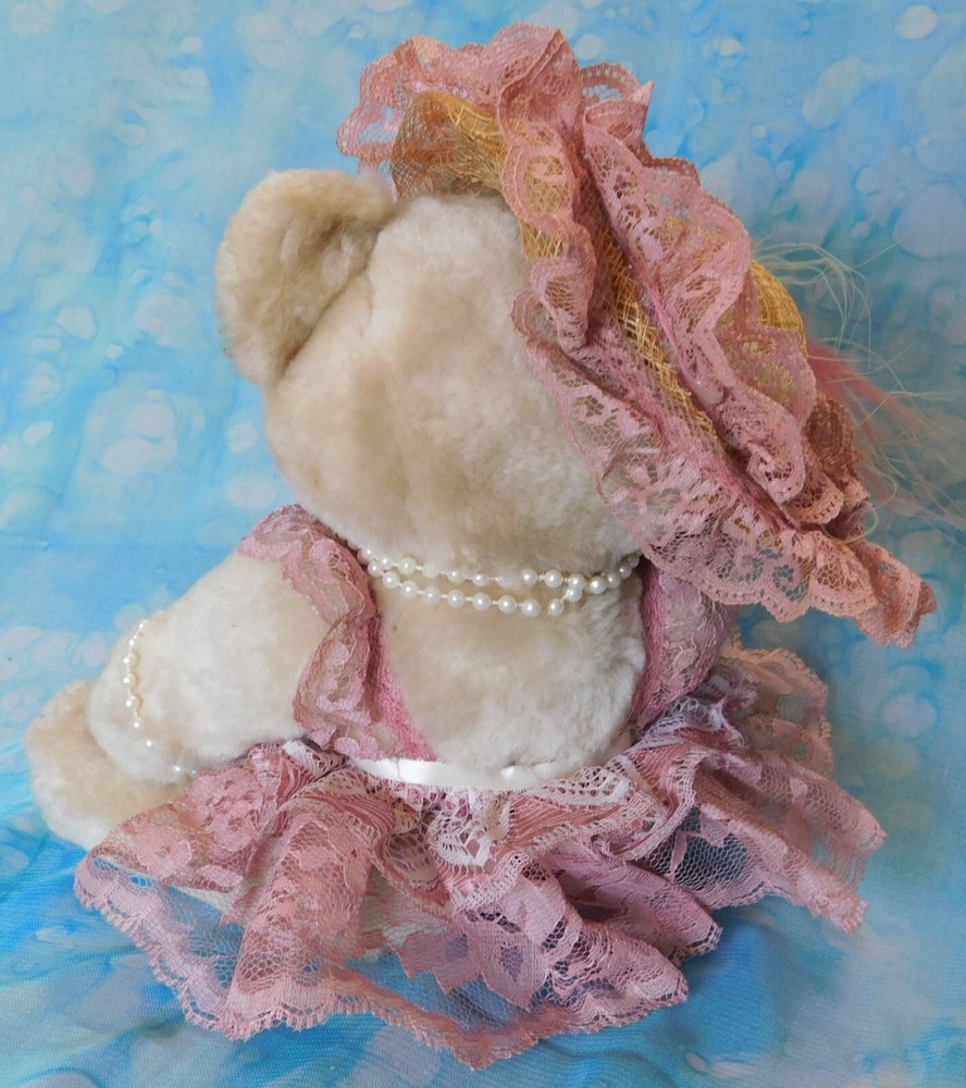 This bear may or may not be handmade. I cannot tell for sure. There are no maker's tags. The arms and legs are movable. The hat, clothing and beads are non-removable. I have had this bear over 25 years but do not know the year it was actually made. Plea se see condition description and photos. Ask any questions prior to purchase. Thank you for considering this item. Combined shipping is available when possible. stock note: A-14