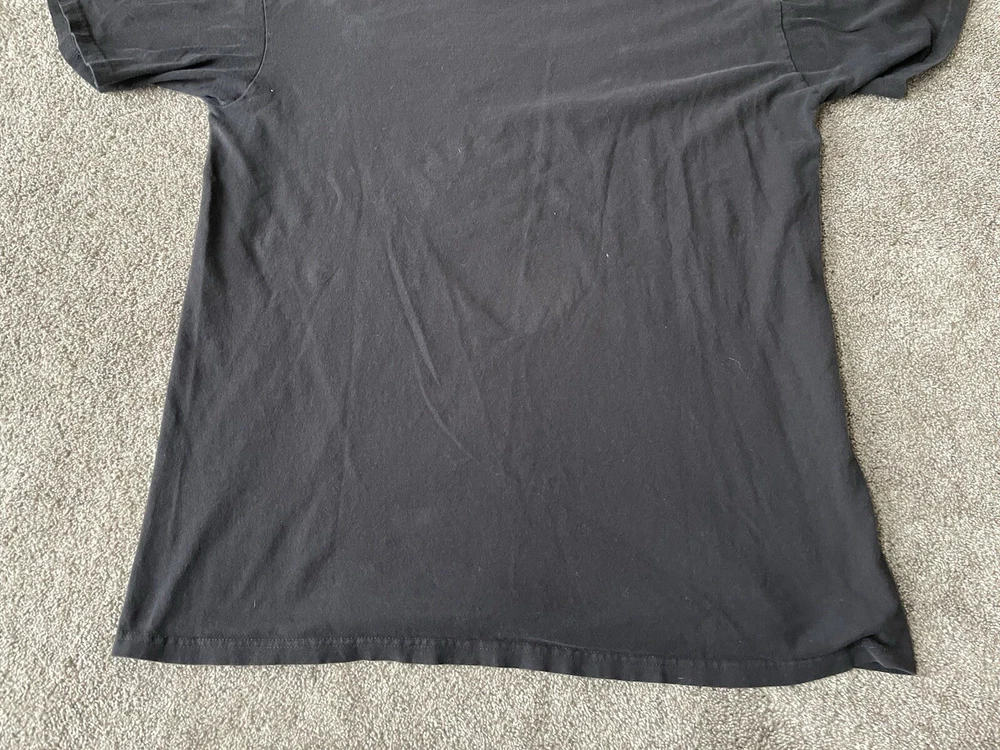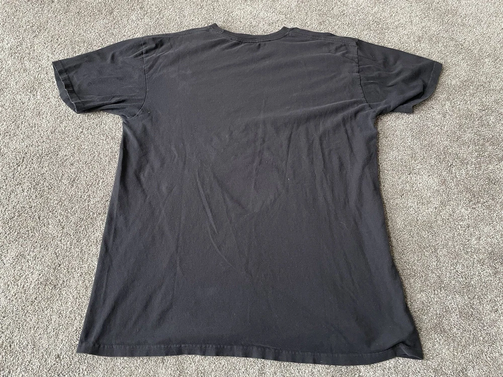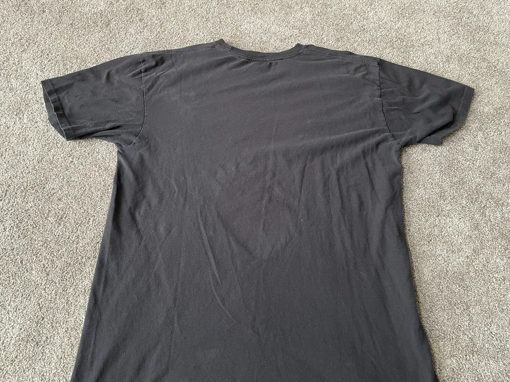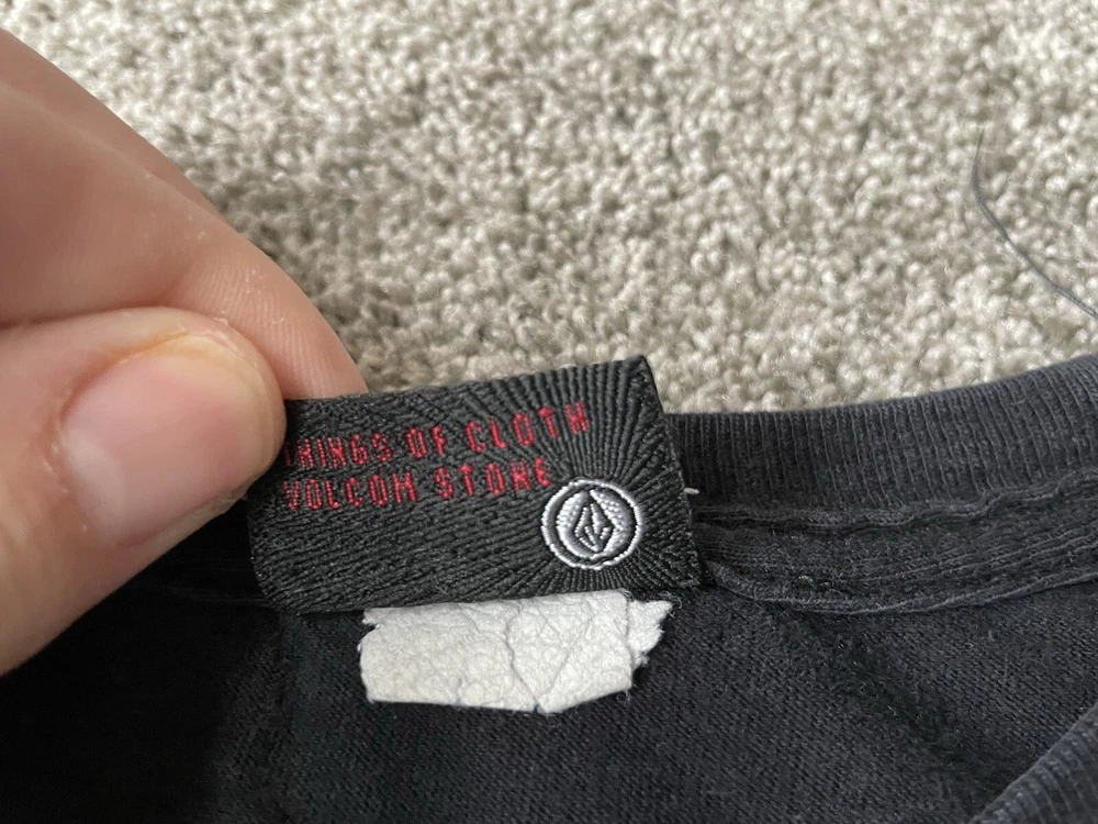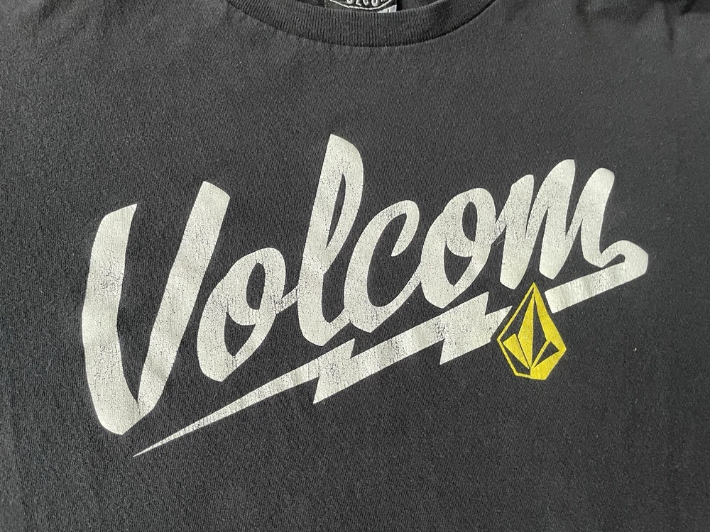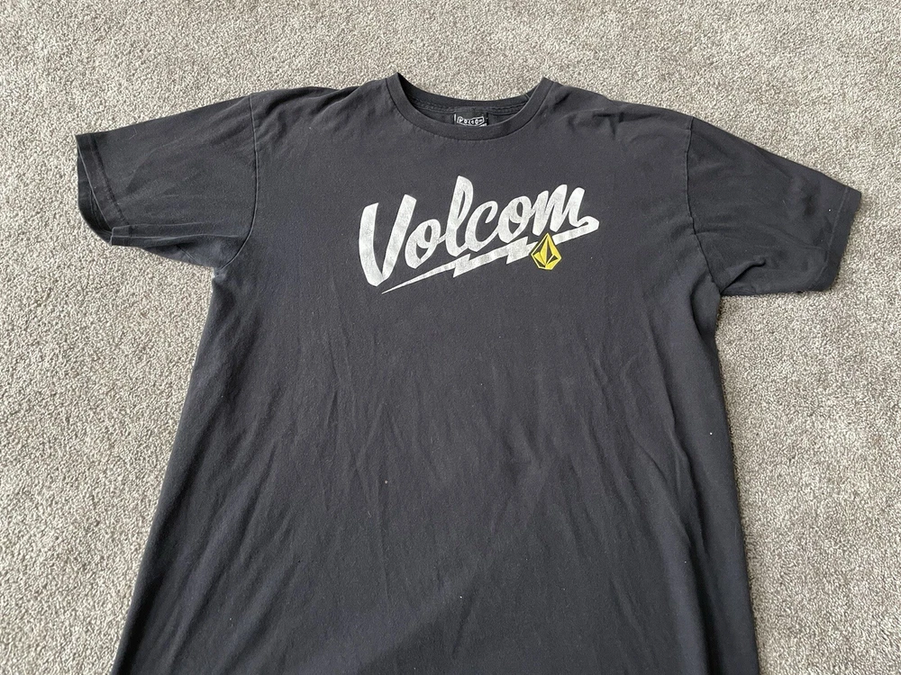 This is a vintage Volcom T-shirt for men, size large, in black with a graphic print. It has short sleeves and a crew neck, made of cotton with a knit fabric type. The shirt features a classic and retro theme with accents of the Volcom logo. It is machine washable and easy to care for, preshrunk, collarless, and suitable for all seasons. The shirt is vintage and was manufactured in the 2000s, perfect for skaters and those who love grunge and punk styles.