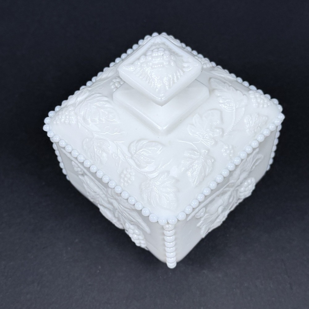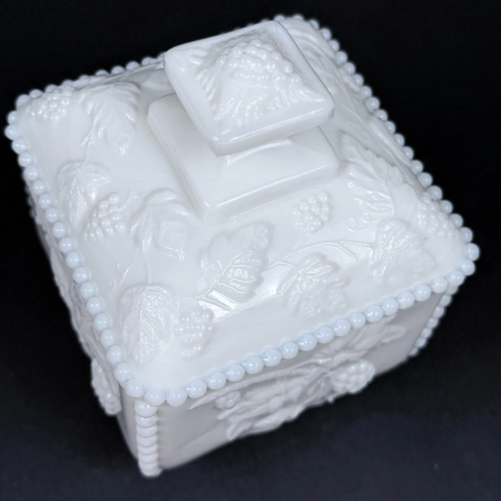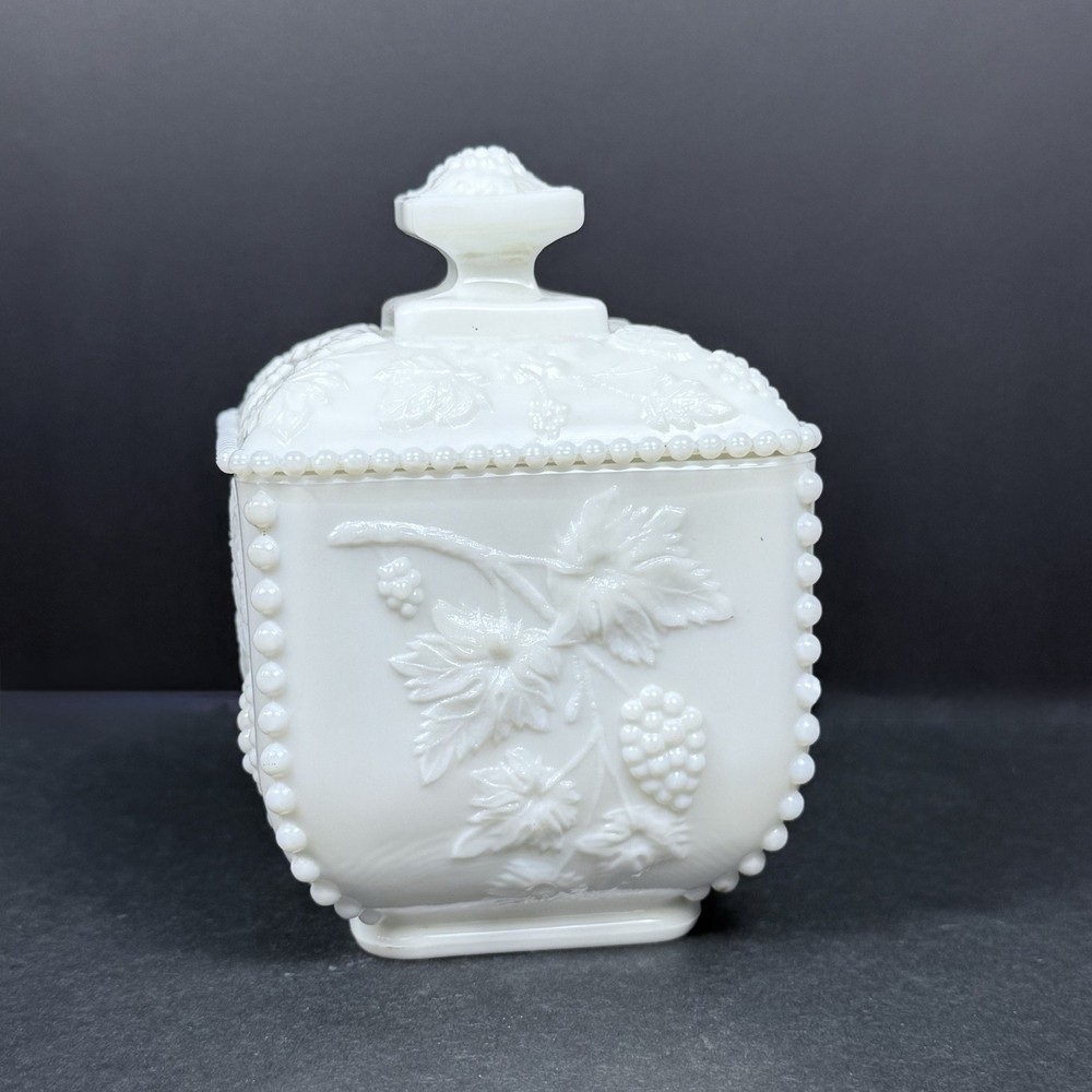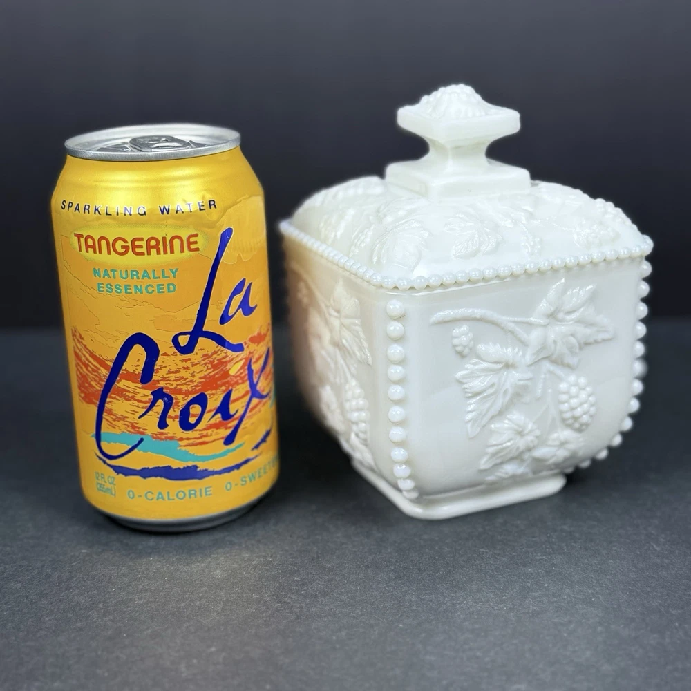 Pattern: Beaded Grape, featuring raised relief grapevine and leaf design Shape: Square with a beaded edge and a lid topped with a grape cluster finial Size: Approximately 5.25 inches tall with the lid on and 3.75 inches square Perfect for candy and a sweet decor down wedding and baby showers and just everyday decor. No chips or cracks. Let me know what questions you have! Blessings to you.. π€π€π€π€π€π€ππ€π€π€
