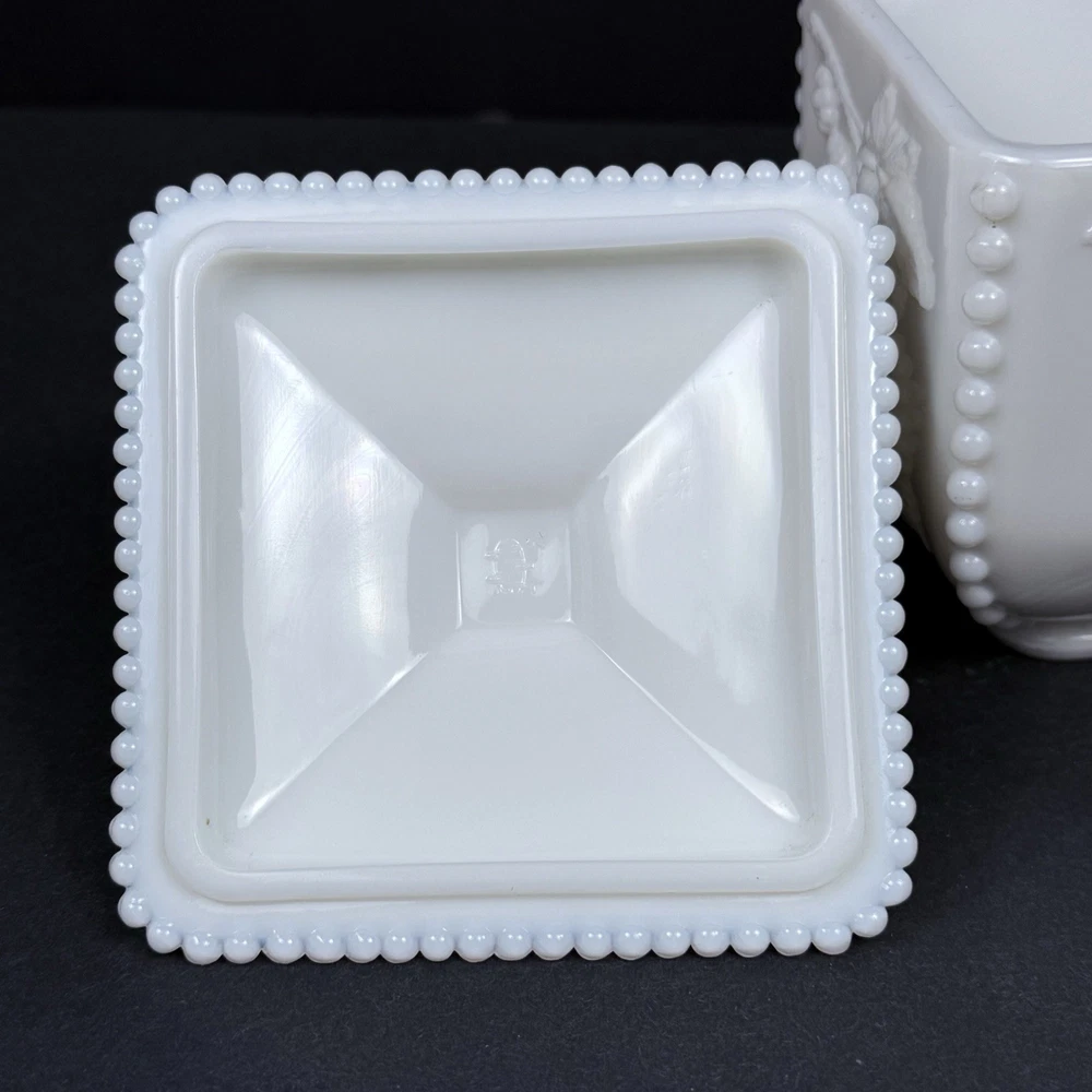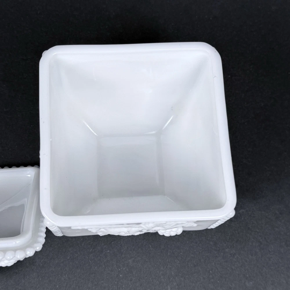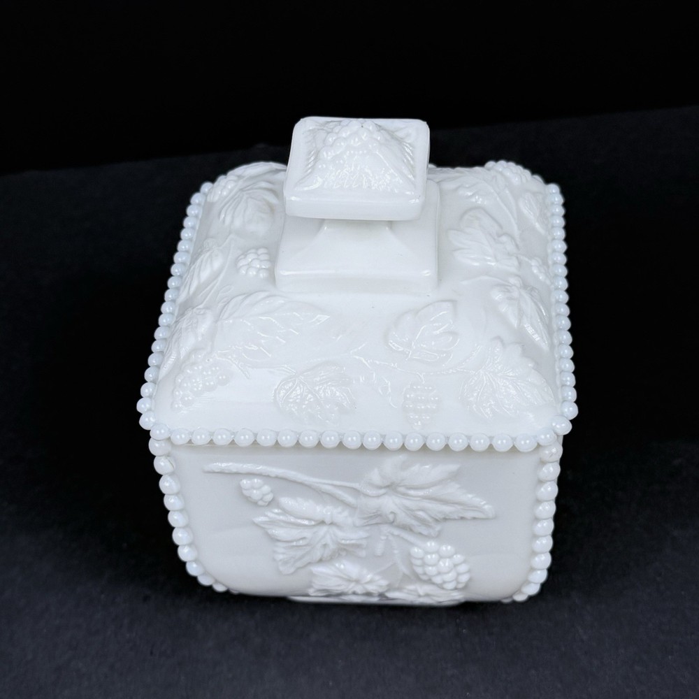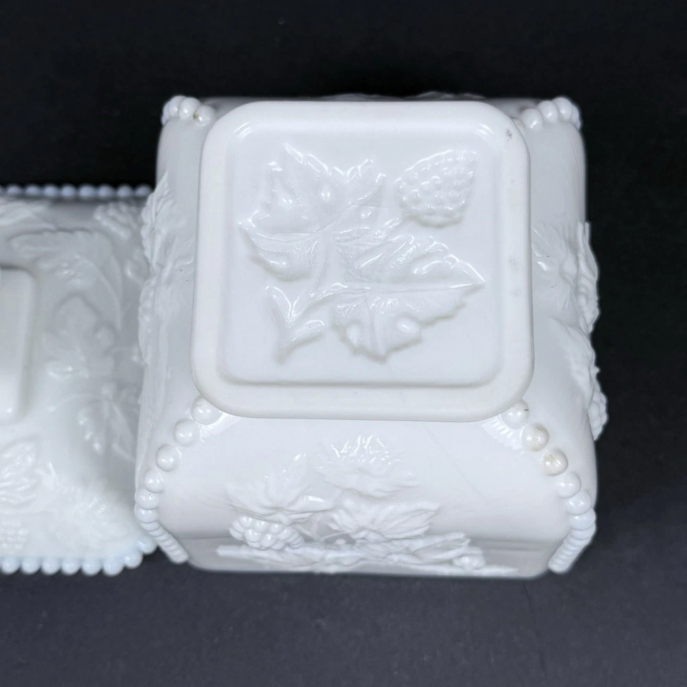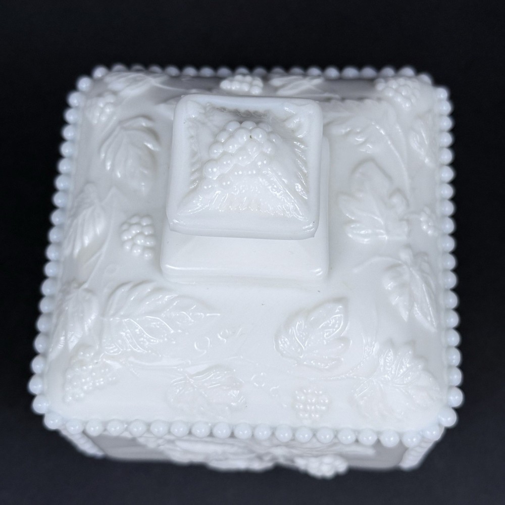 Pattern: Beaded Grape, featuring raised relief grapevine and leaf design Shape: Square with a beaded edge and a lid topped with a grape cluster finial Size: Approximately 5.25 inches tall with the lid on and 3.75 inches square Perfect for candy and a sweet decor down wedding and baby showers and just everyday decor. No chips or cracks. Let me know what questions you have! Blessings to you.. π€π€π€π€π€π€ππ€π€π€