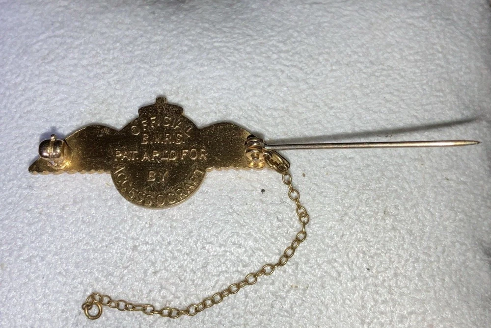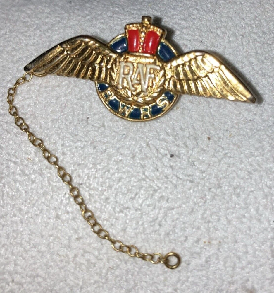 Vintage WWII RAF Pilot Wing PIN British War Relief Society Accessocraft The British War Relief Society (BWRS) played a crucial role during the early years of World War II by providing non-military aid to people in Great Britain . The BWRS, founded in 1939 acted as an umbrella organization coordinating the efforts of various grassroots groups in the United States. Its mission was to supply essential aid such as food, clothing, medical supplies, and financial assistance to the British population during the war. The Royal Air Force (RAF) played a heroic role during the war and i nspired by the RAF’s success, the BWRS produced wing pins that were sold to further the effort. Here is one of those pins. Gold tone metal with blue and red enameling. Back states: Official BWRS Pat. Apld for by Accessocraft. Has a short chain attached with a locking clasp on the pin. Measures about 1 5/8" x 5/8". Has been pre-enjoyed and in very nice condition with no tarnish or color loss. Please feel free to ask questions and take a look at my other items to combine shipments and save on postage cost. Shipping in US only.