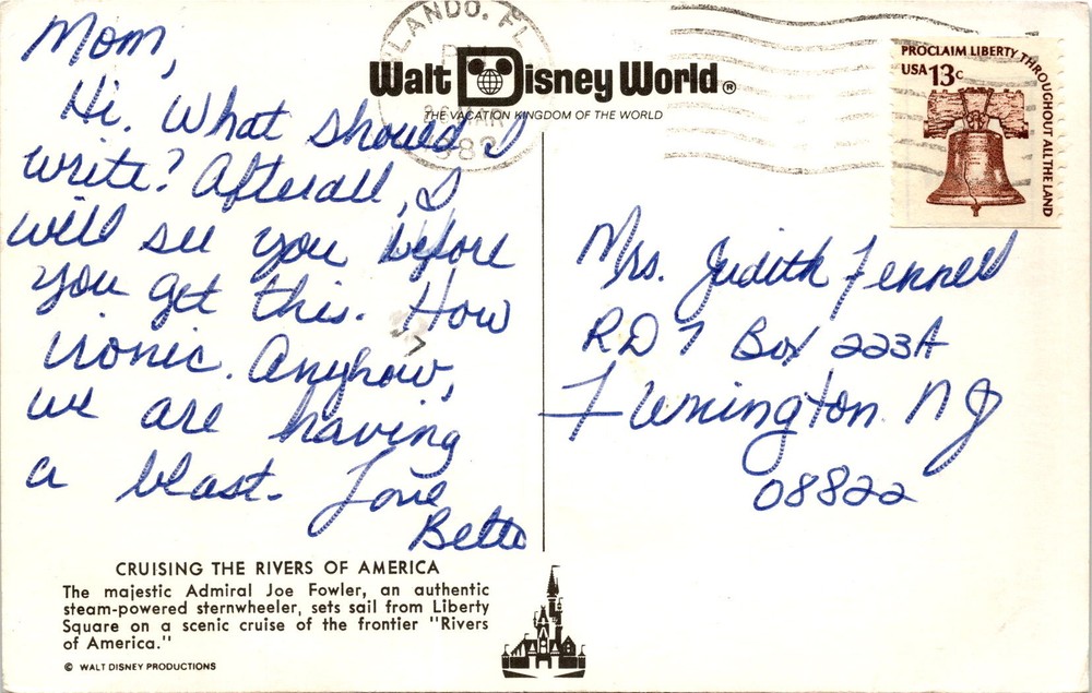MAKE AN OFFER. THE MORE YOU BUY THE BETTER DEAL I WILL ACCEPT The postcard mentions Walt Disney World, known as THE VACATION KINGDOM OF THE WORLD, located in Orlando, Florida. It highlights the experience of cruising the Rivers of America on the steam-powered sternwheeler, the Admiral Joe Fowler, which departs from Liberty Square. The postcard also includes a message to someone named Mrs.