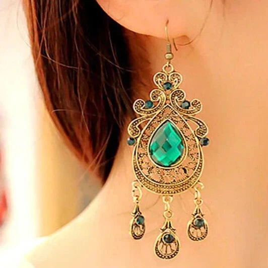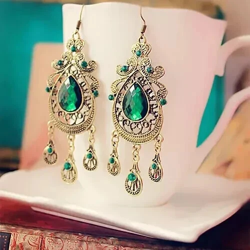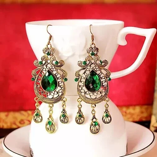 Vintage Water Drop Dangle Green Crystal Earrings • Retro Palace Style Earrings • Long Drop Earrings • Closure: beagle Stone: Crystal Stone color: green Finish: antique gold Size: 93 x 28 mm Specifications: Geometric pattern and multiple irregular shapes, so special and unique. Crystal decored, so charmful and delicate. matching with your dress, skirts, T-shirts and most of your costumes. A very good gift for yourself and someone special. Suitable for going wedding party or banquet. Condition: New and high quality. Package Content:1 Earrings