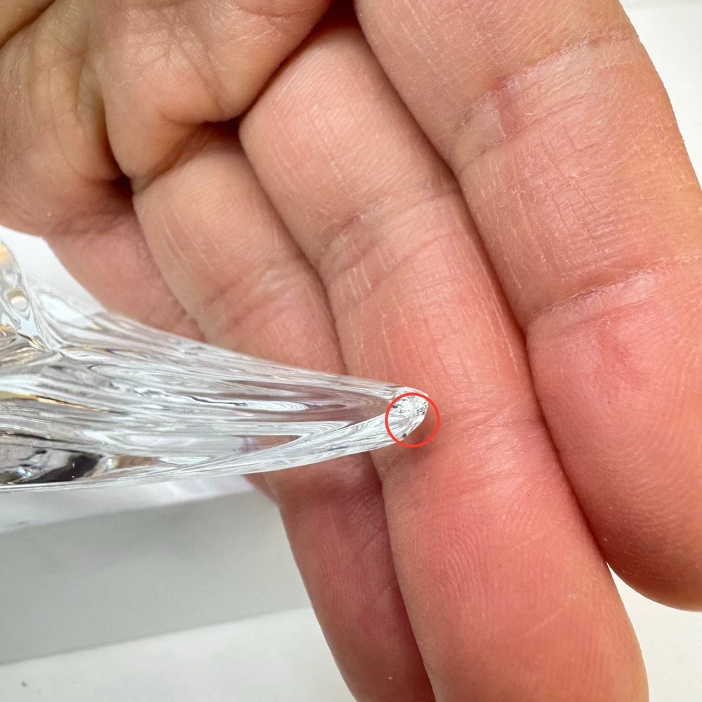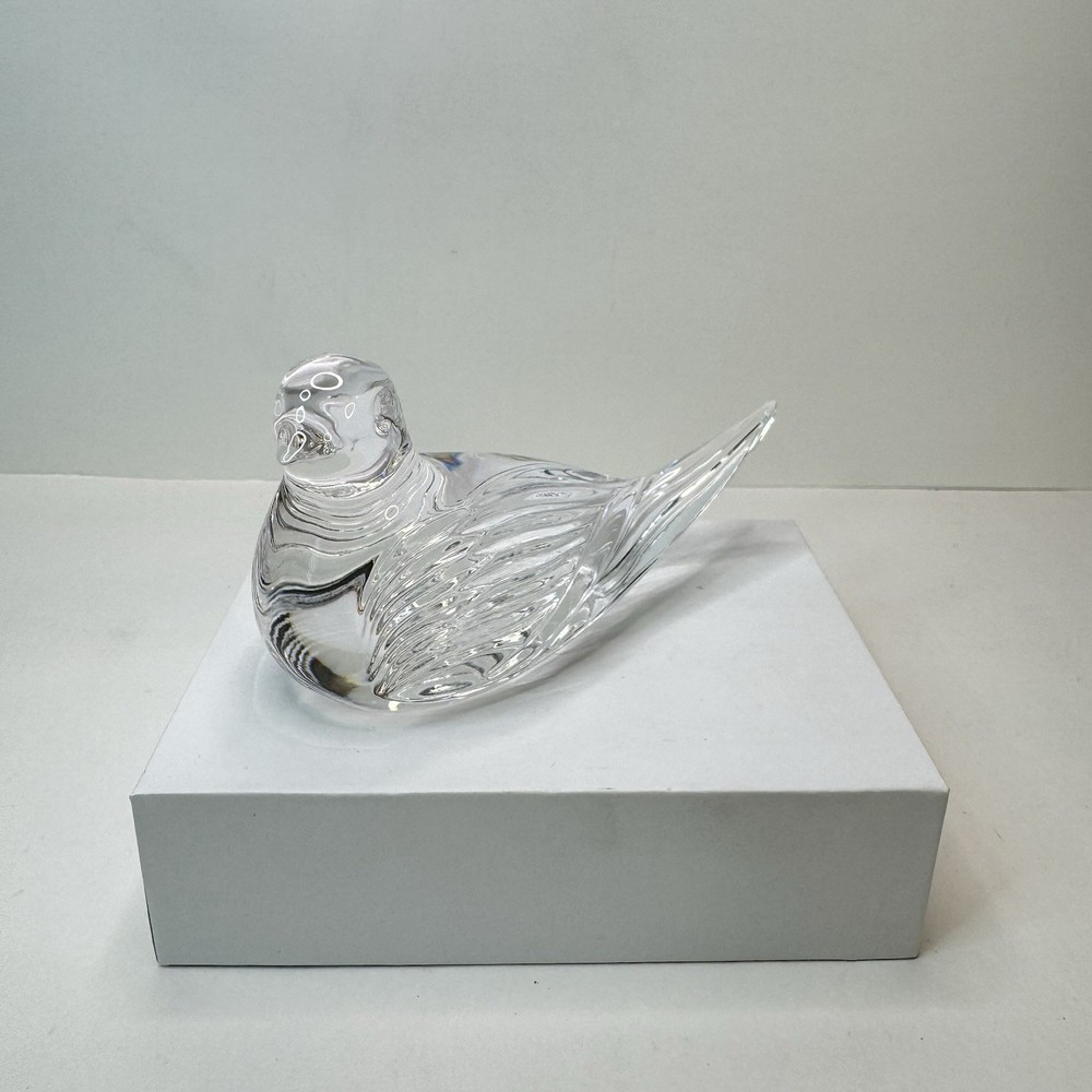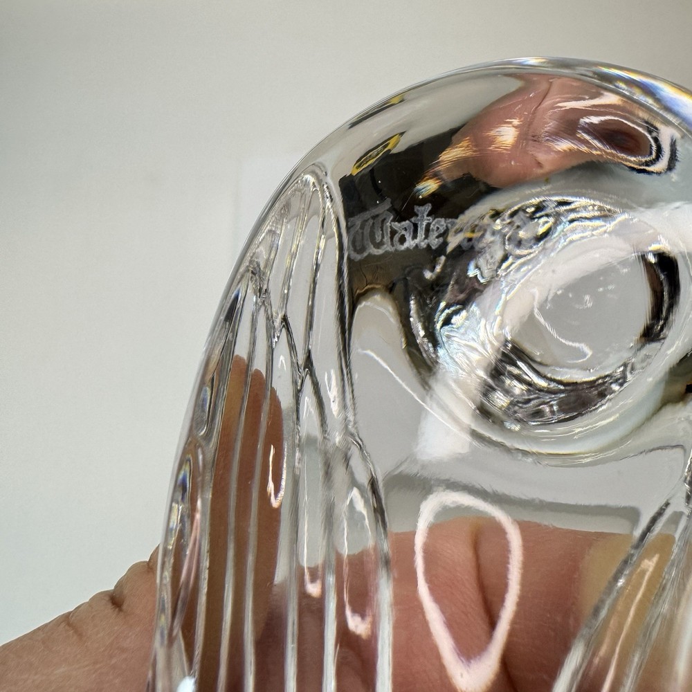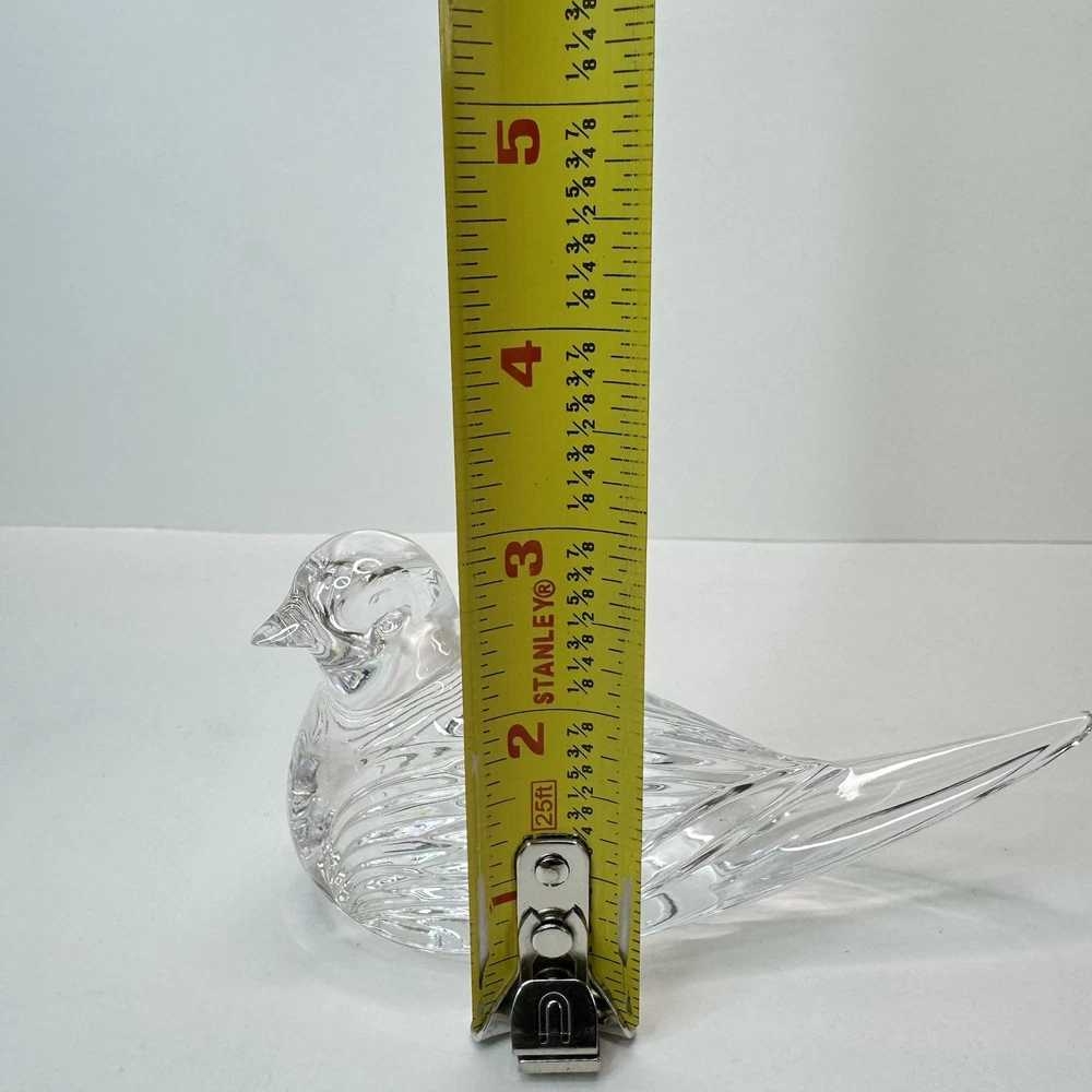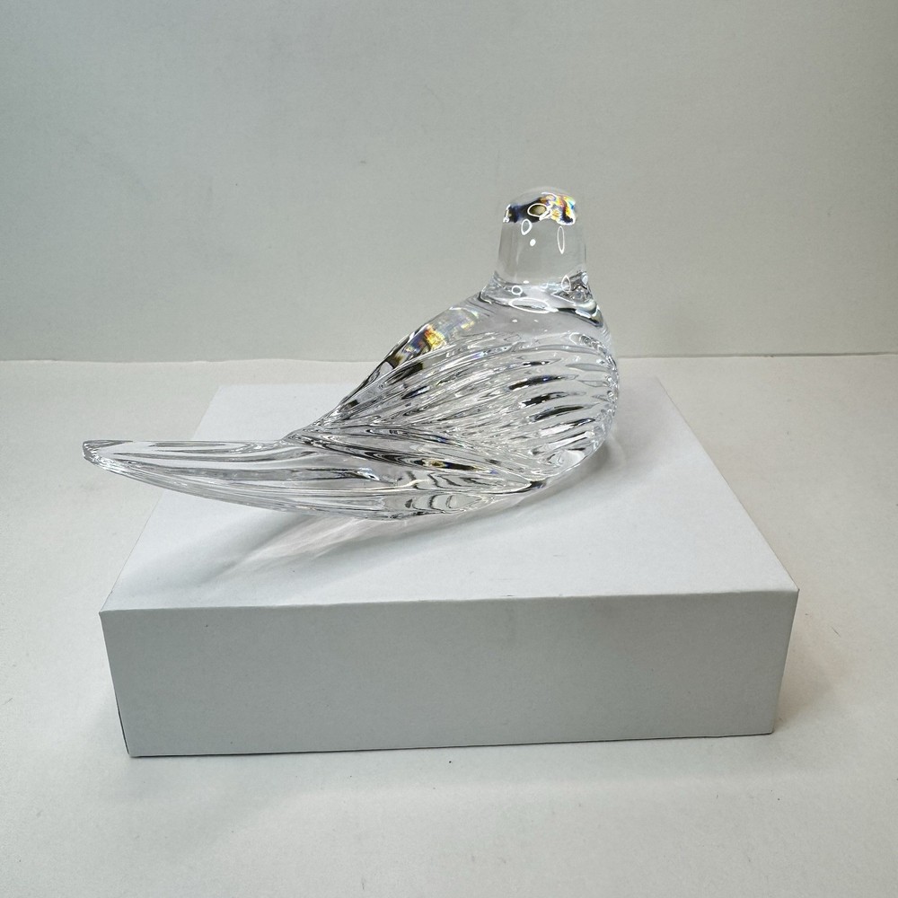 Add a touch of vintage elegance to your desk with this charming Waterford crystal bird paperweight. The intricate detailing and clear crystal material make it a beautiful addition to any collection. The tiny rough edge on the tail is the only flaw, but it doesn't detract from the overall beauty of the piece. This paperweight is perfect for collectors or as a unique gift for someone special. There is a small rough spot at the tip of the tail feather. To my eyes, I can’t see a chip, but can feel roughness when the rest is smooth. Please see photos for details.