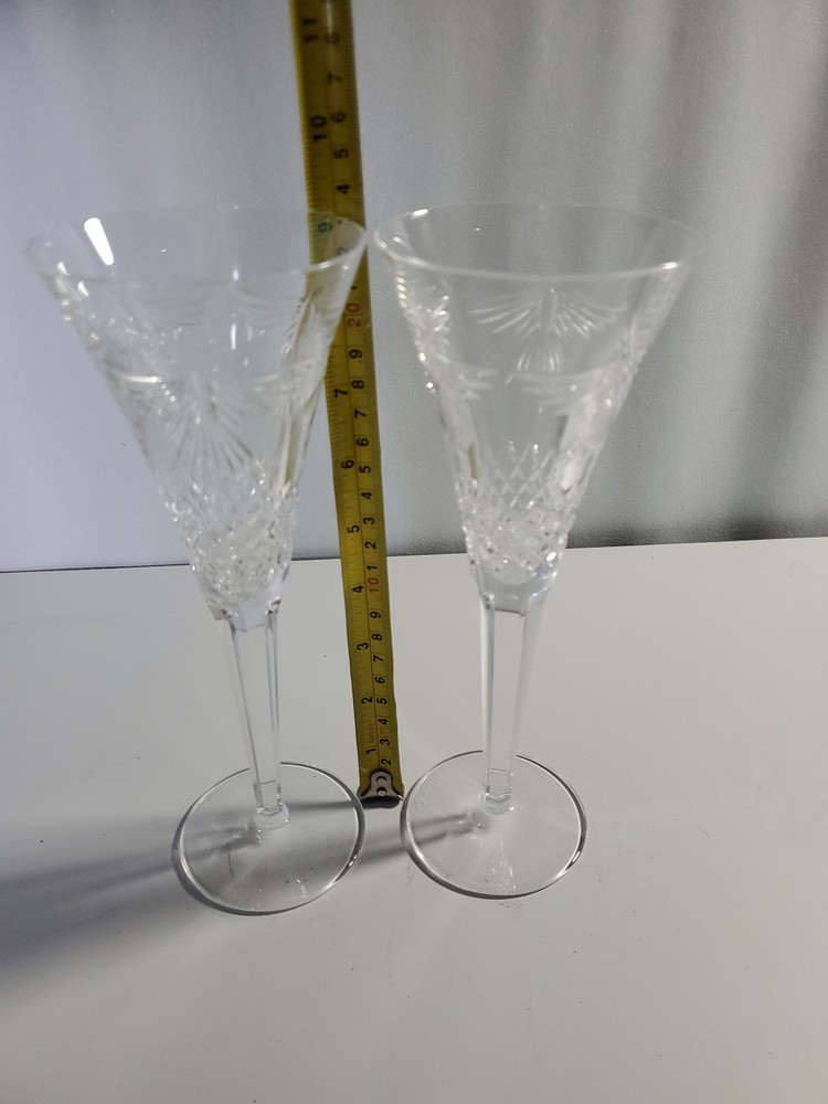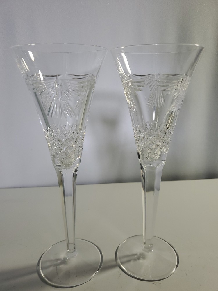 This product is a set of two champagne flutes made of crystal glass. The flutes are decorated with a Busbic pattern and have a round shape. They are suitable for all occasions and are signed by the manufacturer. The flutes are vintage and have a glossy finish. They measure 2'8 in height and weigh 2.2 lb. The production style is art glass and the flutes are handmade.