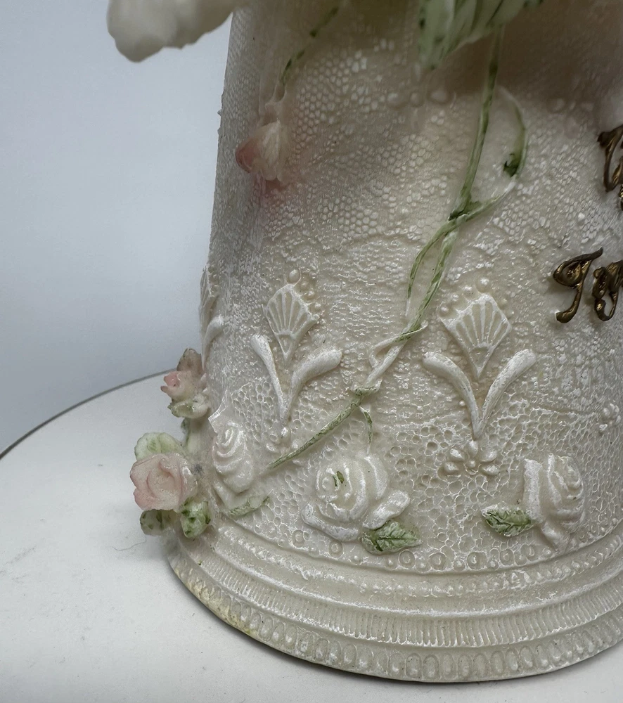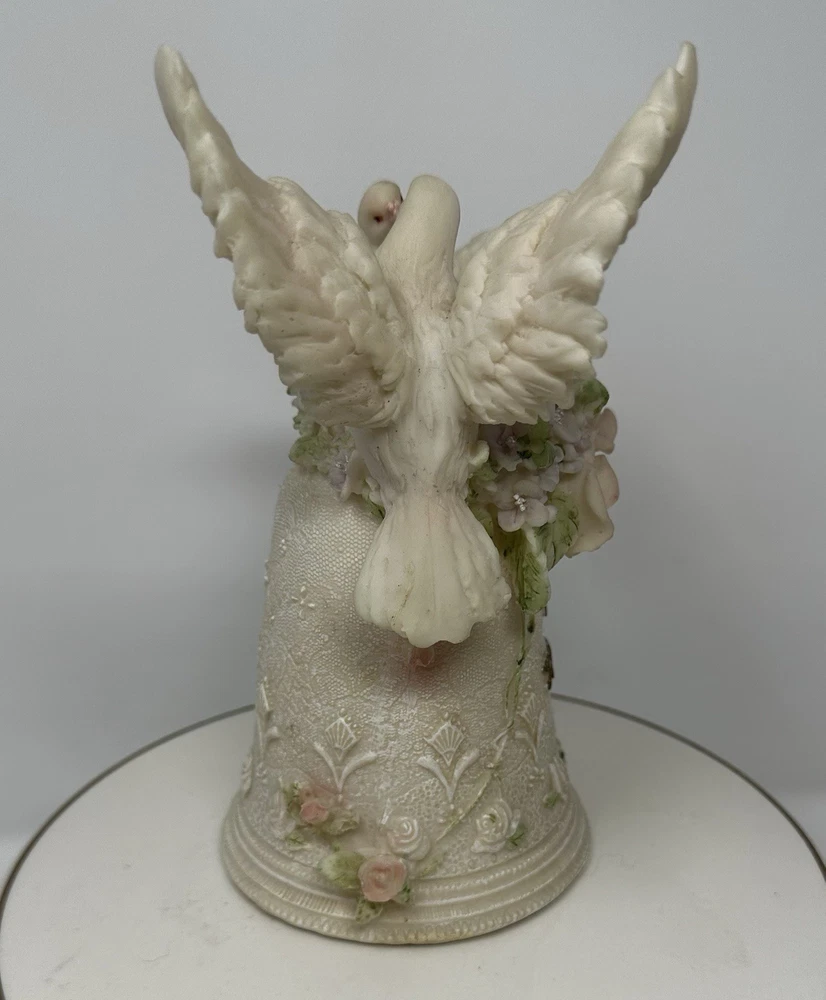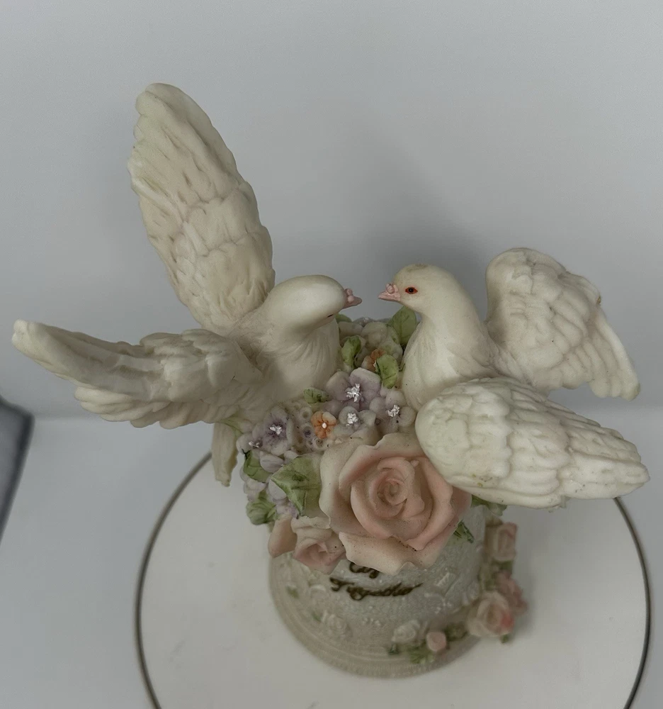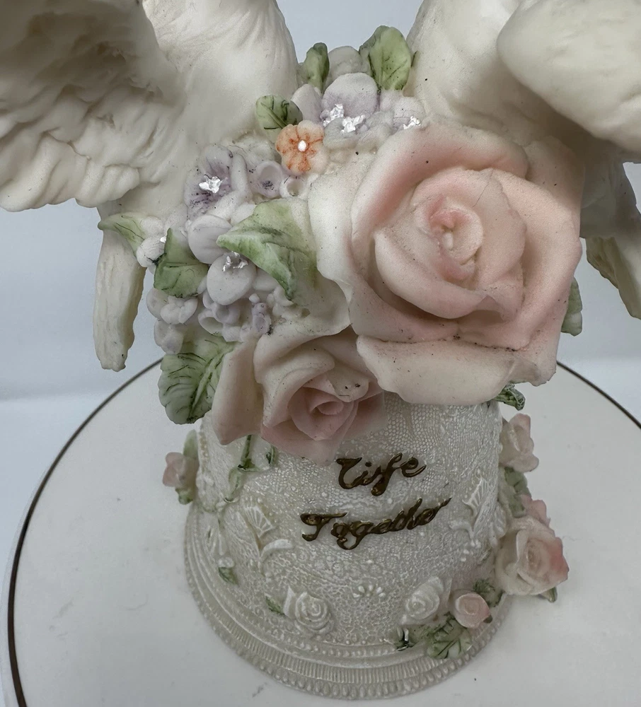 Embellish your wedding décor with a touch of timeless beauty from the Vintage Wedding Elegance Collection. This exquisite cake topper/ décor piece features a stunning arrangement of white dome with pink roses and white doves, meticulously crafted from resin to capture the essence of Roman style. The subtle interplay of pink and white hues creates an enchanting ambiance that will elevate the aesthetic of your special day. Crafted with care, this original MRH piece, dating back to the 1970’s, stands as a testament to the artistry of its era. Whether it's adorning your cake or serving as a decorative element, this piece is sure to leave a lasting impression. Estate sale, item is in excellent pre owned condition with no chips or cracks.